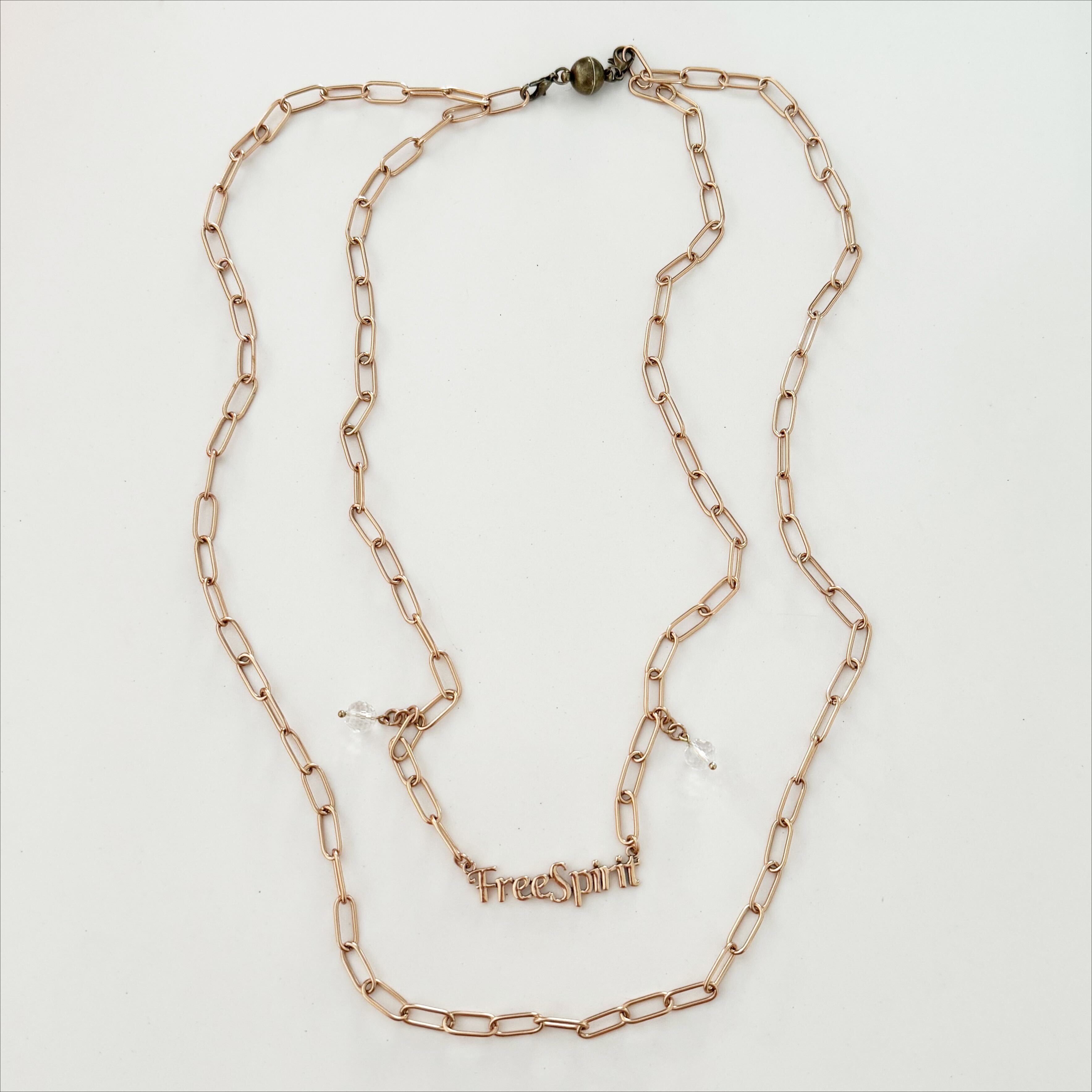 Long Chain: 50" plated brass paperclip chain in gold finish with crystal quartz
