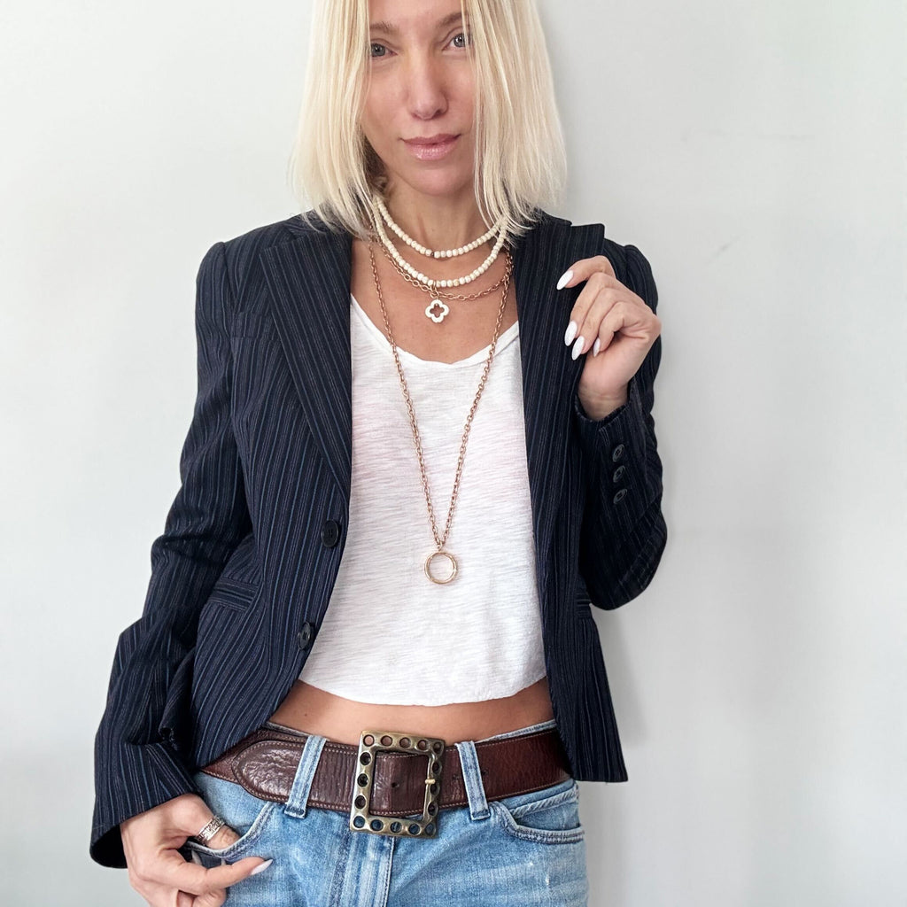 Essential Necklace Length: 48" **MODELS NECK MEASURES 15" IN CIRCUMFERENCE. PLEASE NOTE THAT NECKLACES MAY LAY DIFFERENTLY BASED ON YOUR MEASUREMENTS**