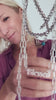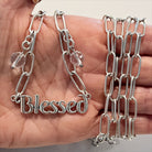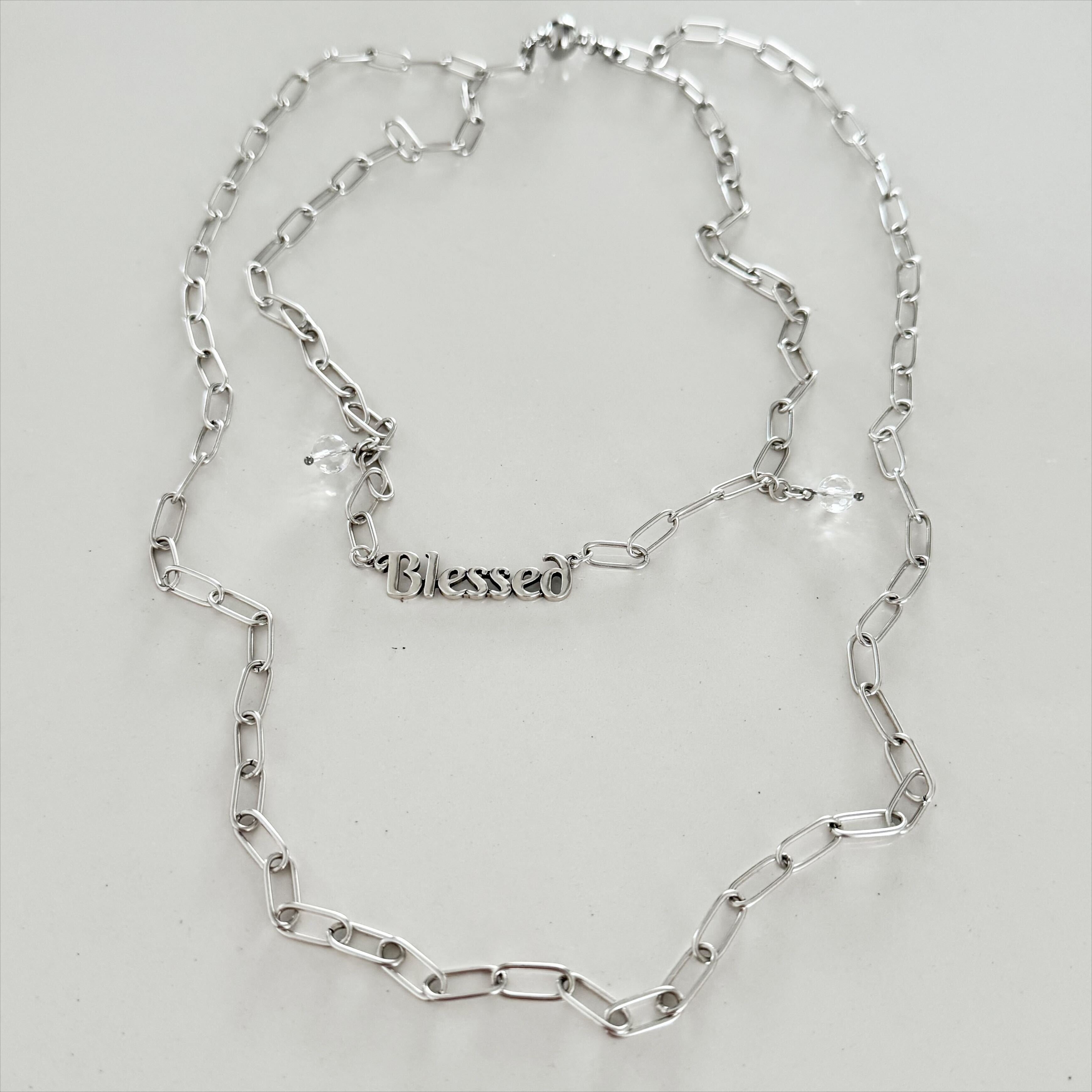 Blessed Long Chain: 50" plated brass paperclip chain in silver finish with crystal quartz