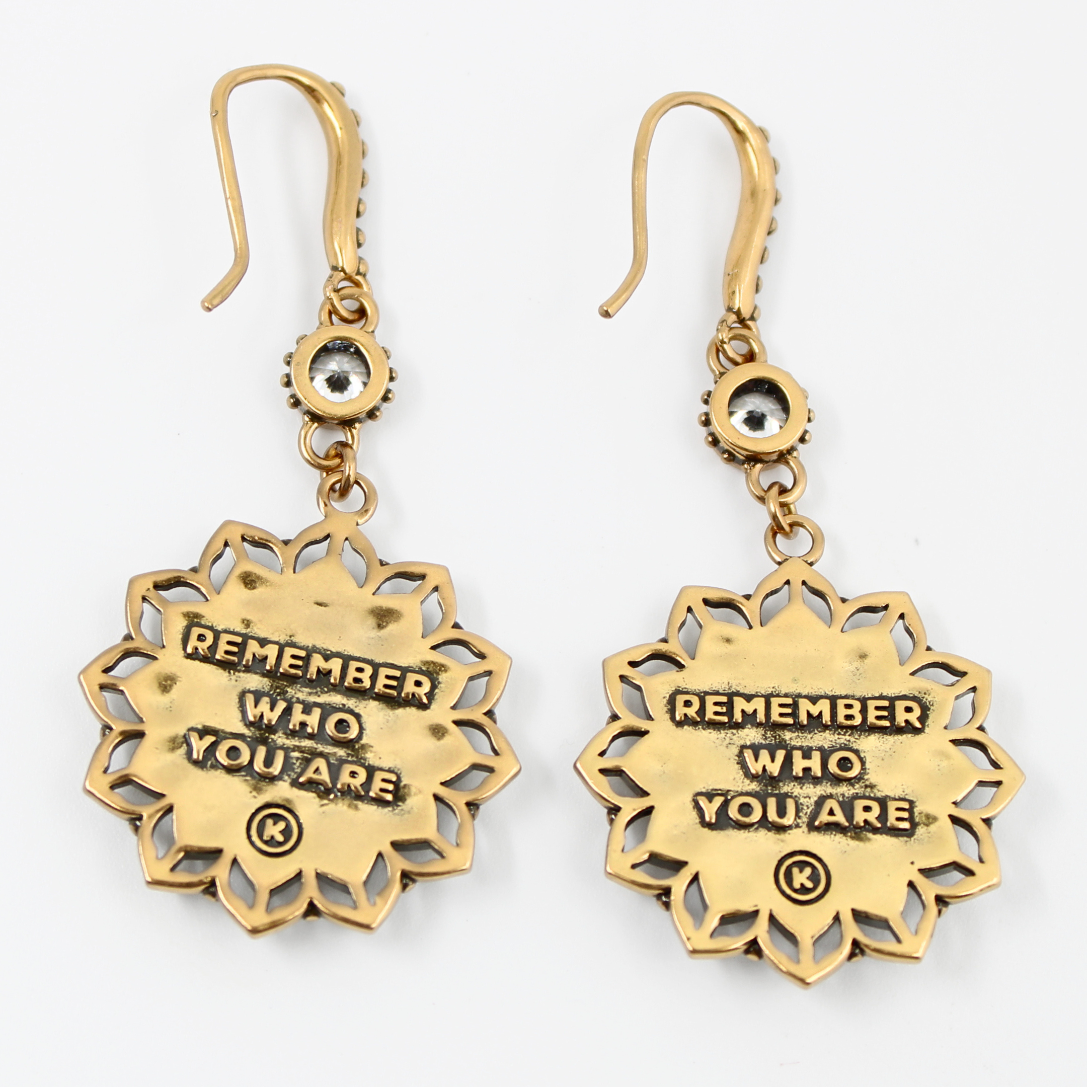 Silver earrings with 'Remember Who You Are' inscription on a white background