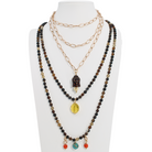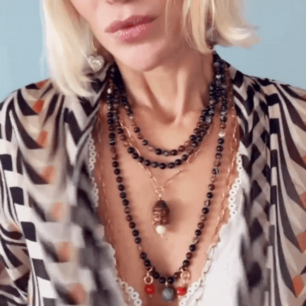 Grounded yet elevated, this duo layers bold texture with mindful detail. Striped agate beads  accented with a luminous yellow crystal drop and colorful Jasper and Magnesite stones for balance and harmony, while a hand-carved Buddha bead centerpiece with white açaí seed adorn our antique gold paperclip chain. Paired together or worn solo, this set blends spiritual energy with everyday style.