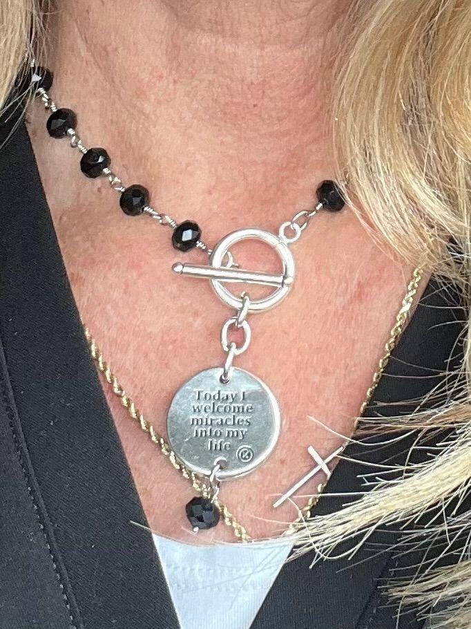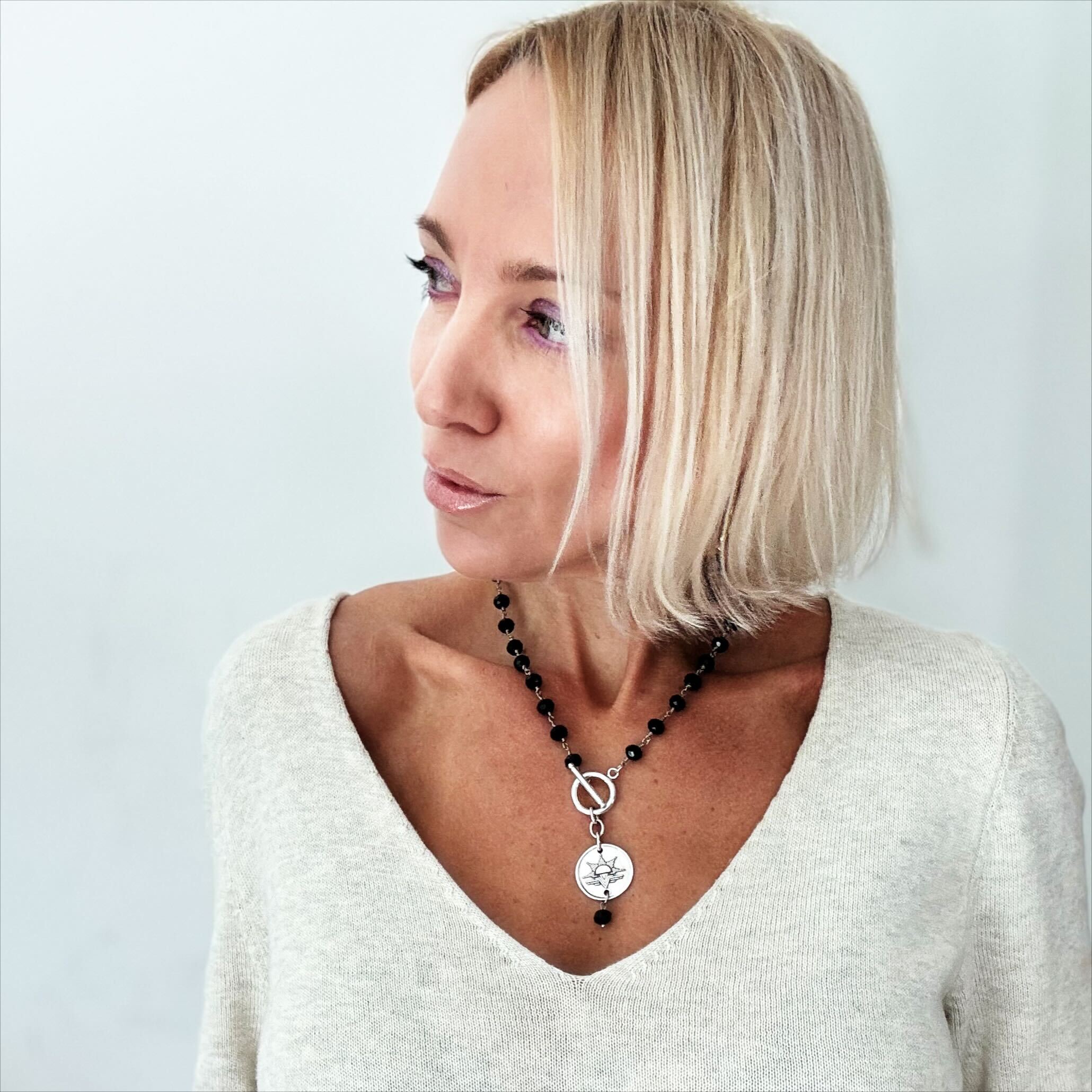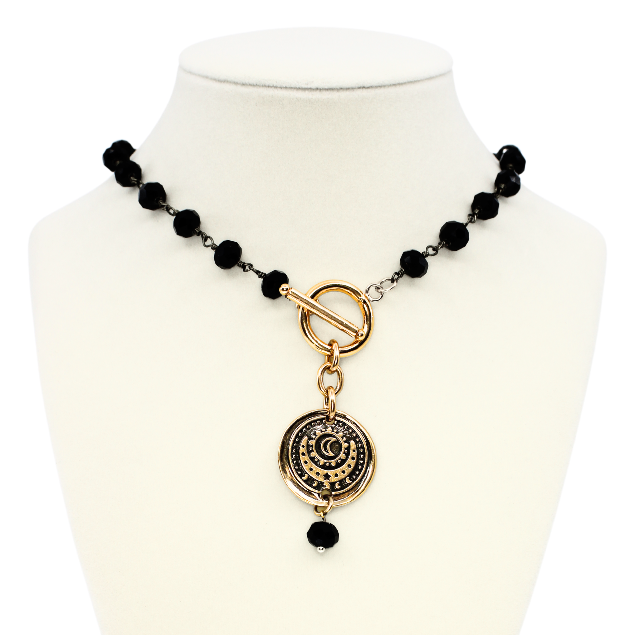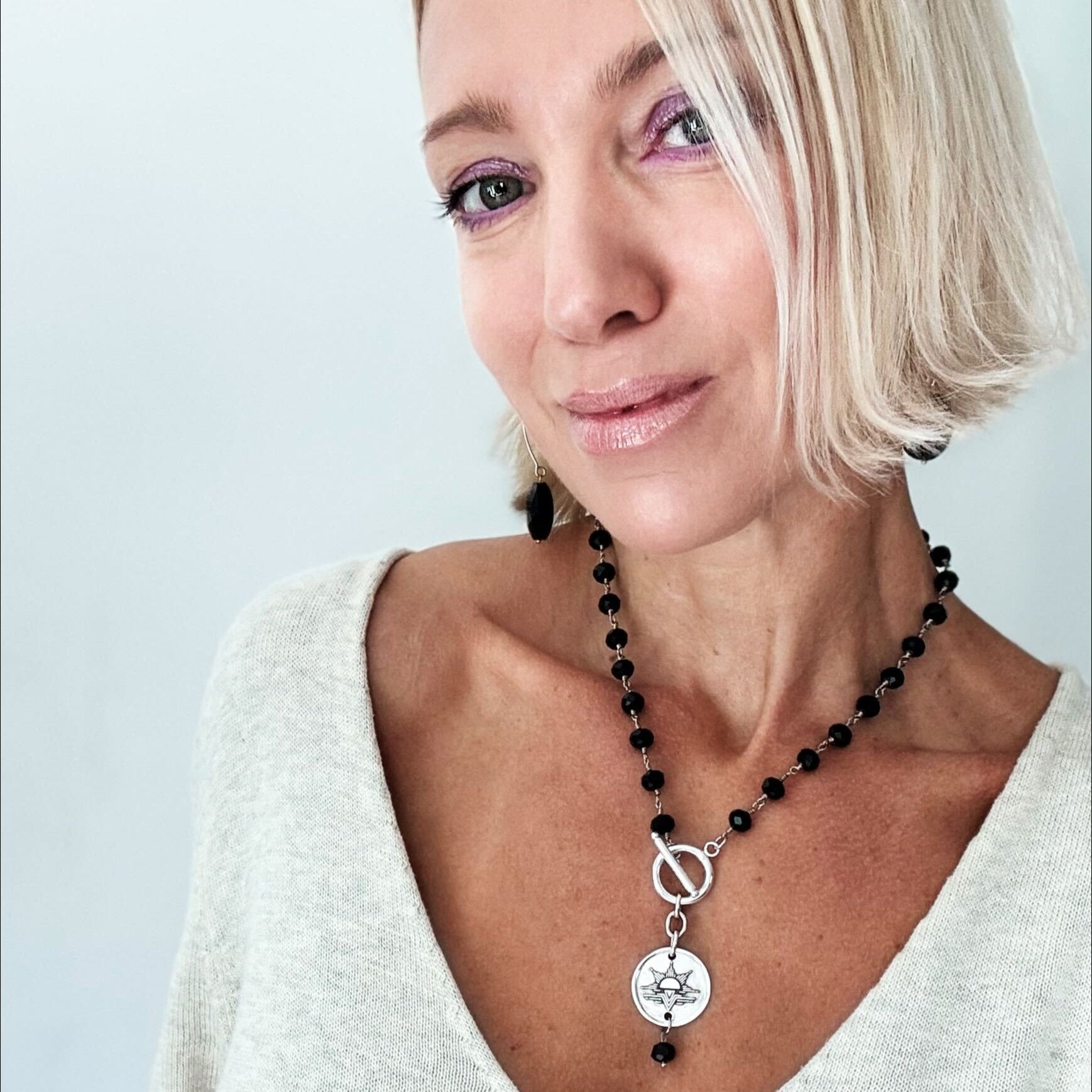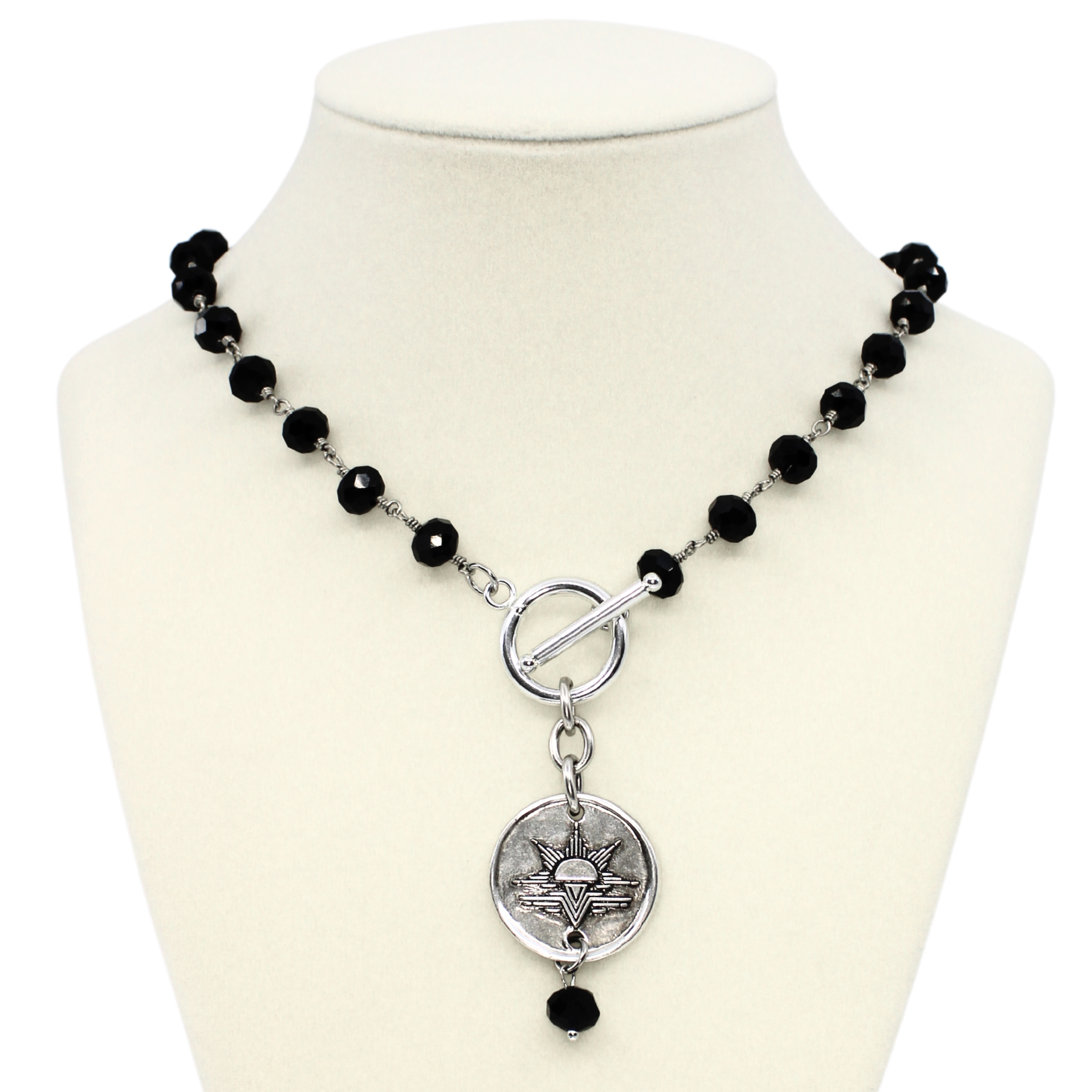 - 8mm faceted shiny black crystal rosary choker with your choice of pendant