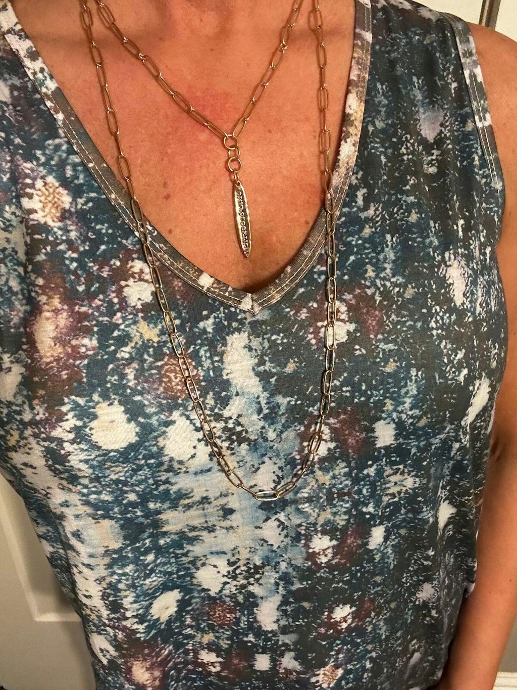 - Chain: 46” Plated brass paperclip