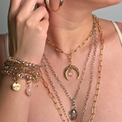 The Go With Grace Quad Gift-Set brings together four meaningful pieces designed to support ease, trust, and emotional grounding. The All Is Well Clover Original Lite Necklace anchors the set with a mixed-metal clover pendant and faceted smoky crystal accent — a quiet reminder to allow life to unfold. Layered with the Grateful Crescent Moon Klink Necklace, this pairing carries gratitude and presence through every phase. The Blessed Guided Loved Hoops offer a hidden mantra within their curve, shining with soft golden warmth. Completing the look, the Love Heart Crystal Boho Wrap adds tenderness and radiance through faceted crystal beads and a golden love pendant.