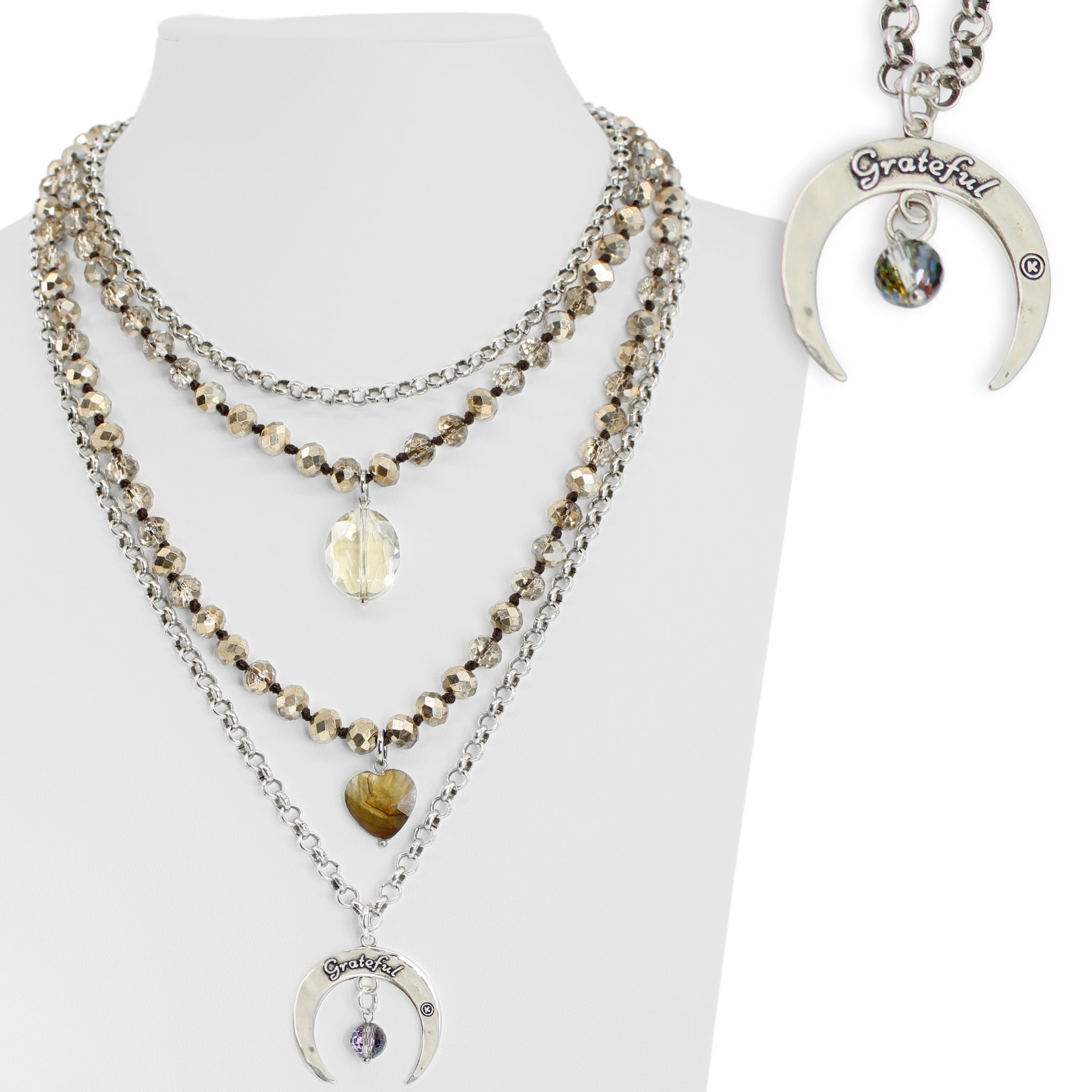 Wrap yourself in light, love, and a reminder to be Grateful. This stunning layering bundle set combines shimmering faceted crystals, warm golden copper tones, and meaningful accents for a look that radiates from within. Adorned with a golden Tiger’s Eye heart for grounding energy, and a timeless rollo chain that anchors the look in effortless elegance. Perfect for gifting or elevating your everyday style. 💛