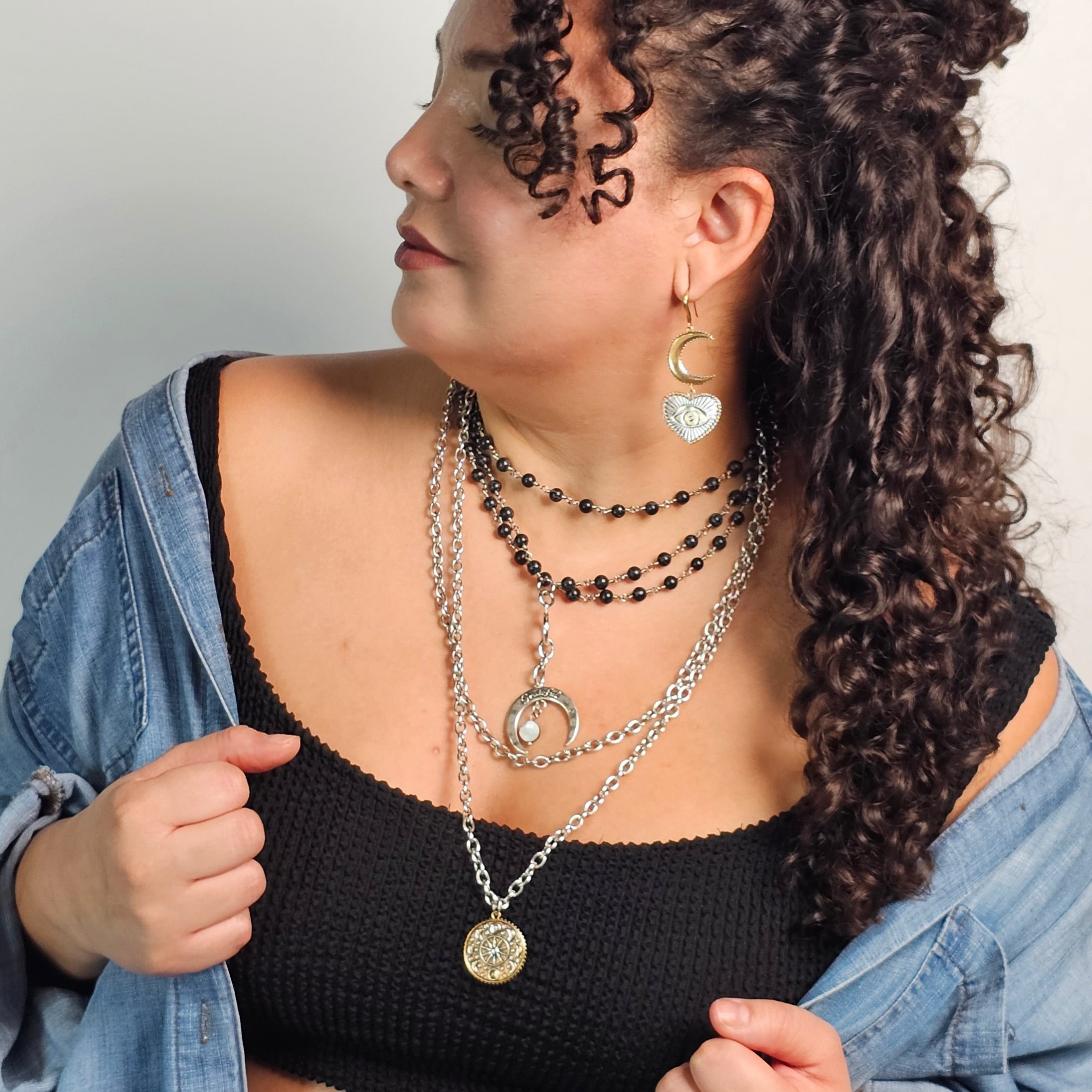 The Grateful Trust II Trio Gift-Set embodies strength, protection, and inner peace. The Grateful Crescent Moon Rosary Necklace features deep black crackle howlite beads and a faceted black lip pearl, anchored by a crescent pendant engraved with “Grateful.” A reminder that even in darkness, there’s light. The Trust Moon Phase Essential Necklace complements it with a circular mixed-metal pendant etched with “Trust” on the reverse; an emblem of faith through every phase of life. Completing the ensemble, the Trust Moon & All-Seeing Eye Heart Drop Earrings bring celestial harmony, combining moon, heart, and eye motifs for insight and balance.