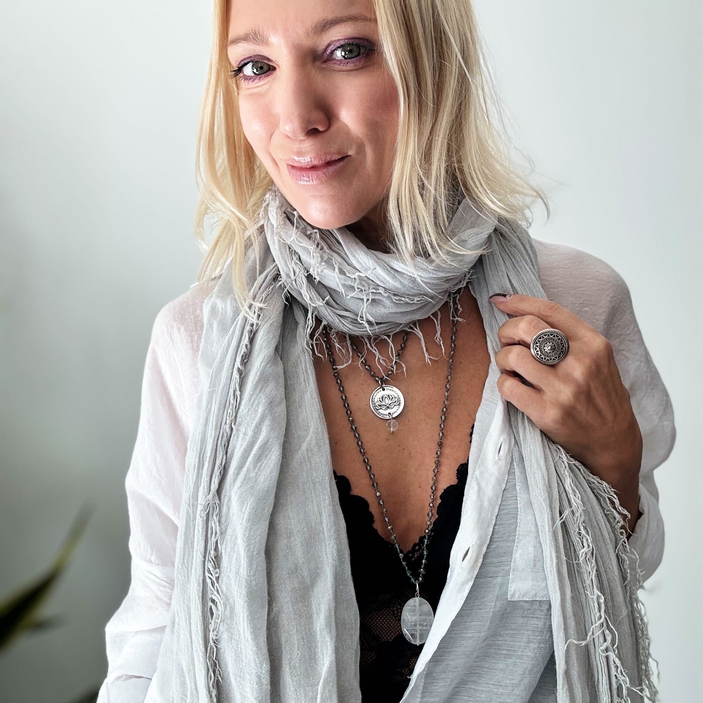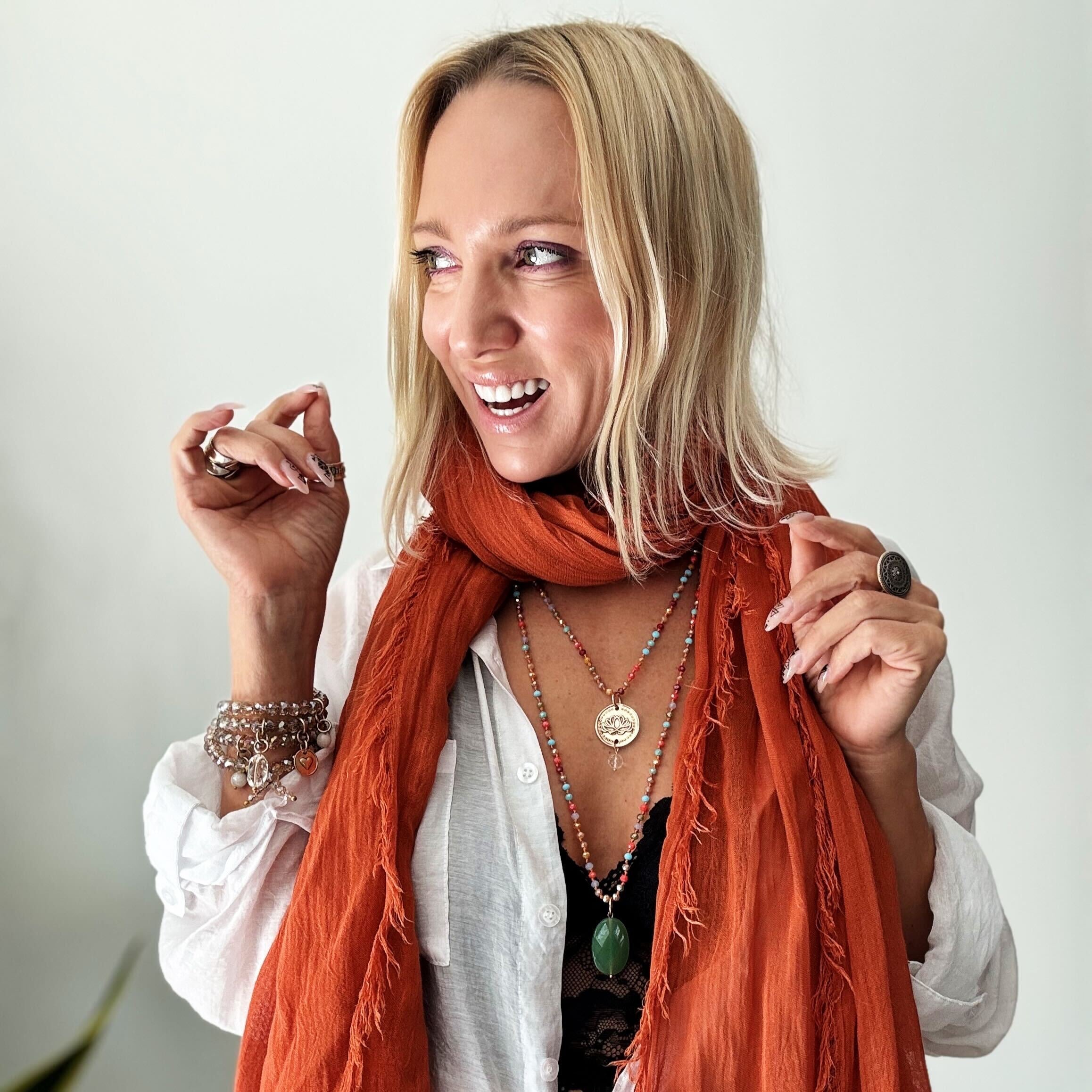 Original Necklace Full Length: 44-50" **MODELS NECK MEASURES 15" IN CIRCUMFERENCE. PLEASE NOTE THAT NECKLACES MAY LAY DIFFERENTLY BASED ON YOUR MEASUREMENTS**