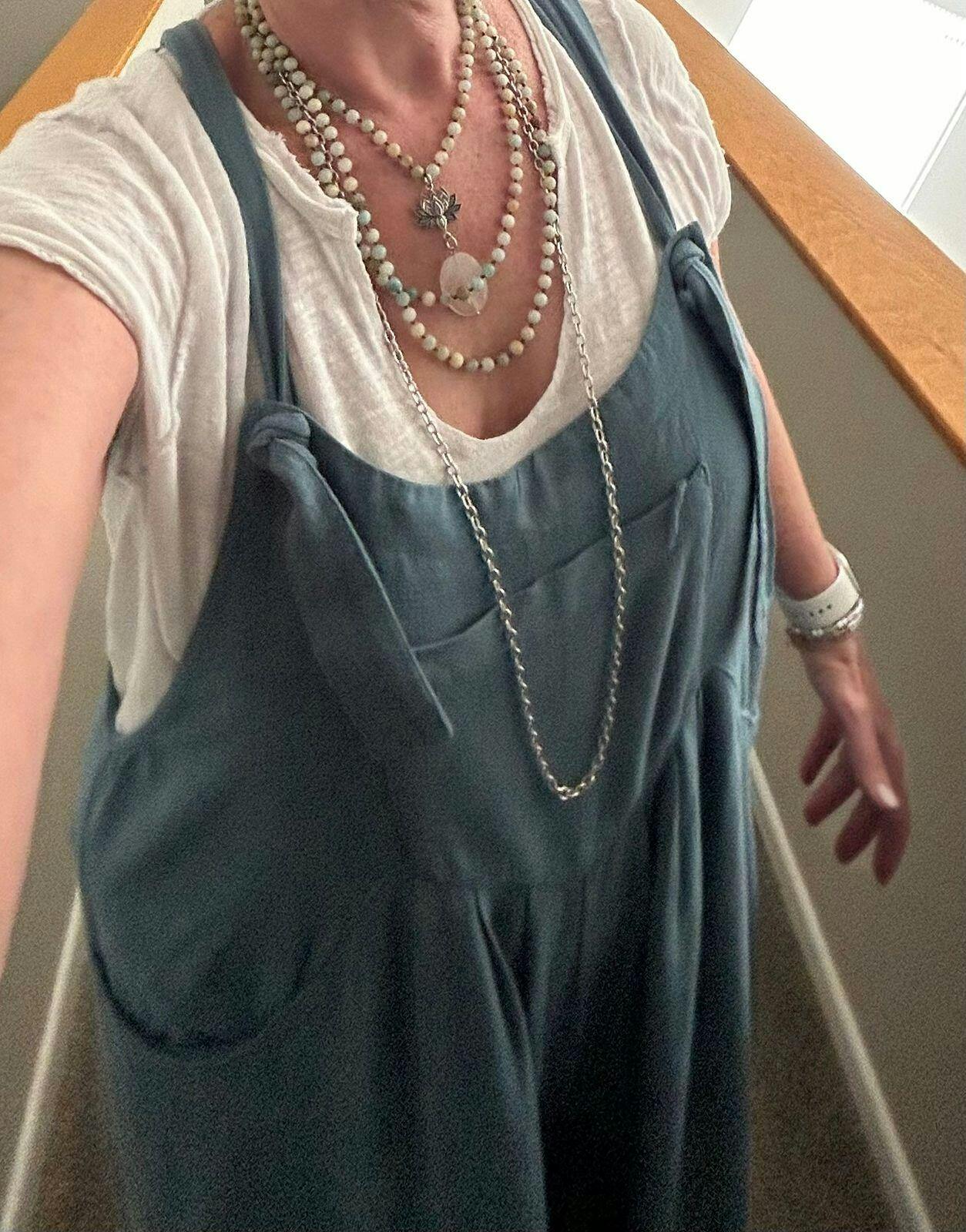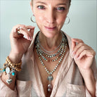 Long Fusion Full Length: 55-62" **MODELS NECK MEASURES 15" IN CIRCUMFERENCE. PLEASE NOTE THAT NECKLACES MAY LAY DIFFERENTLY BASED ON YOUR MEASUREMENTS**