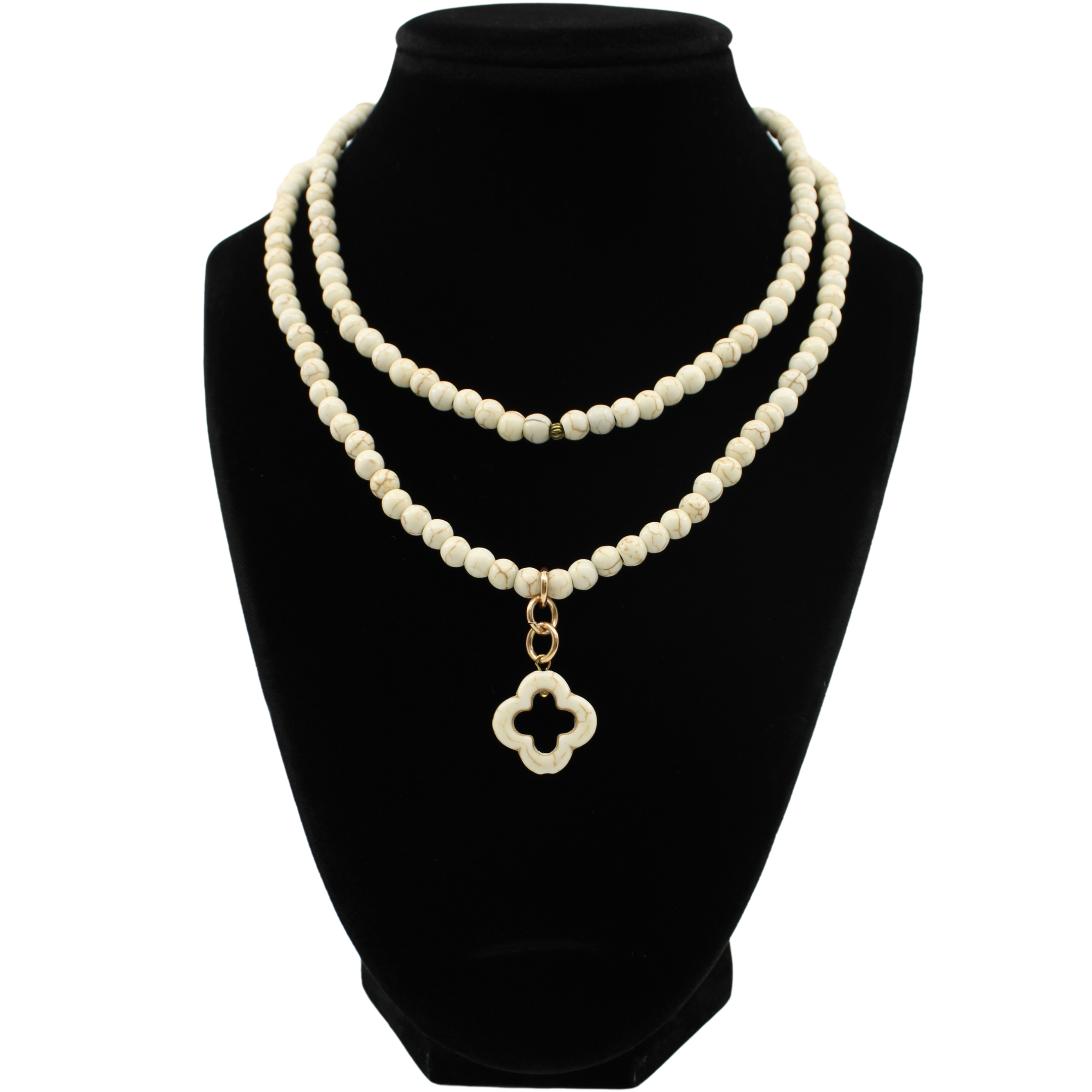 6mm howlite bead wrap bracelet featuring a howlite clover and 2 accent stones. Comes with a magnetic clasp that allows you to also wear as a necklace.