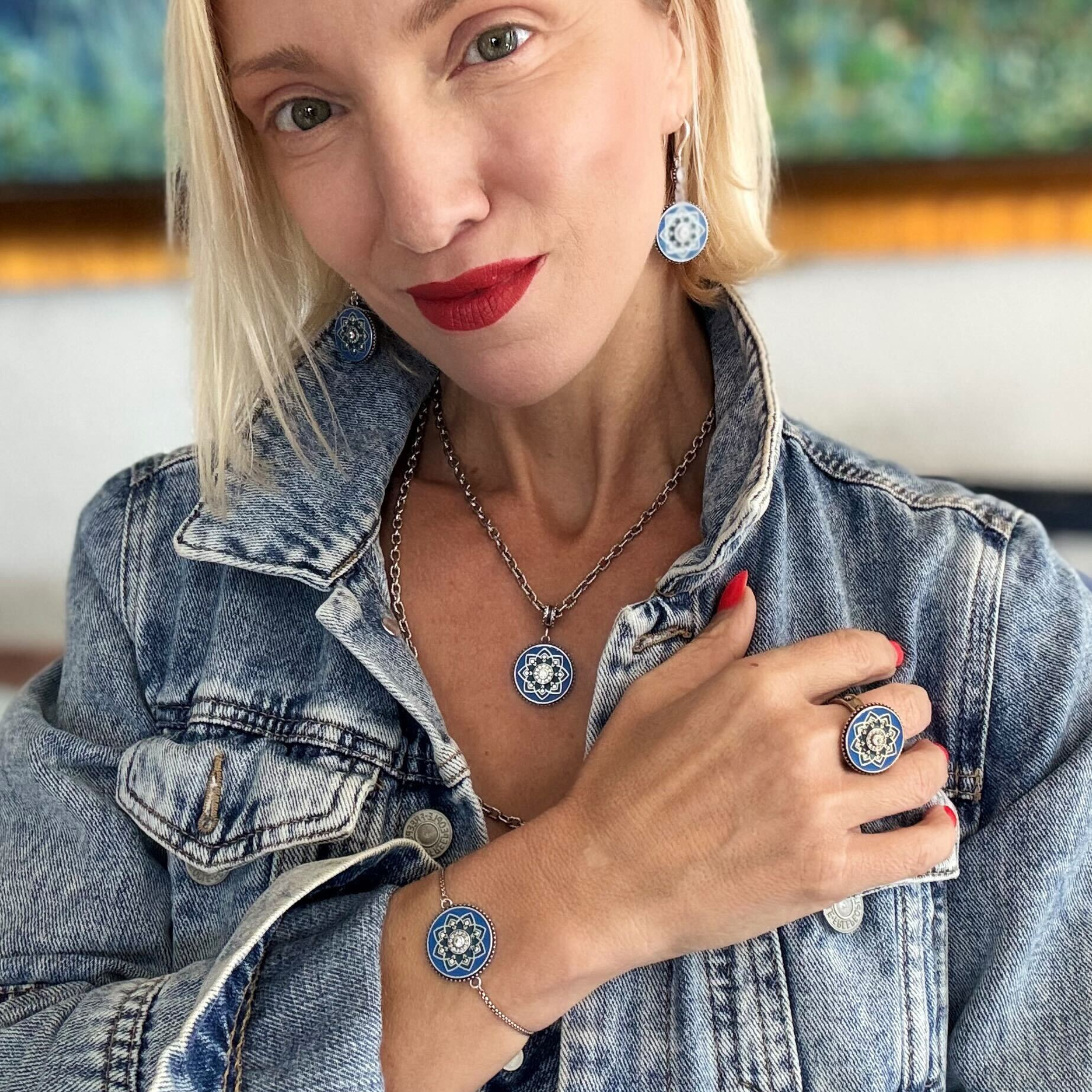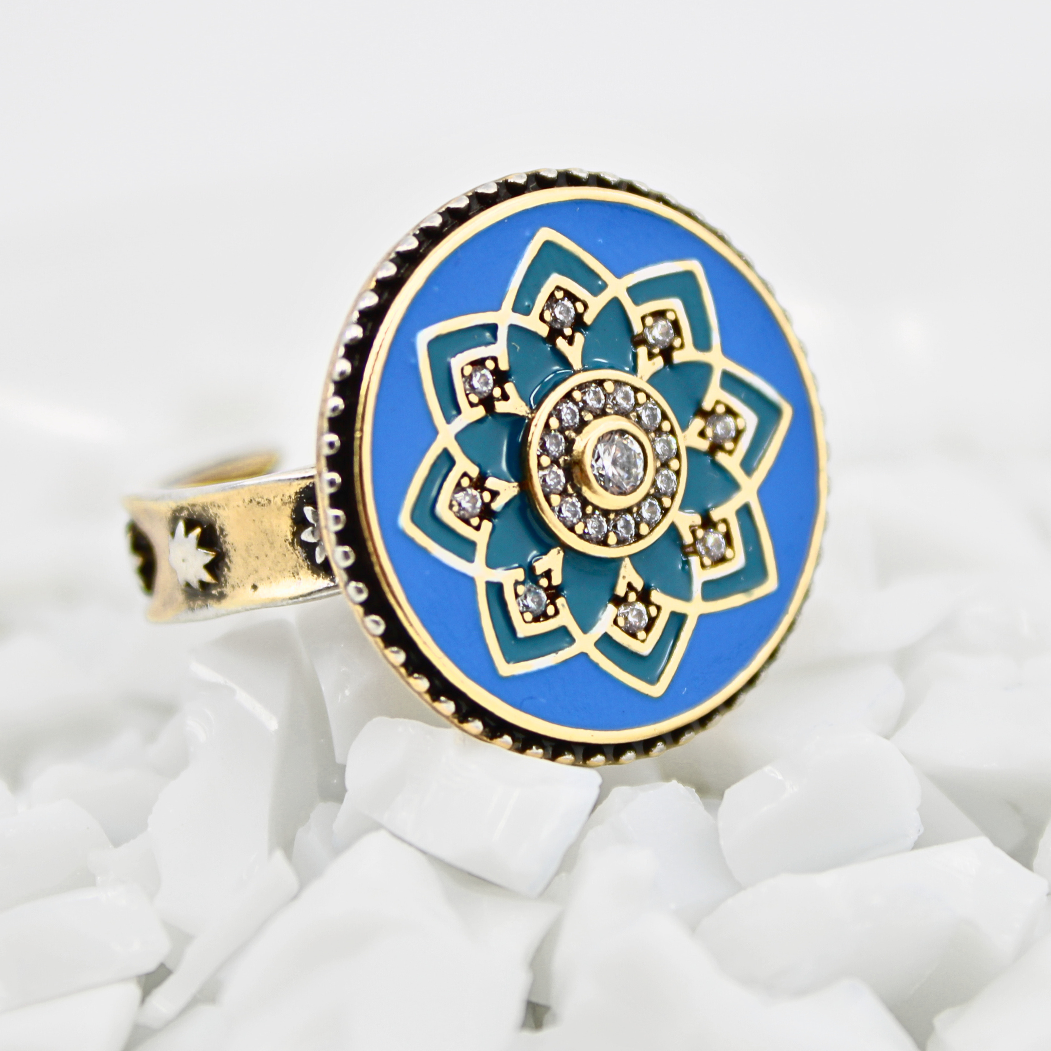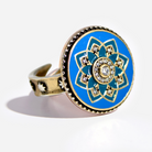 This mix-metal adjustable cocktail ring showcases a circular mandala design with radiant blue enameling and sparkling crystal inlay. Inside the band, the affirmation âI Am Enoughâ is delicately inscribed â a secret boost of confidence youâll carry with you everywhere.