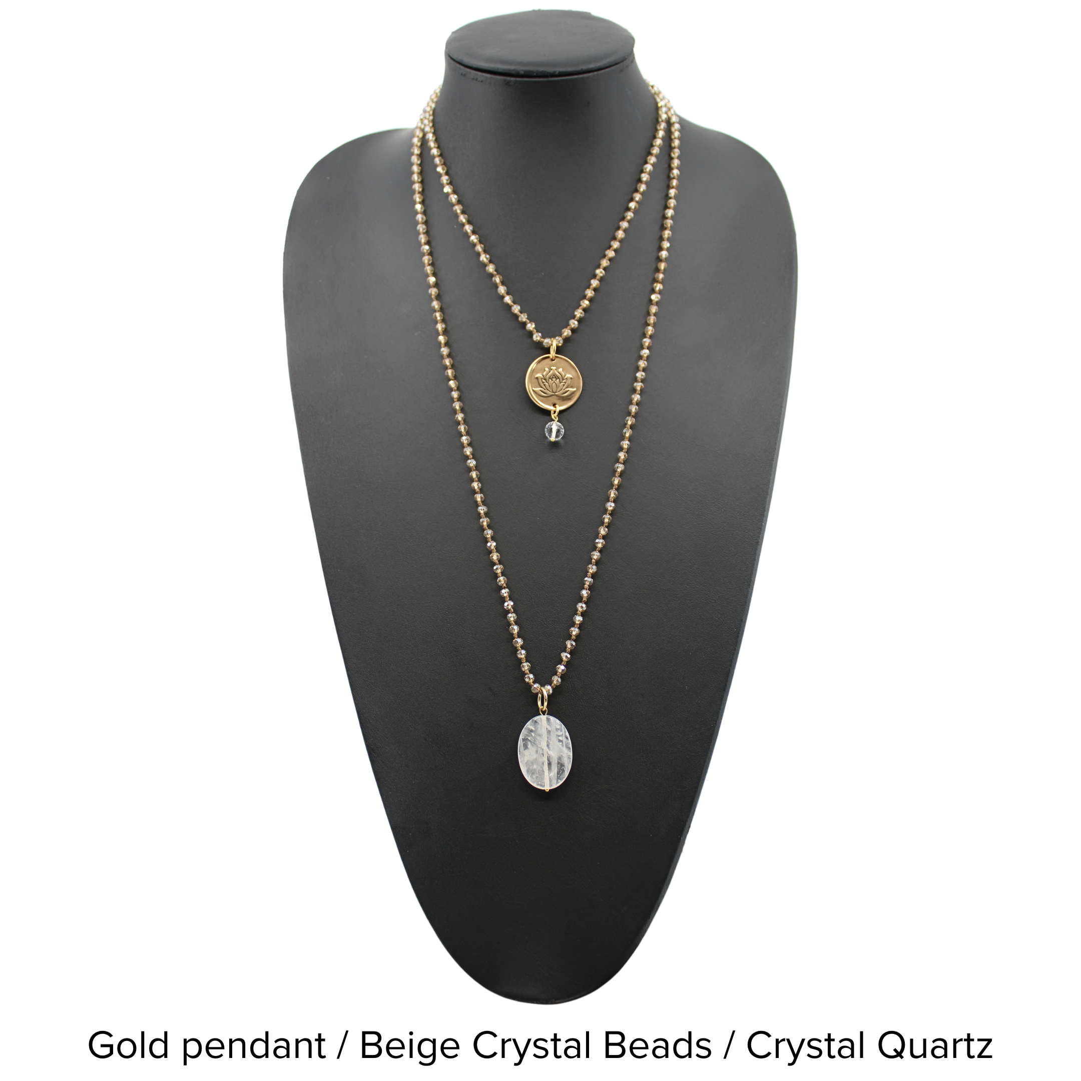 - Beads: 4mm matte black or crystal on knotted silk