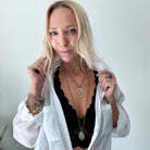Original Necklace Full Length: 44-50" **MODELS NECK MEASURES 15" IN CIRCUMFERENCE. PLEASE NOTE THAT NECKLACES MAY LAY DIFFERENTLY BASED ON YOUR MEASUREMENTS**
