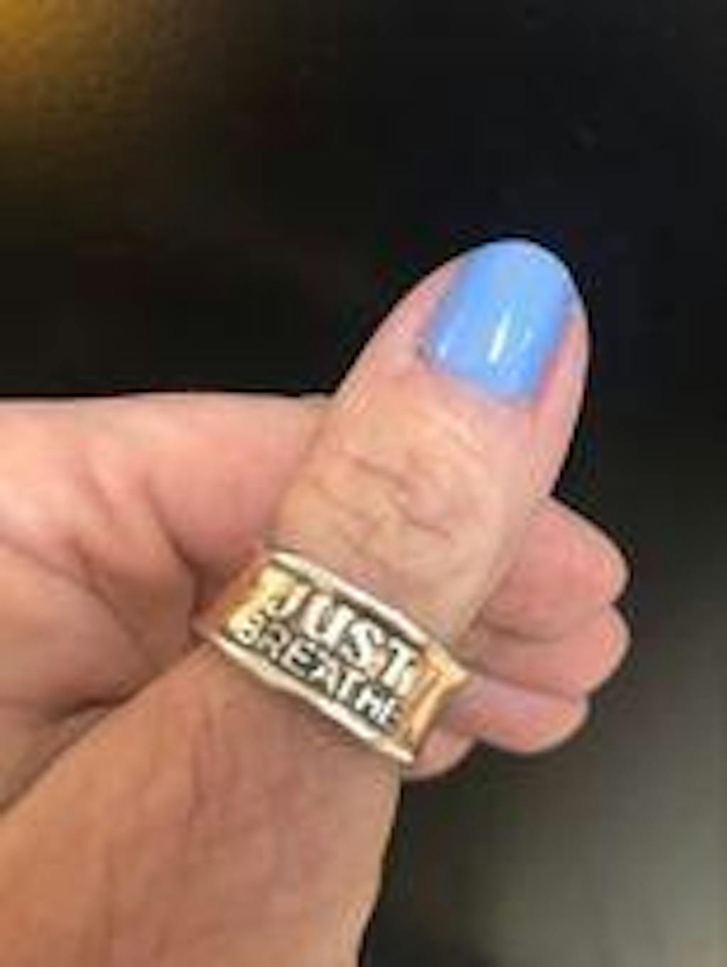 The Remember Ring was created from a prototype designed during the beginning years of Katia Designs. Wearing the ring on her thumb (although you can wear it on any finger you'd prefer) she would catch a glimpse of the message as her hands rested on the steering wheel while she was driving. It was a moment for her to take a breath and remember those simple words she chose for herself.