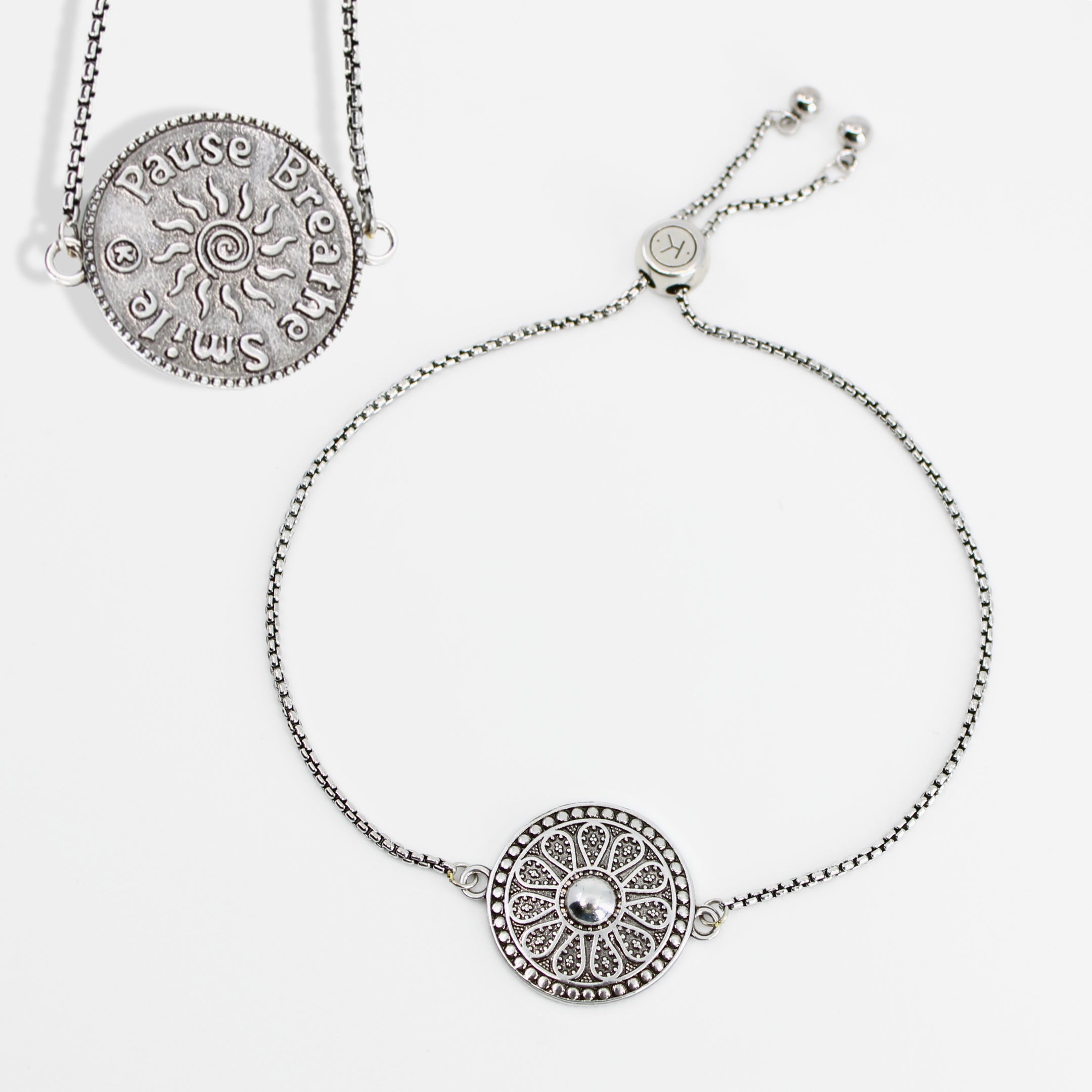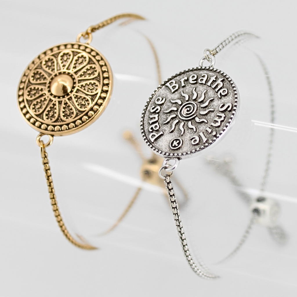 This radiant bracelet features a mandala-inspired sunburst design on the front, and the words Pause. Breathe. Smile. engraved on the back—a gentle nudge to slow down and find joy in the moment. ✨ Your daily dose of calm—wrapped around your wrist.