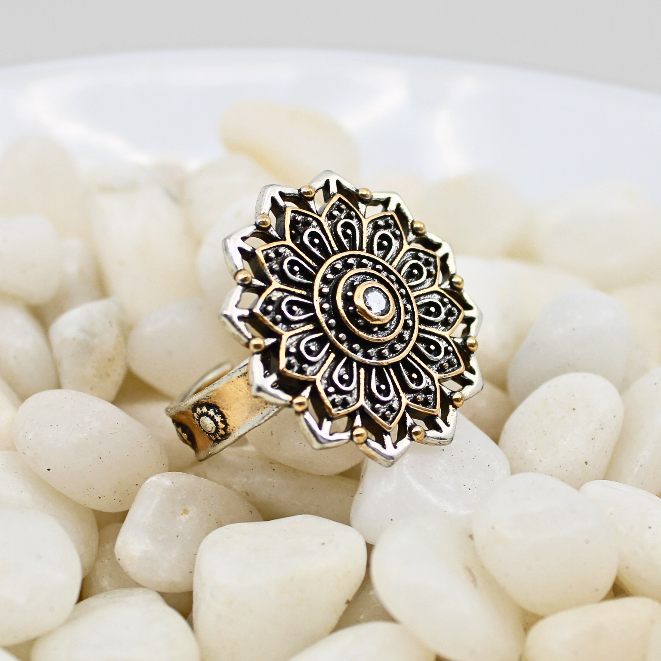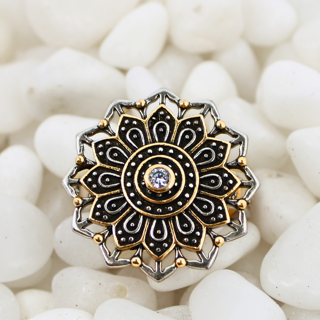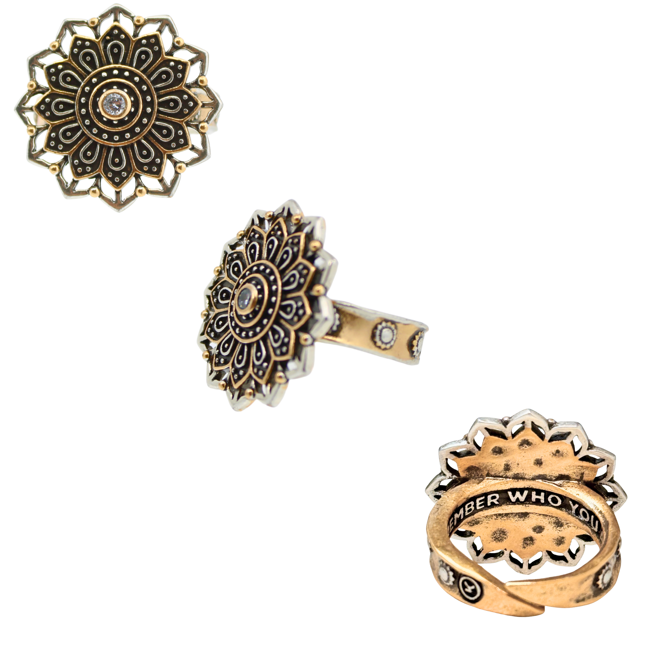A statement piece with soul. This mixed-metal adjustable cocktail-style ring features a geometric flower mandala design, complete with a sparkling crystal inlay at the center. Inside the band, a hidden reminder: REMEMBER WHO YOU ARE. Wear it as a powerful symbol of your truth, strength, and inner light.