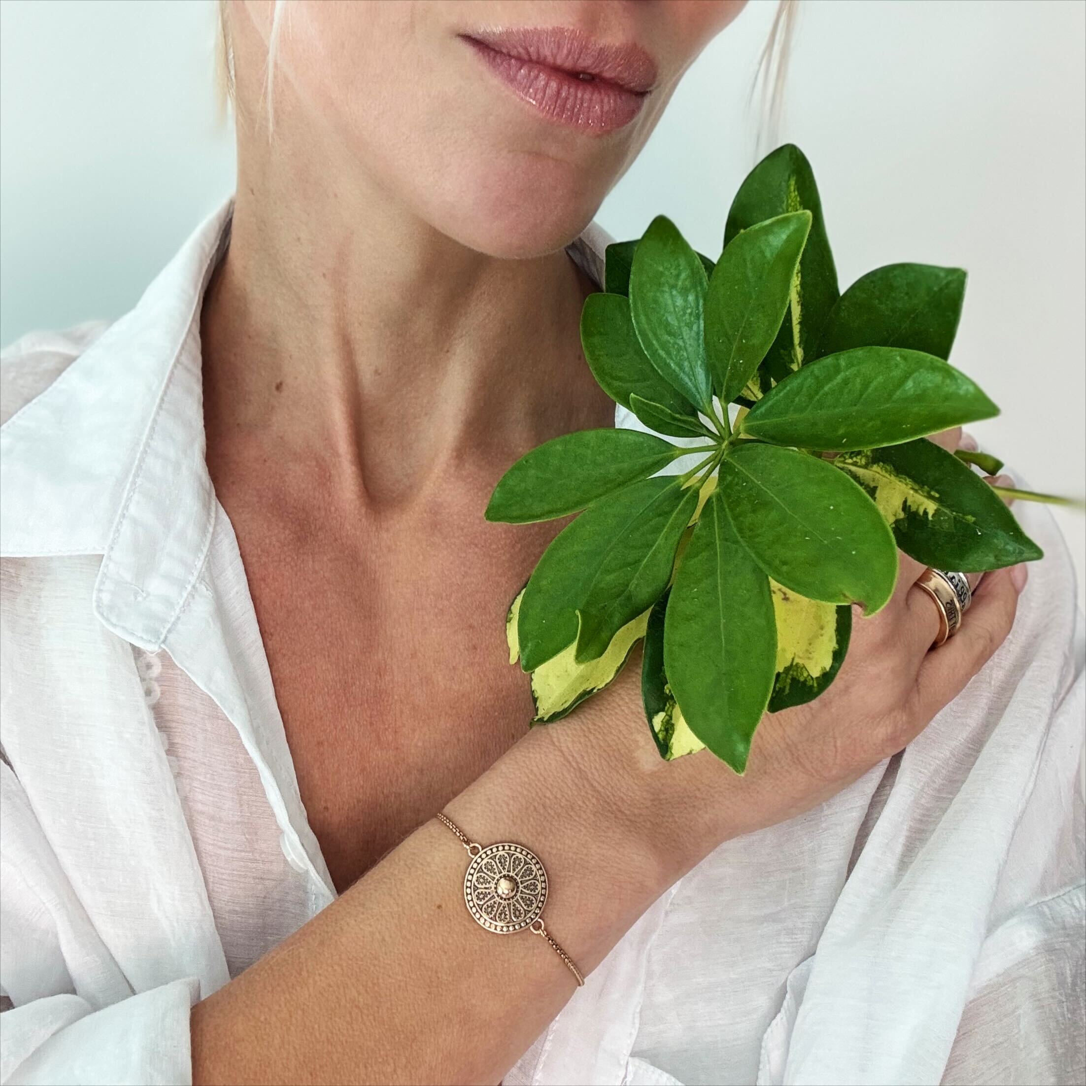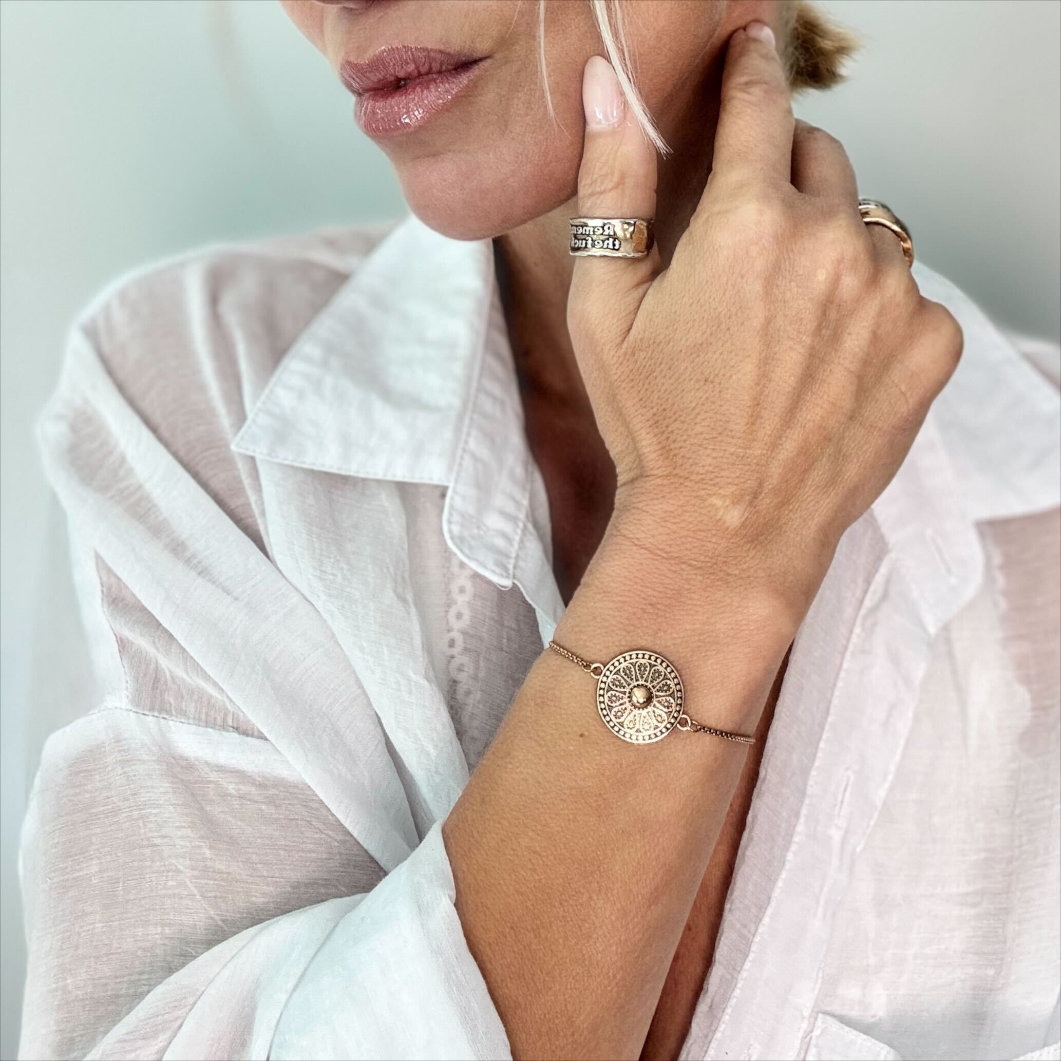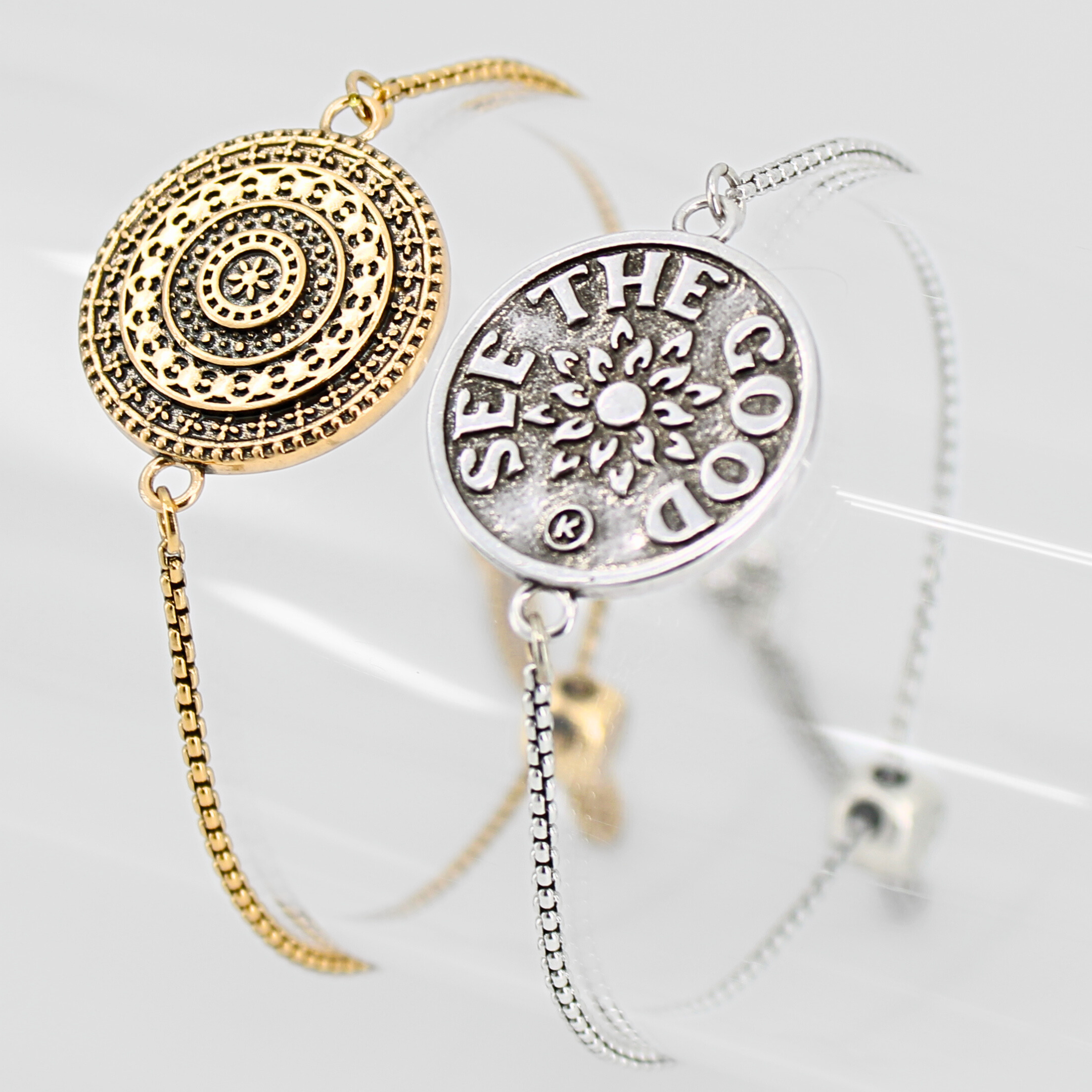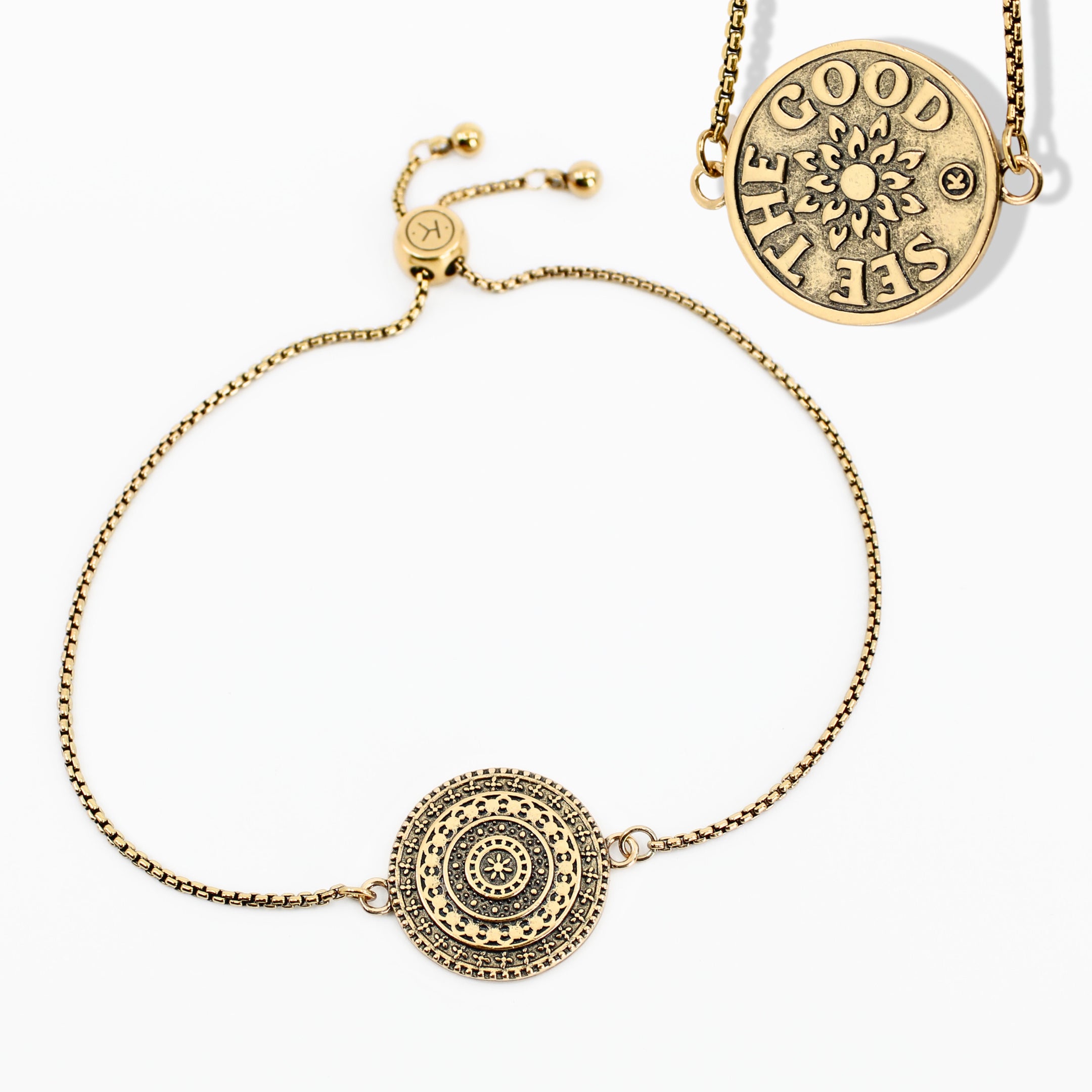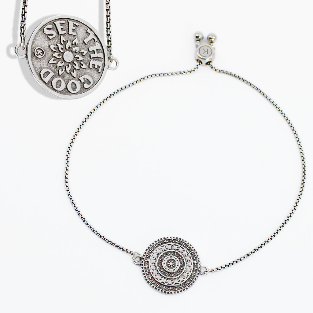 A daily reminder to shift your focus and find the light—no matter what. This beautifully detailed mandala bracelet features a hidden message engraved on the reverse: See the Good. Whether you wear it as a quiet affirmation or a bold statement, it's a symbol of mindfulness and strength.