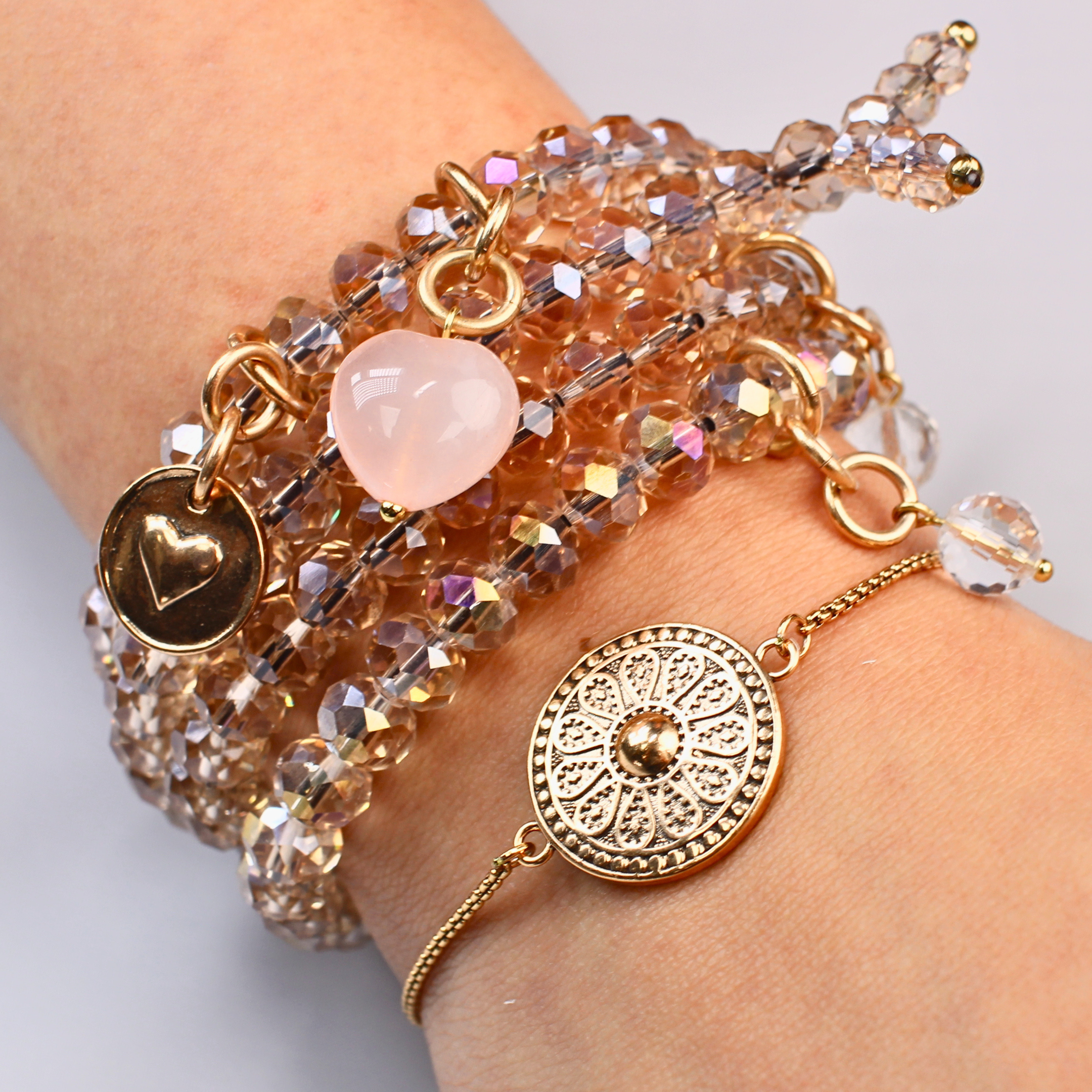 Love Crystal Boho WrapĀ ā 8mm faceted beige crystal beads and finished with a gold pendant, it's elegant, timeless, and full of light.Ā Features (1x) rose quartz heart and (x2) 8mm crystal quartz accents.Ā Length 15"; Comes with a magnetic clasp.