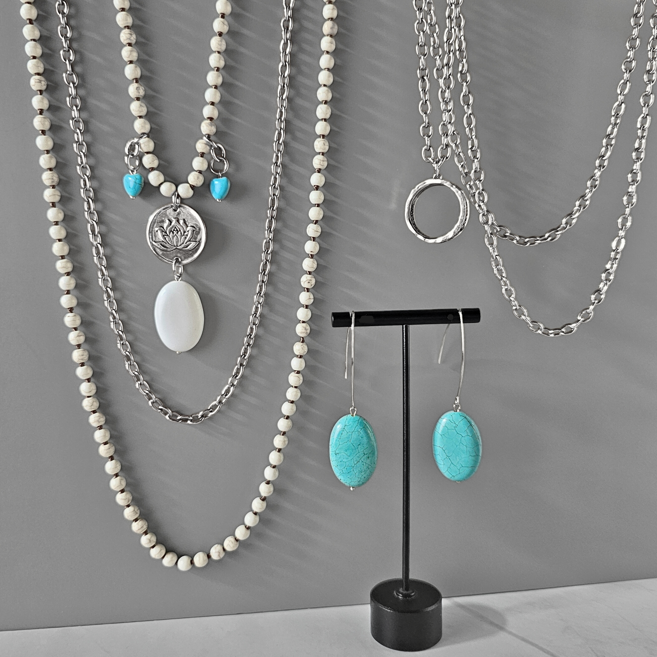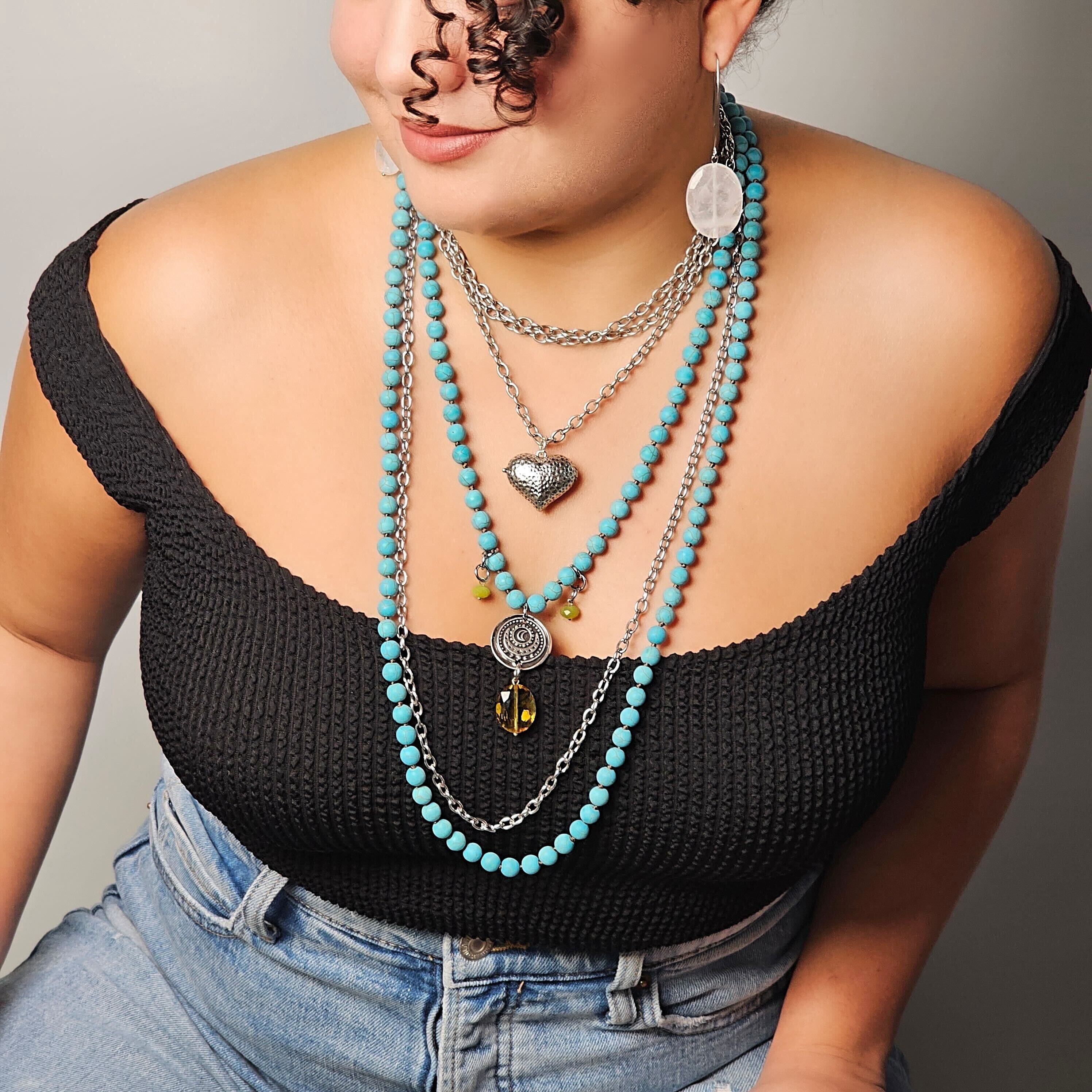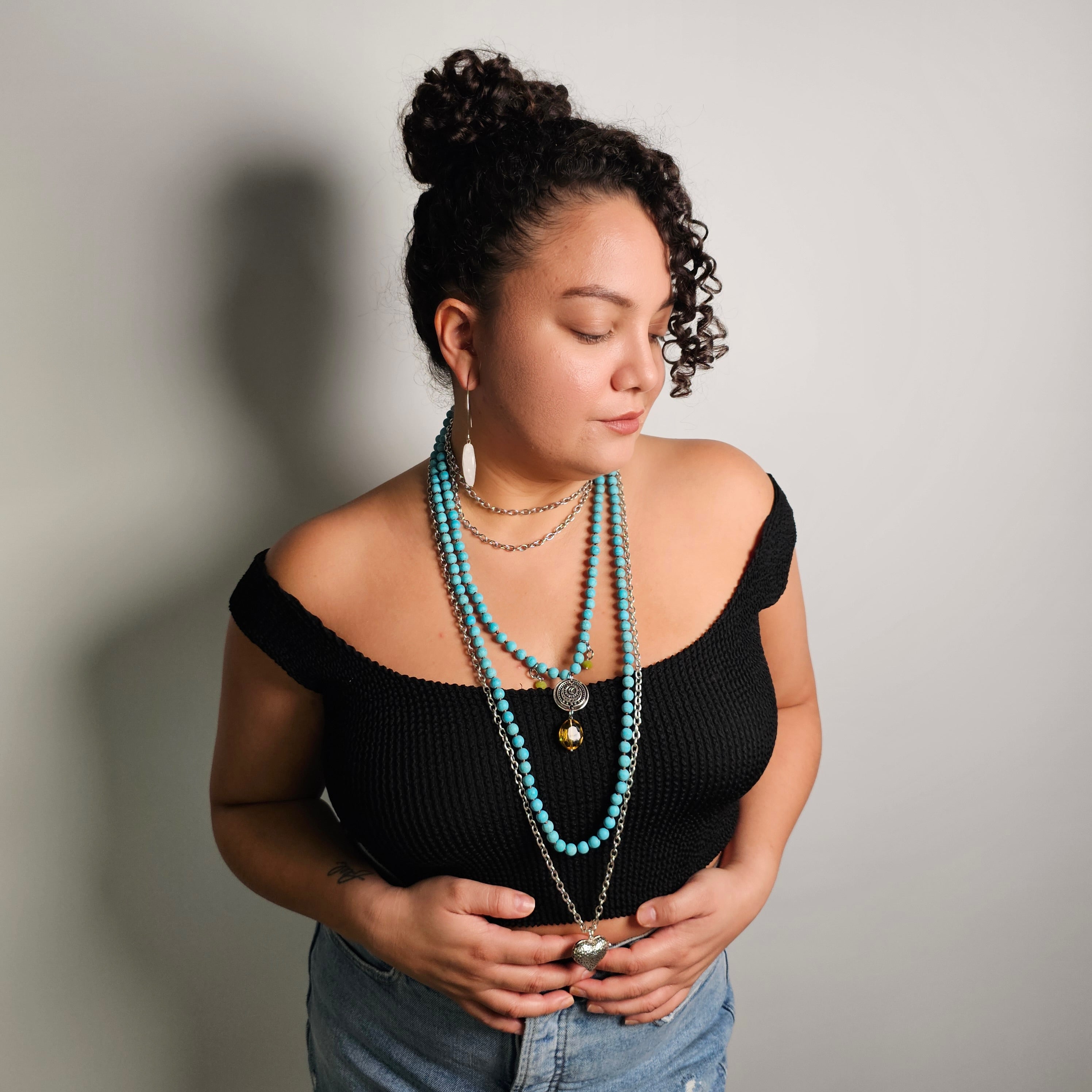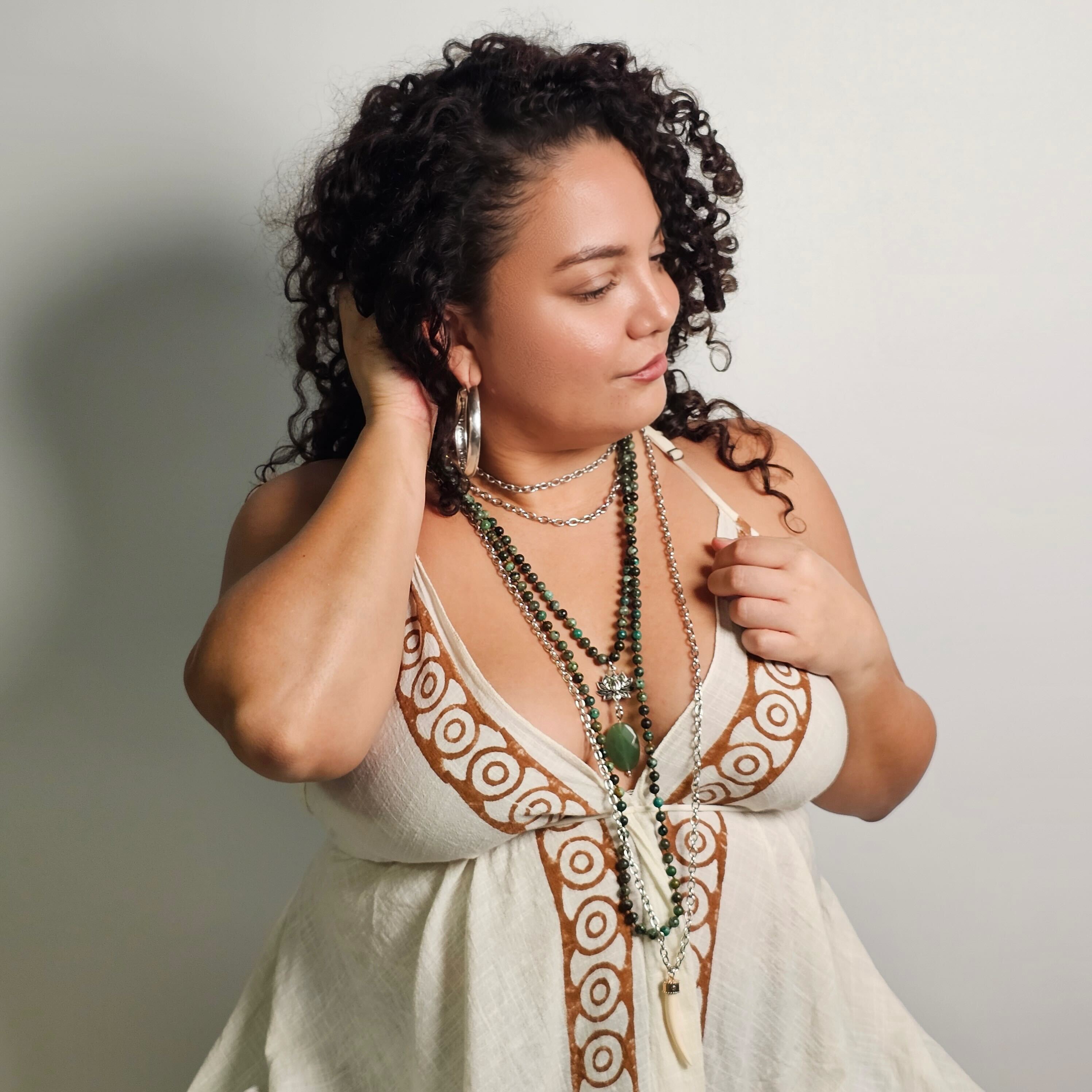 Boho Wrap Full Length: S/M 26-29" M/L 30-32" **MODELS NECK MEASURES 15" IN CIRCUMFERENCE. PLEASE NOTE THAT NECKLACES MAY LAY DIFFERENTLY BASED ON YOUR MEASUREMENTS**