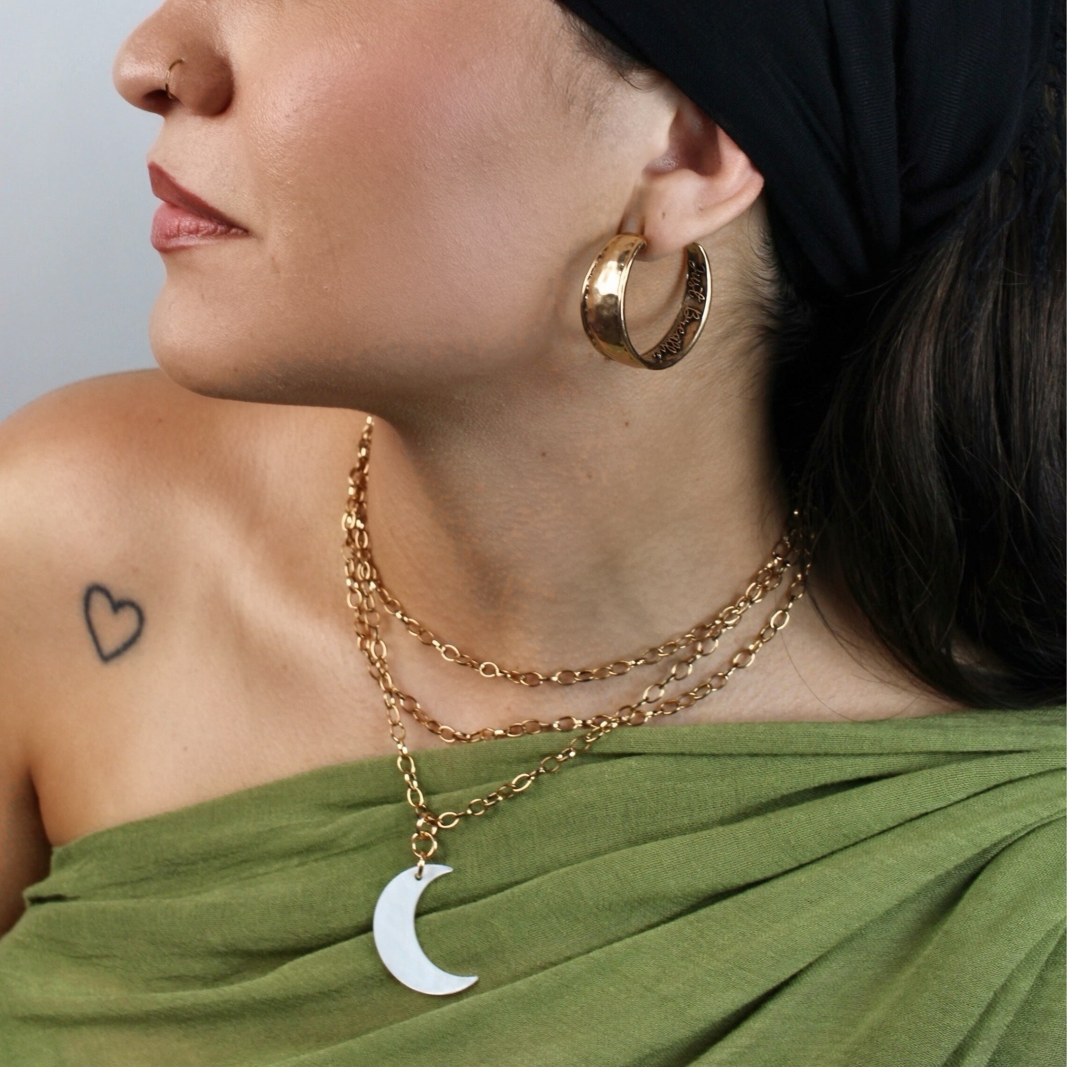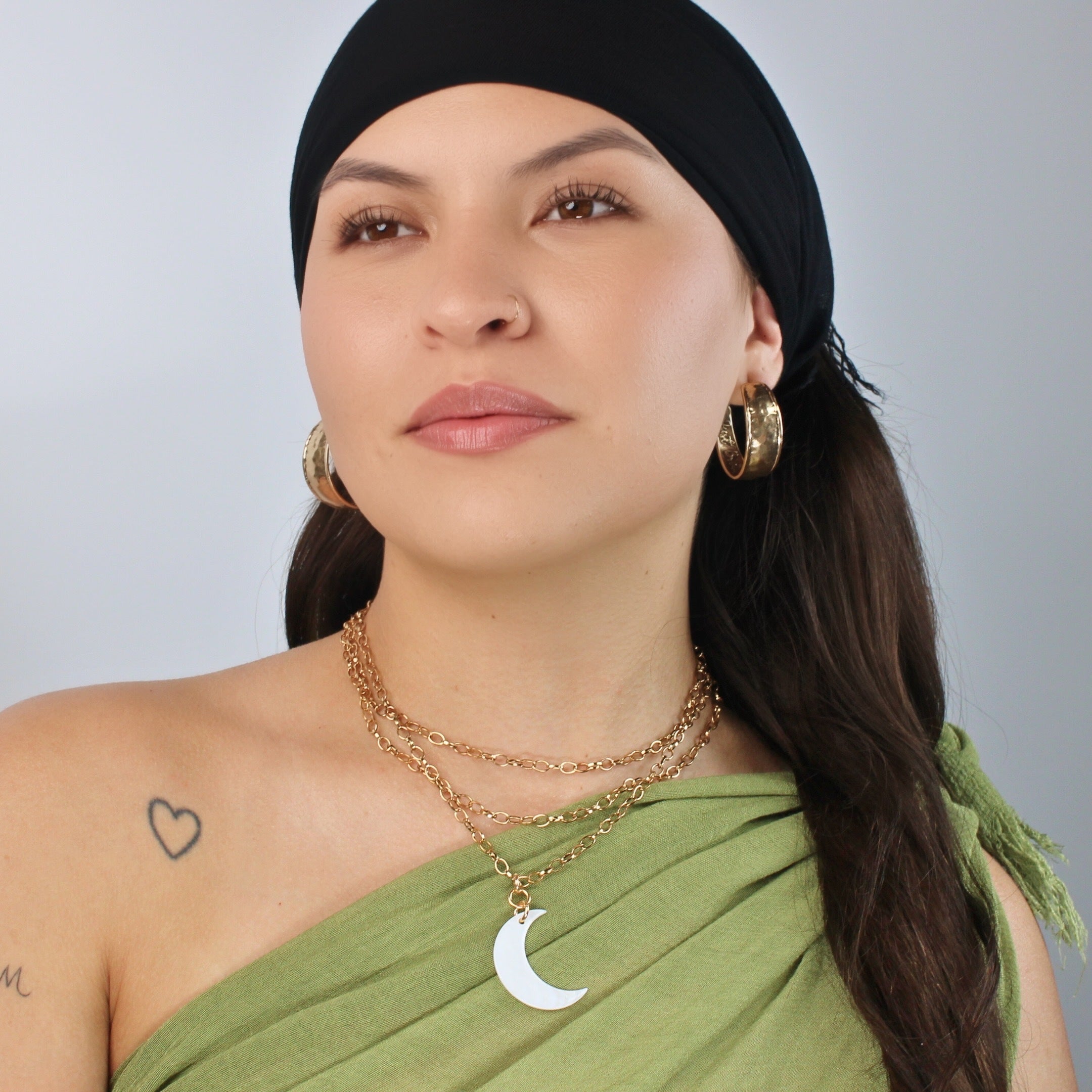 Stay Wild Moonchild Boho WrapĀ ā 8mm black wooden beads and finished with a gold pendant, it embodies independence and inner light.Ā Features (1x) moonstone accent and (x2) stacked 3-crystal accents. Length 14"; Comes with a magnetic clasp.