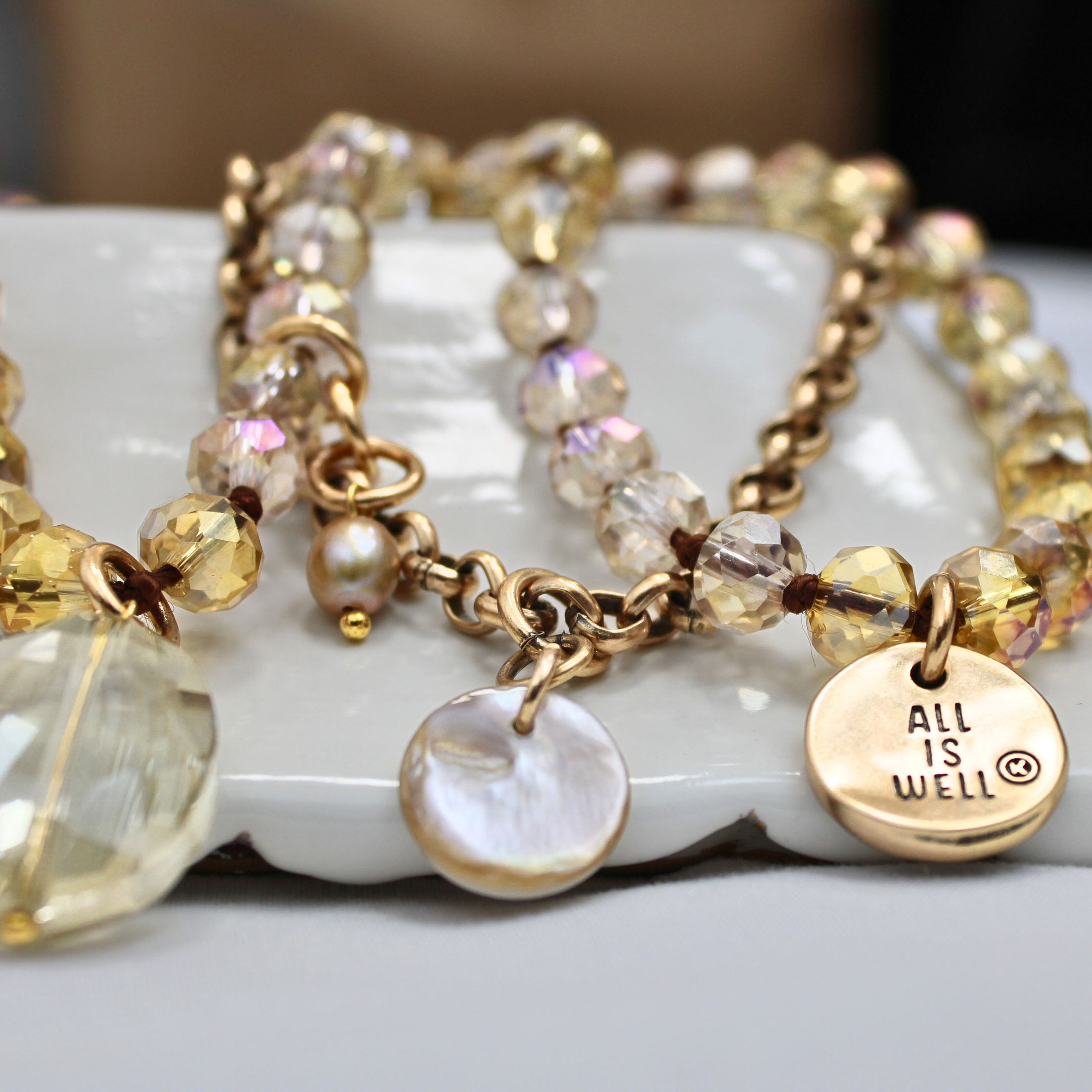 Let this luminous duo be your daily reminder to breathe deep and trust the journey. The All is Well Limited Edition Bundle blends soothing iridescent champagne crystal beads with soft pearl accents for a look that’s equal parts grounding and radiant. Layered with a shimmering rollo chain and pearl disc charm, it’s a gentle nudge from the universe that everything’s unfolding as it should.