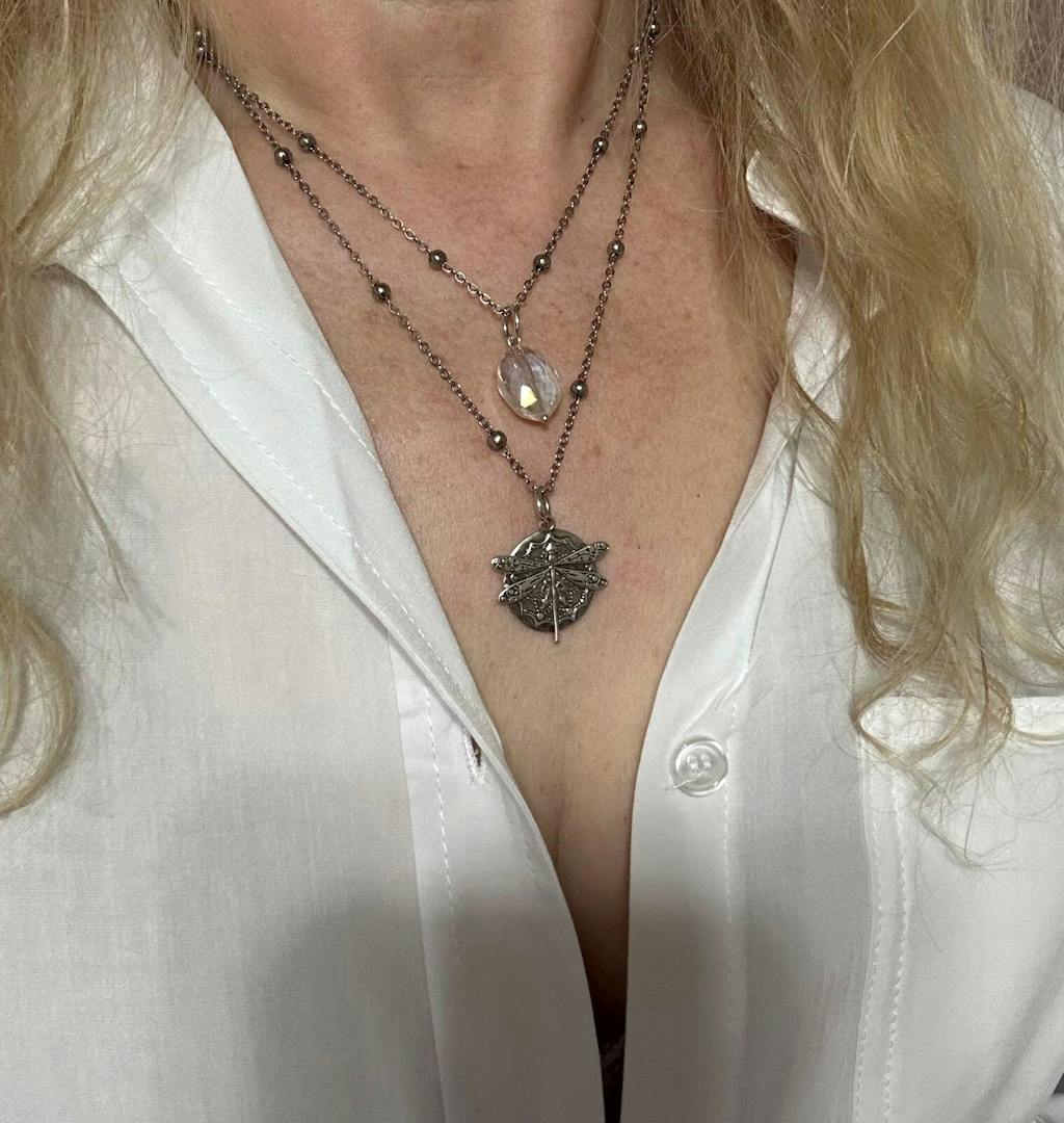 Dainty satellite chain necklace with dragonfly pendant and iridescent crystal accent stone; message inscribed on reverse.