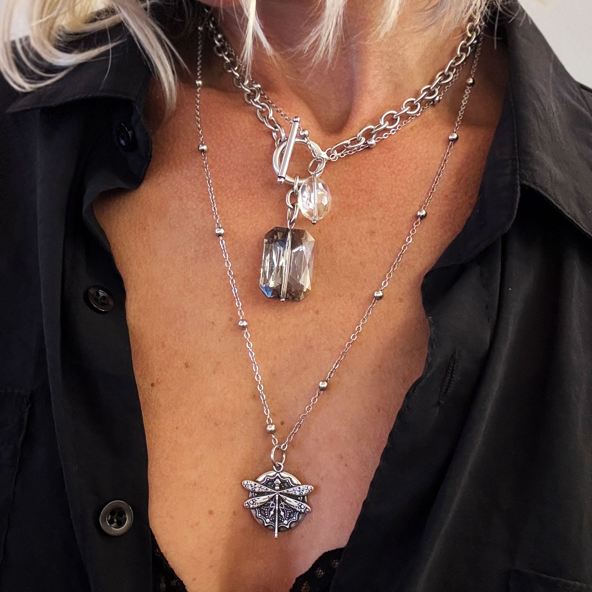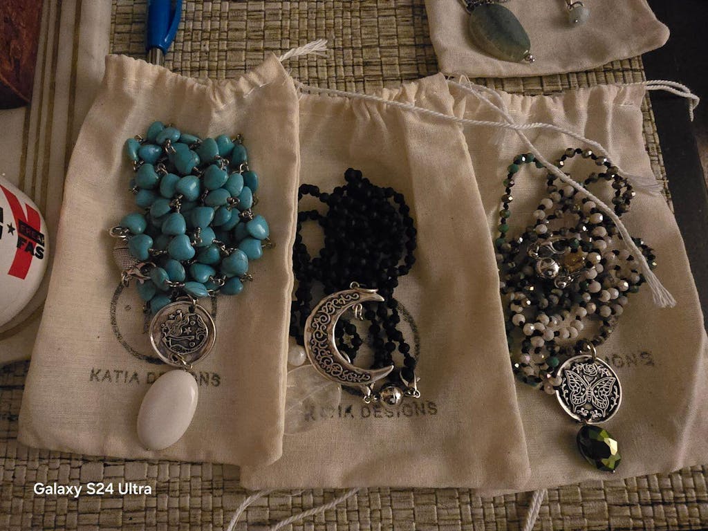Katia loves to embrace all of the imperfections that occur when working with organic materials. Due to the crystals and crystal beads being an organic material, shape, clarity, and color vary and may have pits, cracks, and other marks that Mother Nature provided to add interest and beauty.