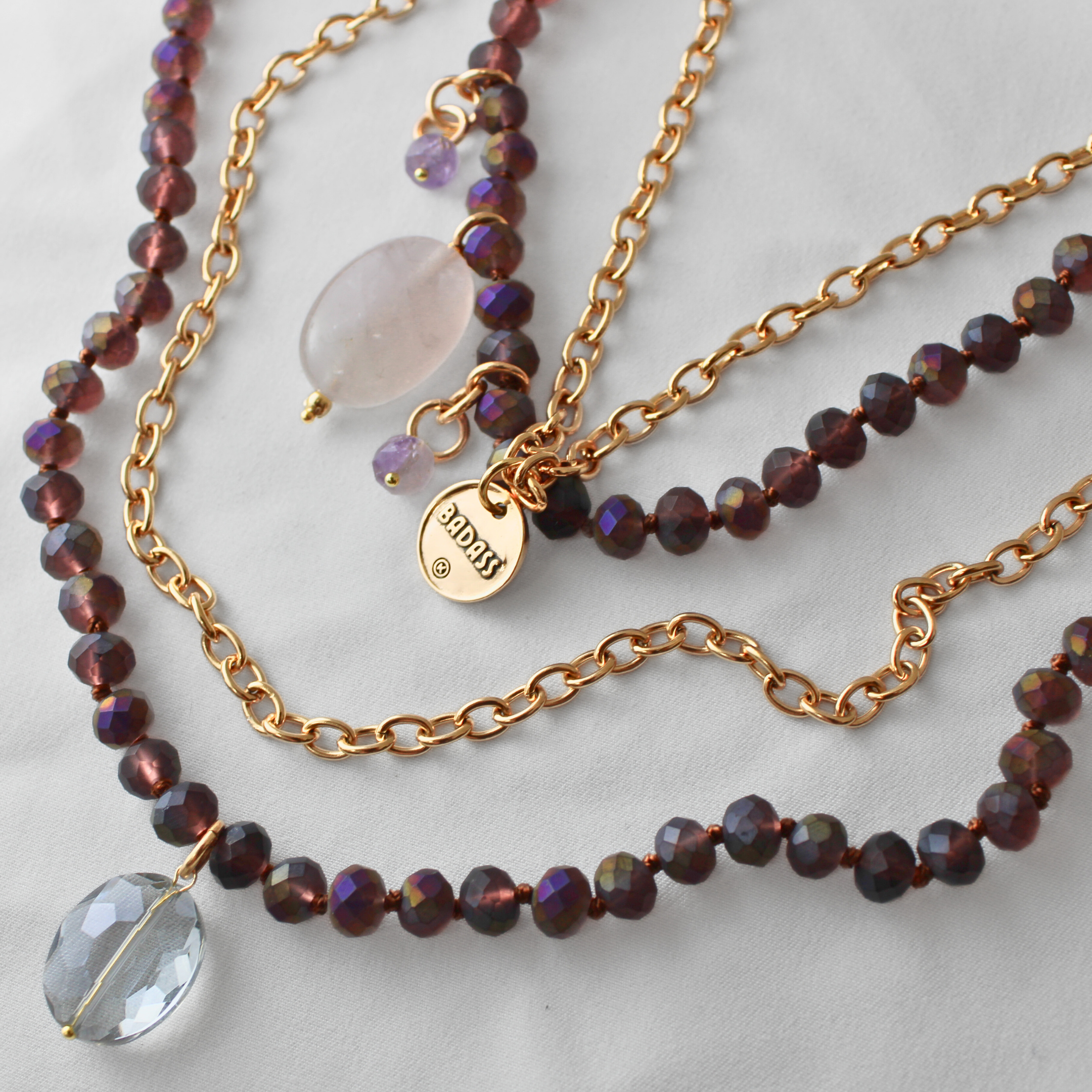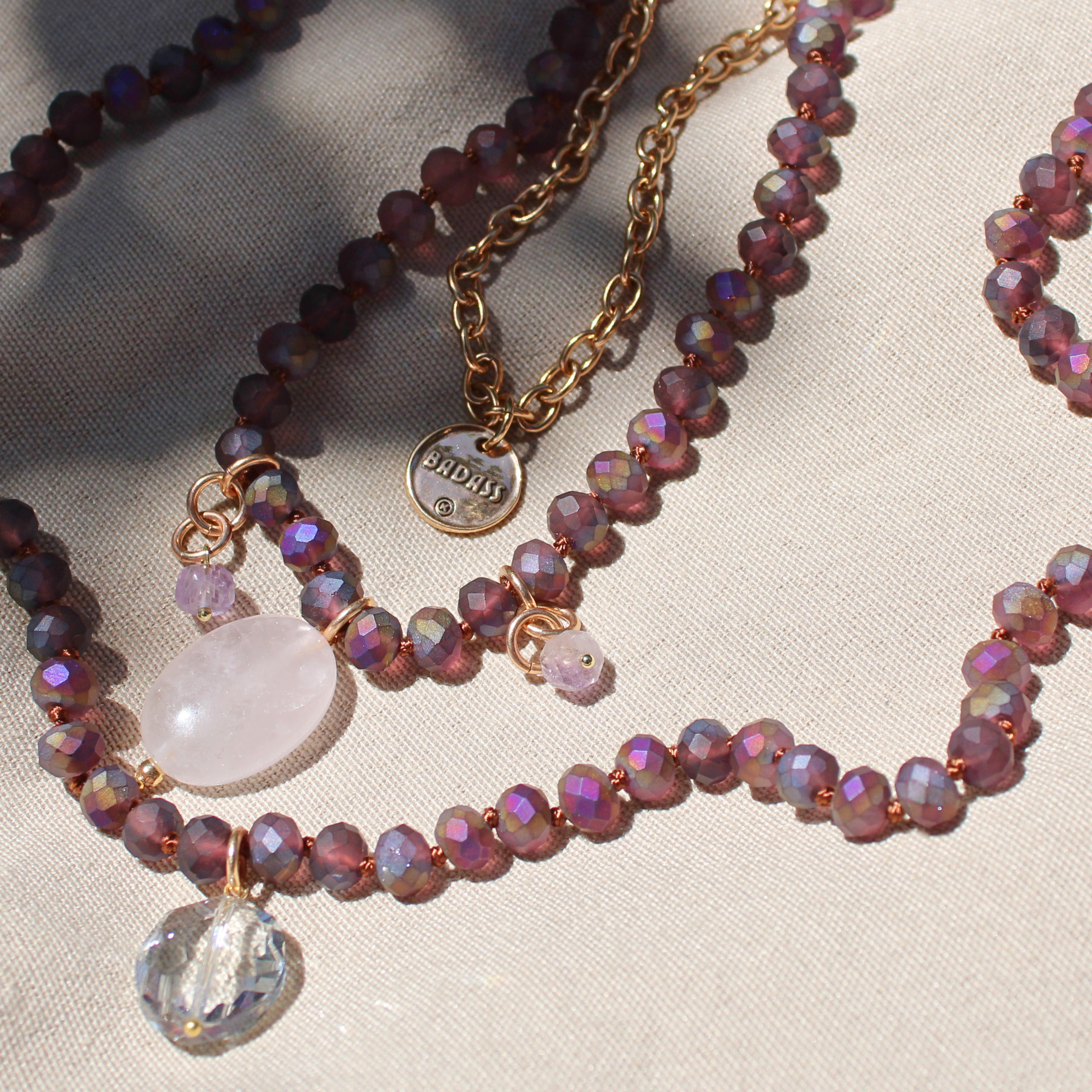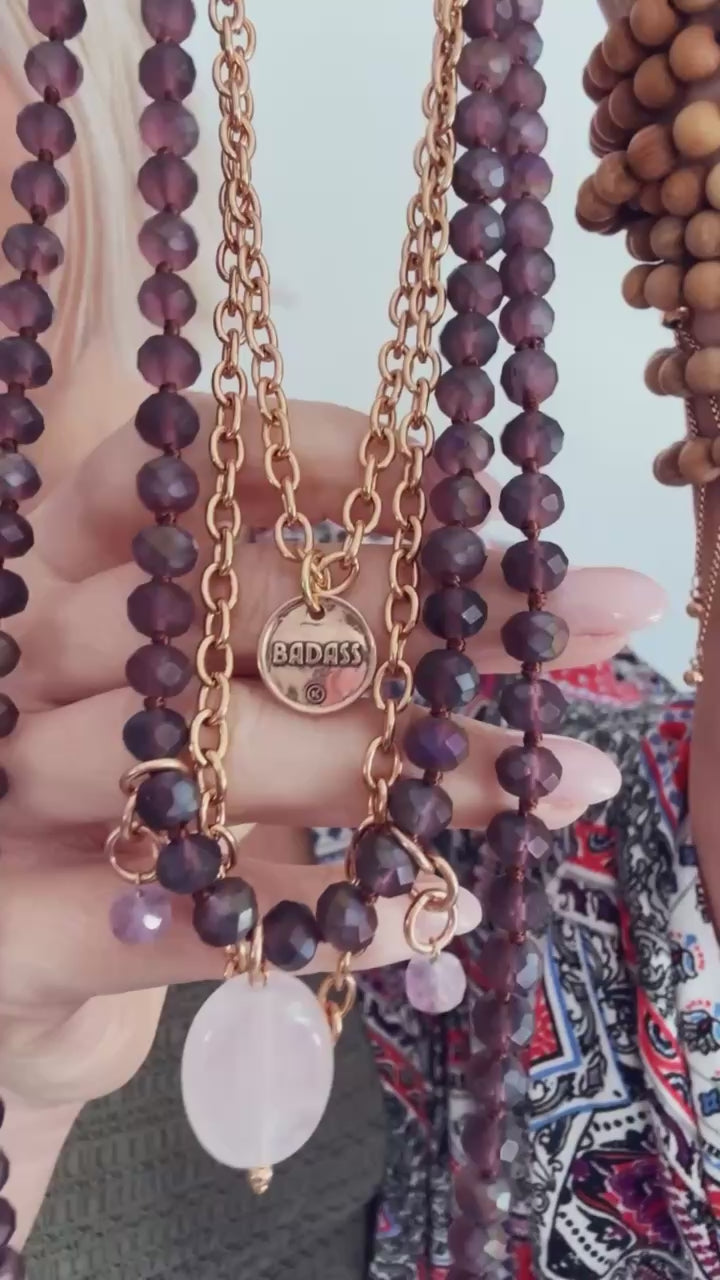 Meet the Badass - a limited edition layering bundle made to turn heads and tune into your power. This bold duo blends matte purple crystal beads with rich amethyst accents and a stunning rose quartz drop - the ultimate heart and crown chakra combo. Paired with a chunky cable chain and crystal pendant, it’s layered, luxe, and unapologetically you.