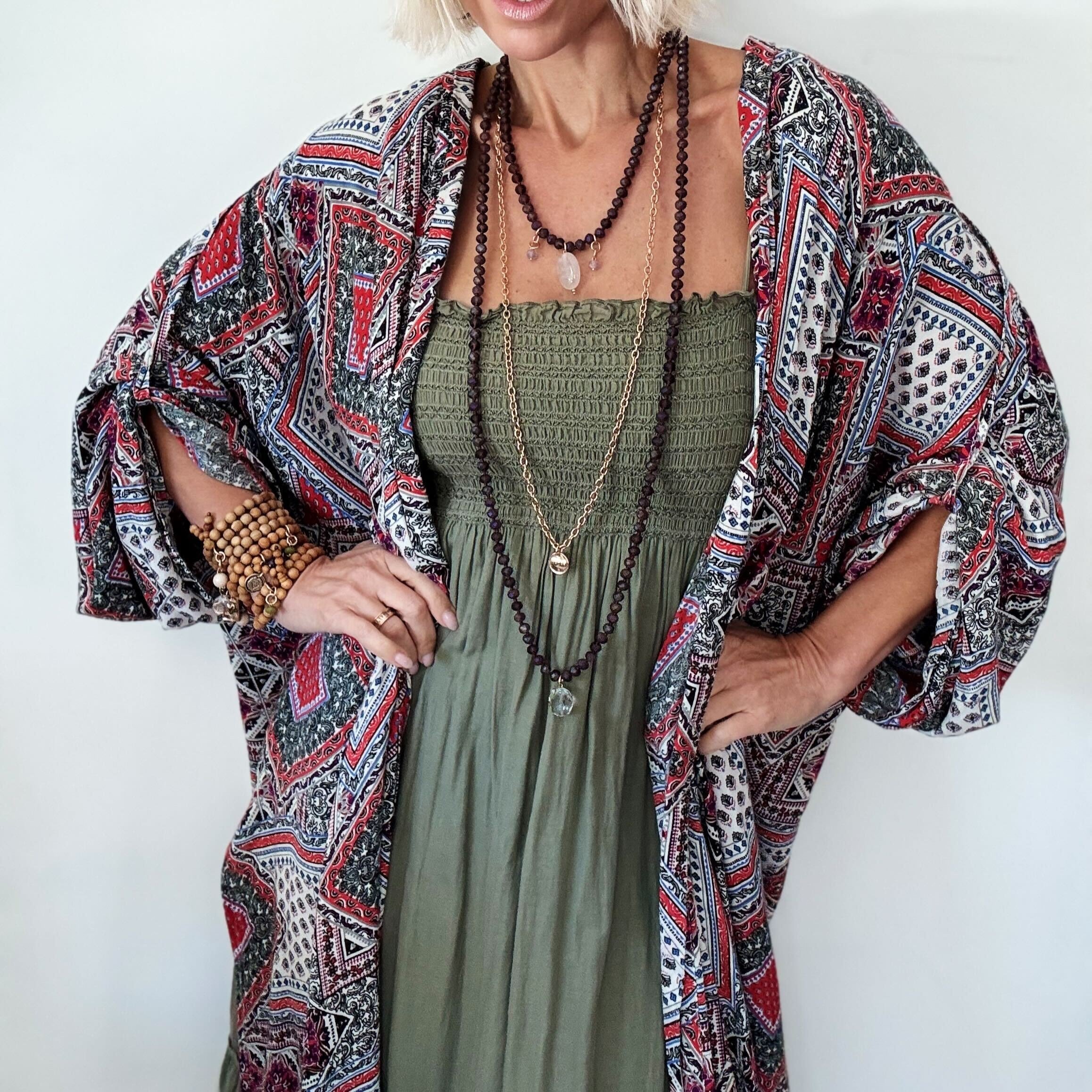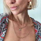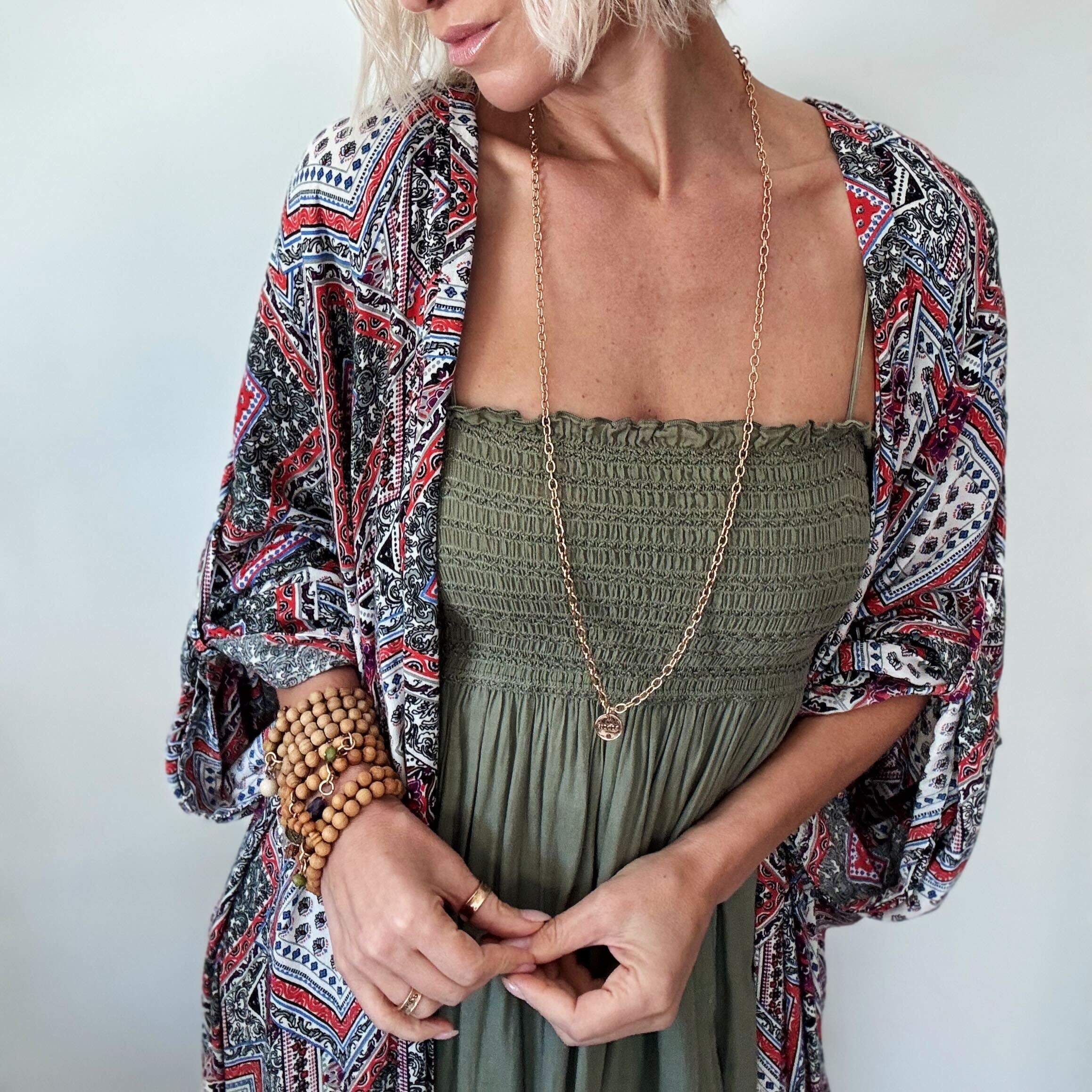 Long Fusion Full Length: 55-62" **MODELS NECK MEASURES 15" IN CIRCUMFERENCE. PLEASE NOTE THAT NECKLACES MAY LAY DIFFERENTLY BASED ON YOUR MEASUREMENTS**