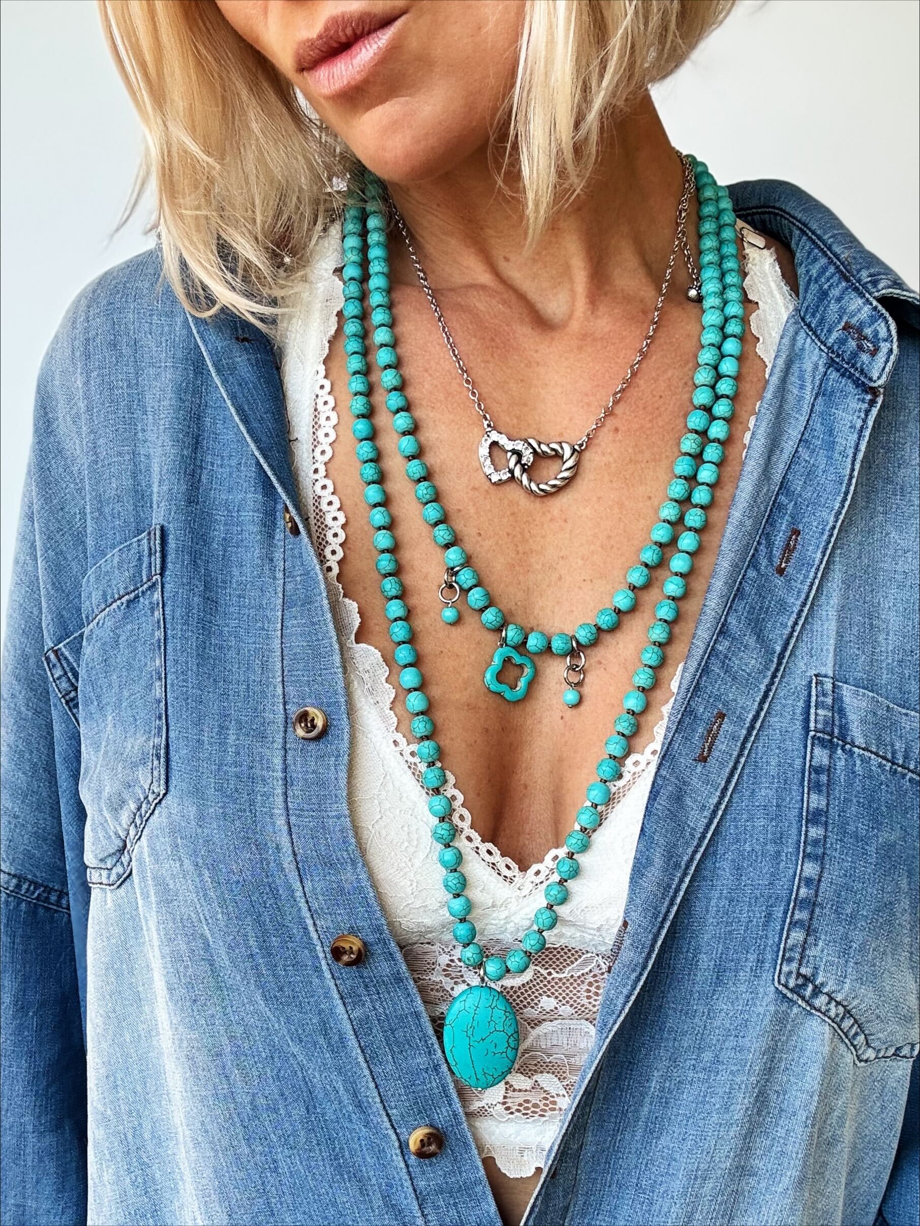 The Blue Howlite Layering Necklace is designed to bring effortless dimension to your everyday stack. Featuring a longer silhouette with beautifully spaced blue howlite accents, this piece adds depth, movement, and a subtle pop of color to any look.