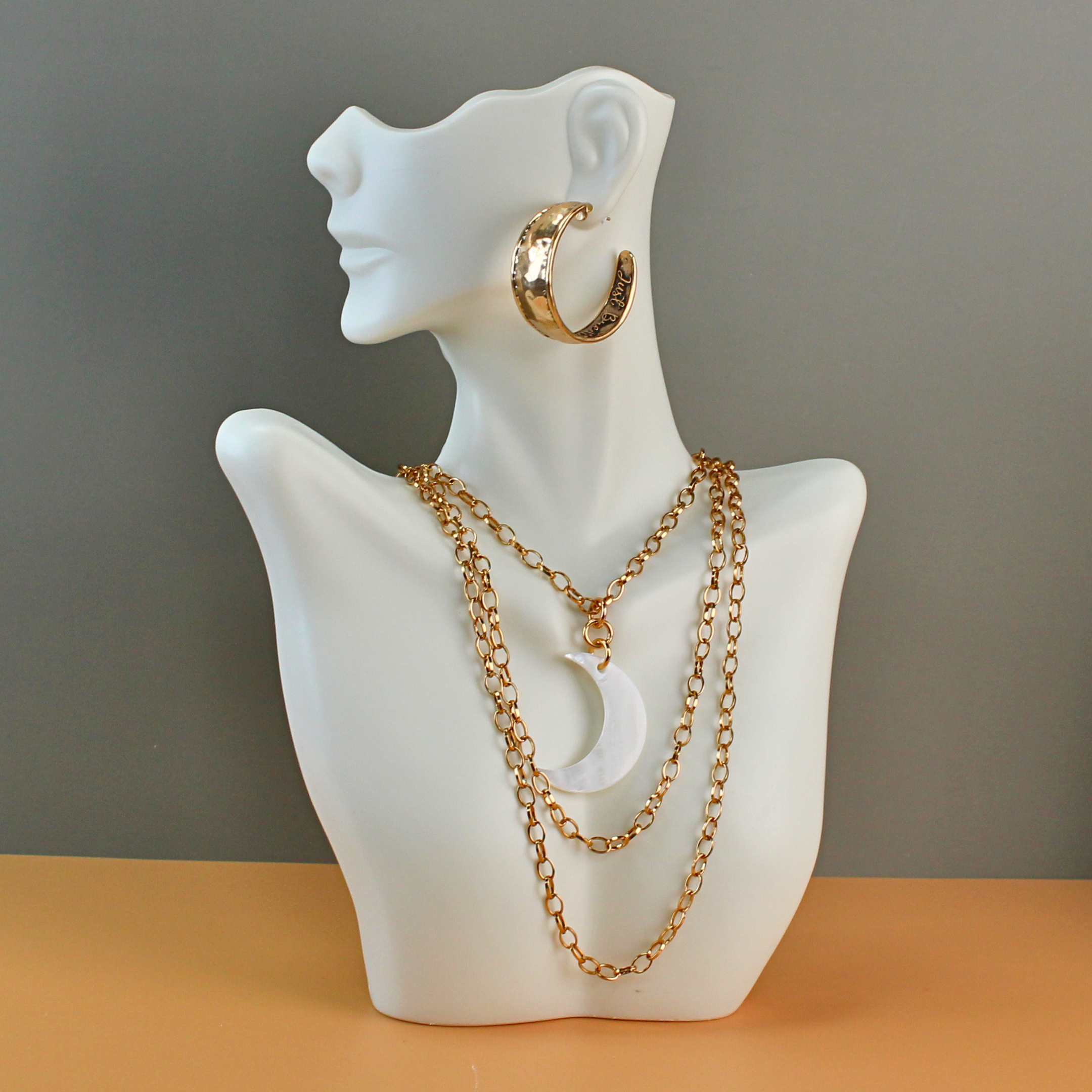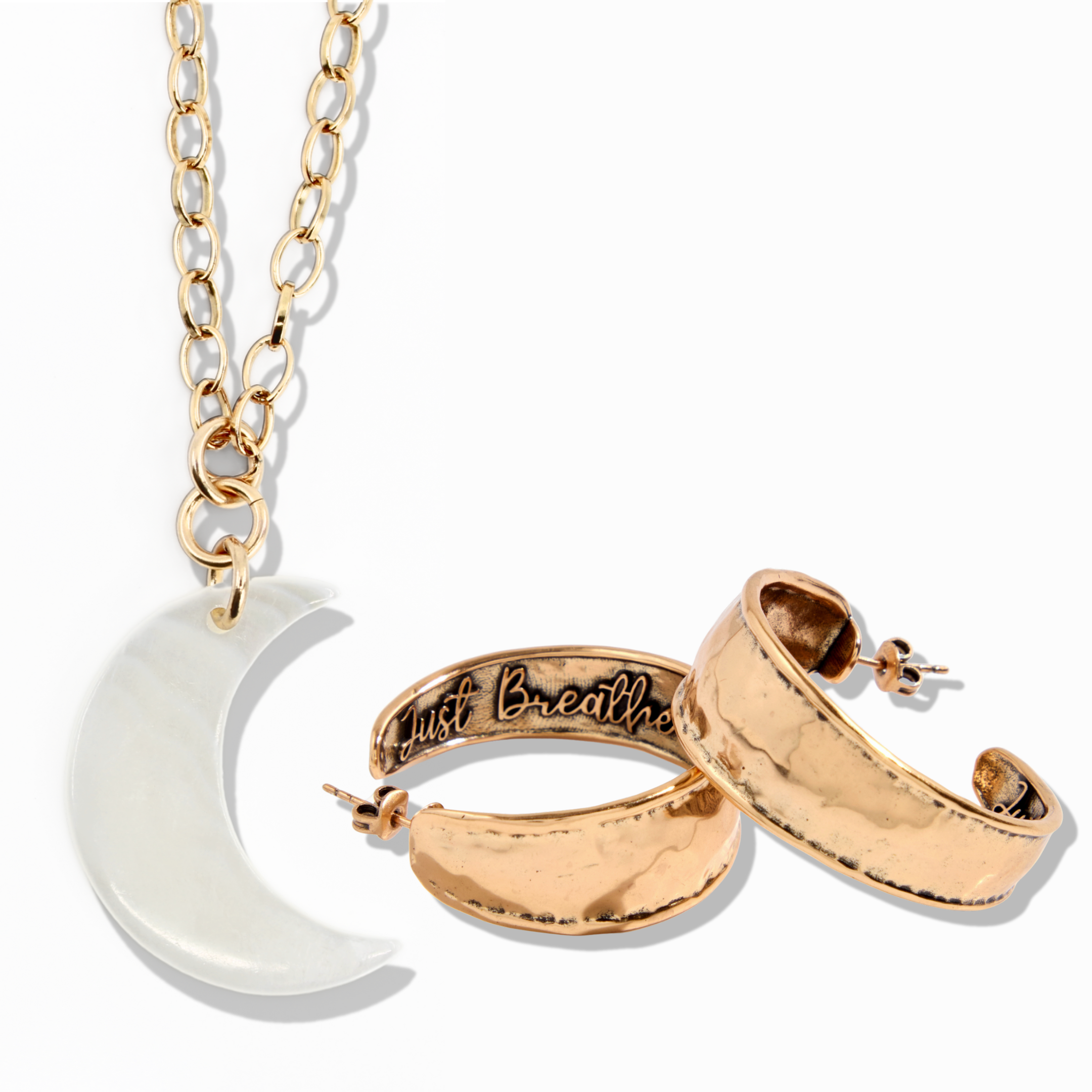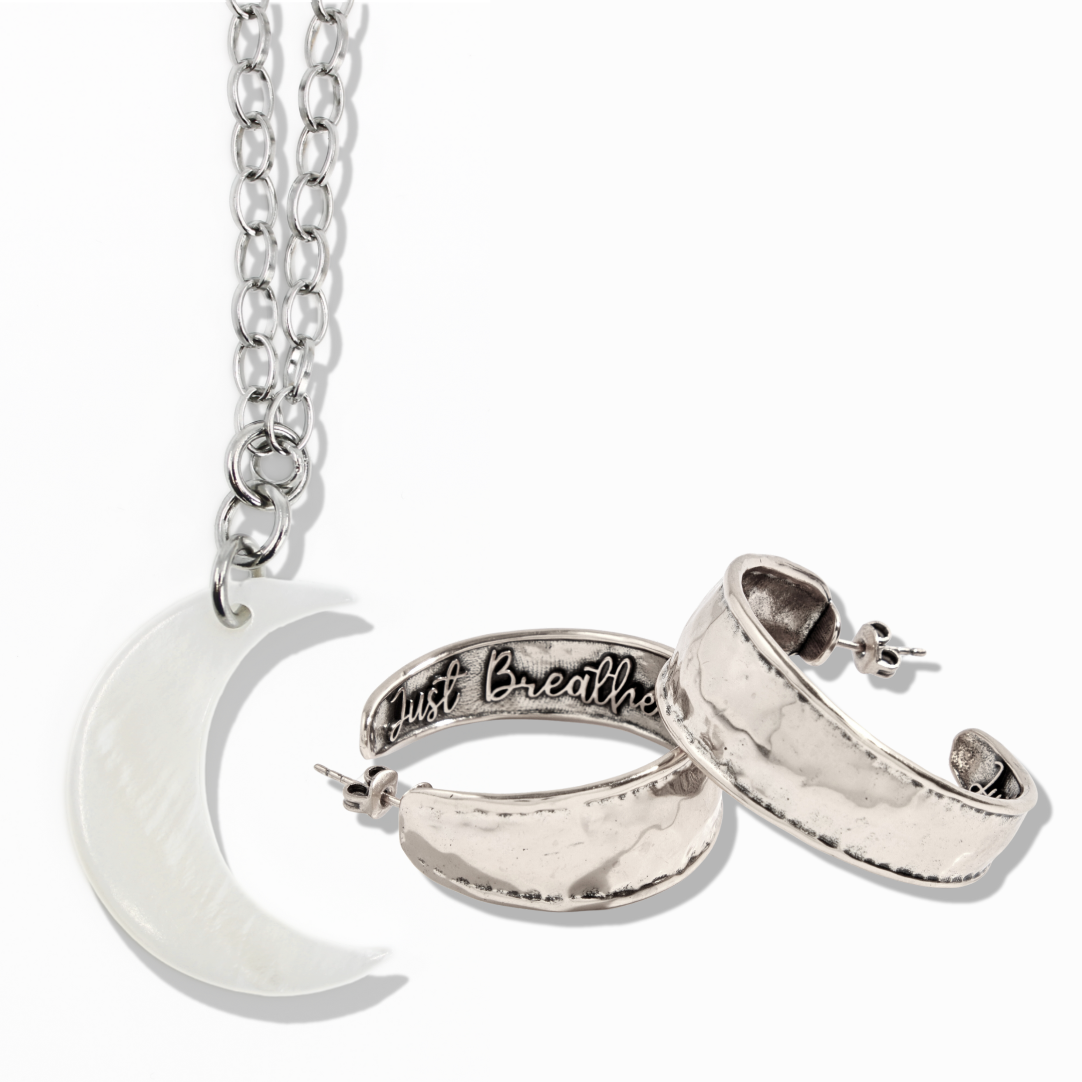 This celestial set reminds you to slow down and shine softly. A luminous shell moon pendant hangs from a delicate stainless-steel layering chain â paired with our Just Breathe hammered hoops that echo serenity in sculpted metal. Together, they create a look that feels both centered and elevated, perfect for your mindful moments or daily wear.