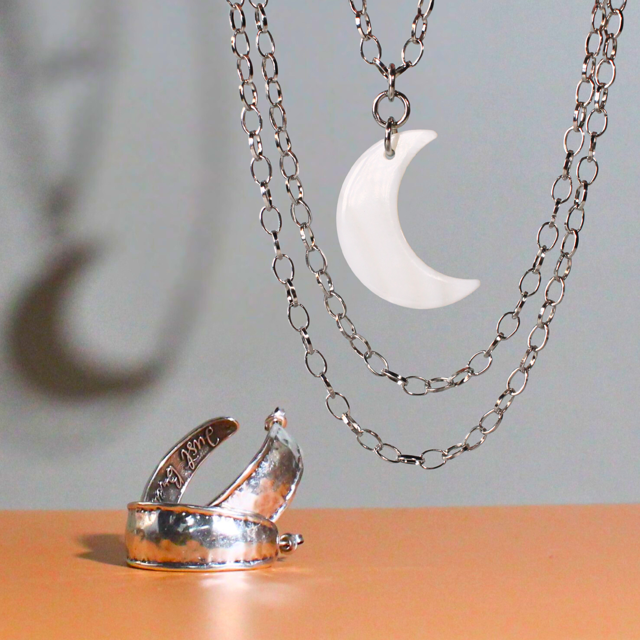 MOON Layering Chain:Â đ 48" 6mm plated stainless steel chain with pearl moon shell (1.5") accent; Comes with a magnetic clasp