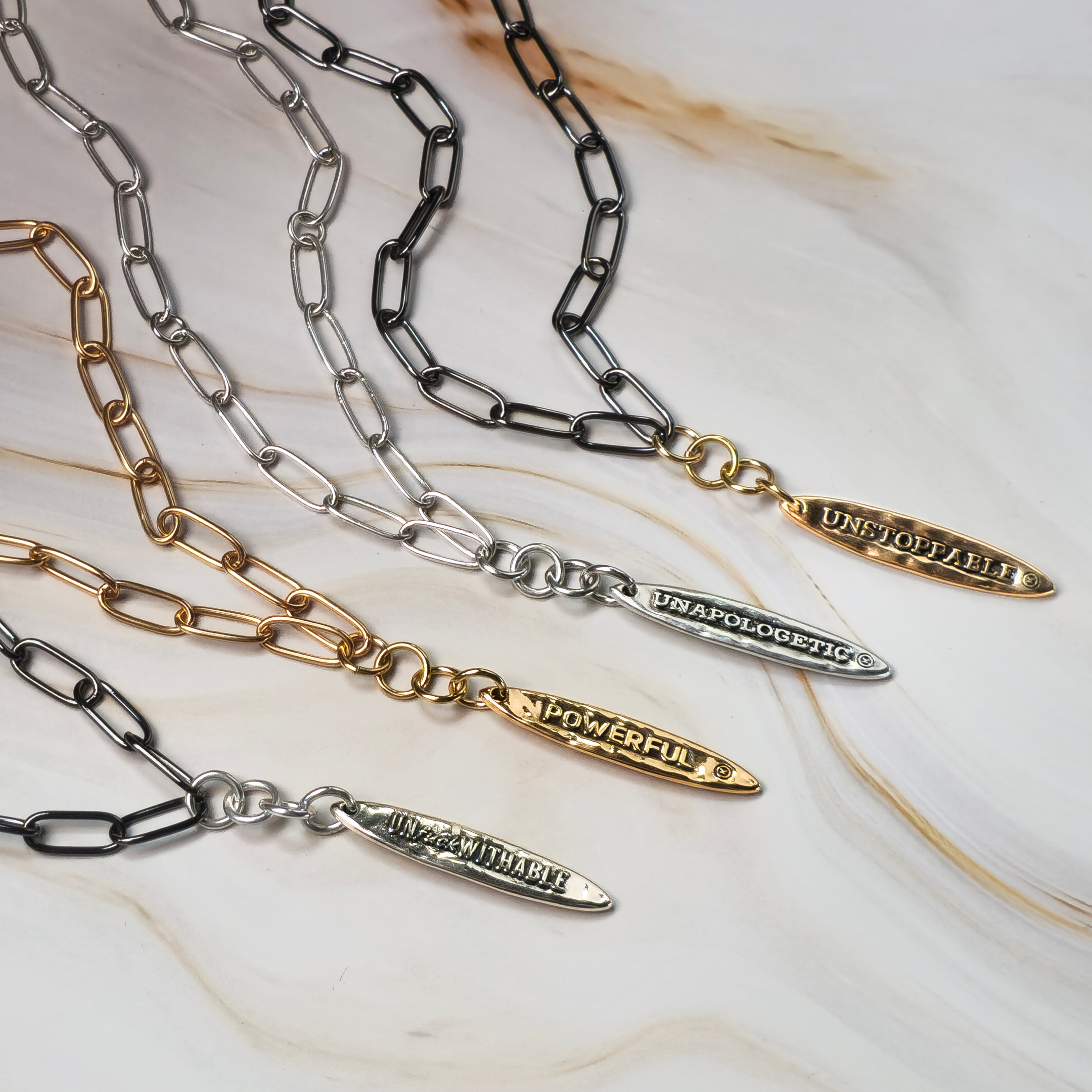 - Chain: 46” Plated brass paperclip