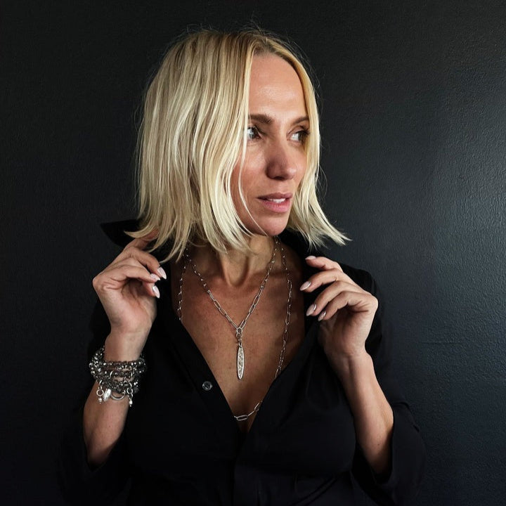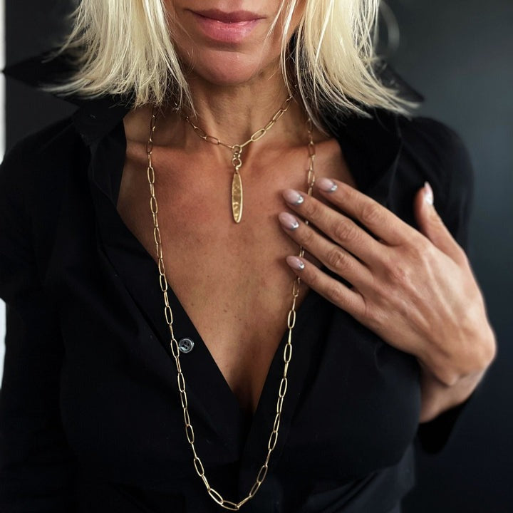 Klink Full Length: 46" **MODELS NECK MEASURES 15" IN CIRCUMFERENCE. PLEASE NOTE THAT NECKLACES MAY LAY DIFFERENTLY BASED ON YOUR MEASUREMENTS**