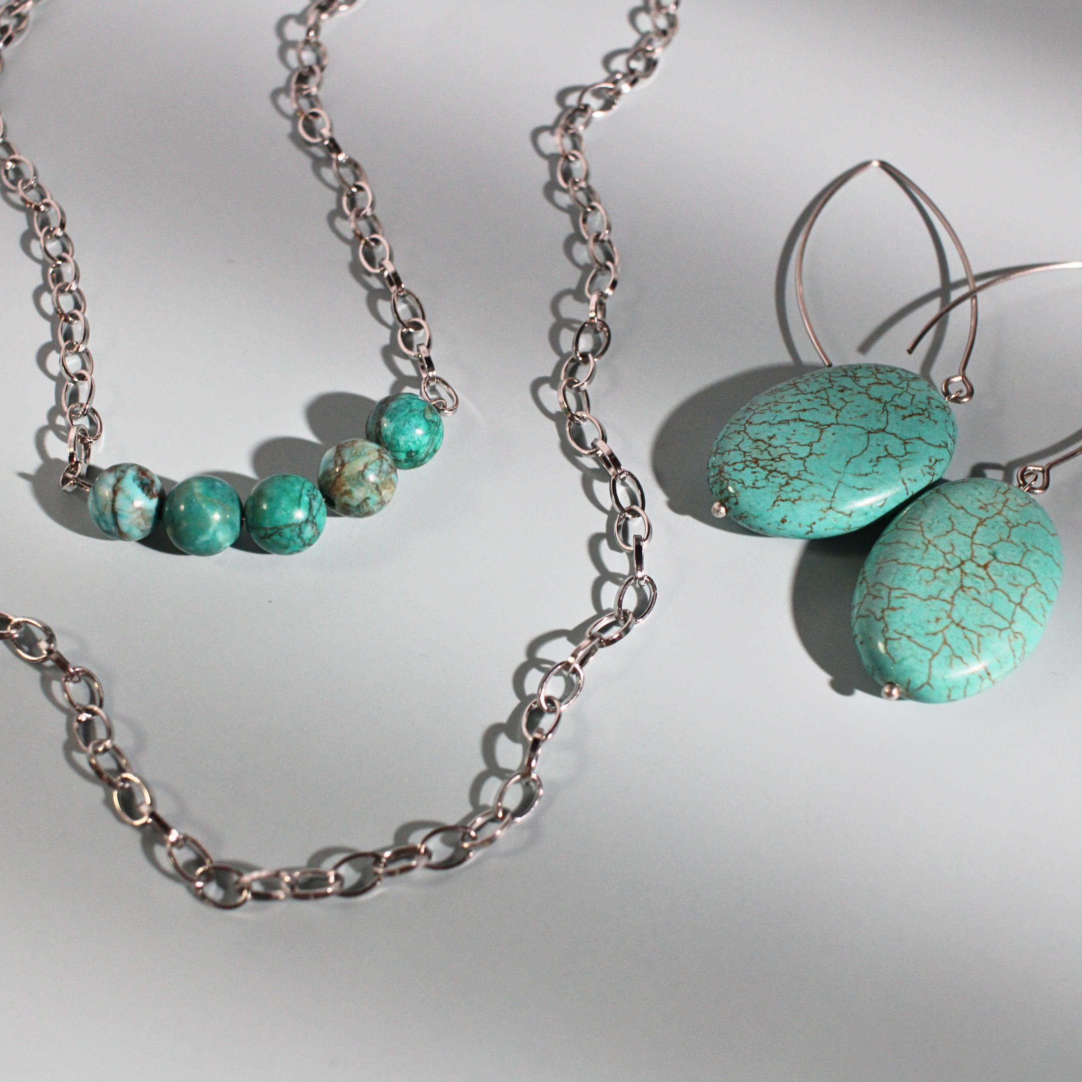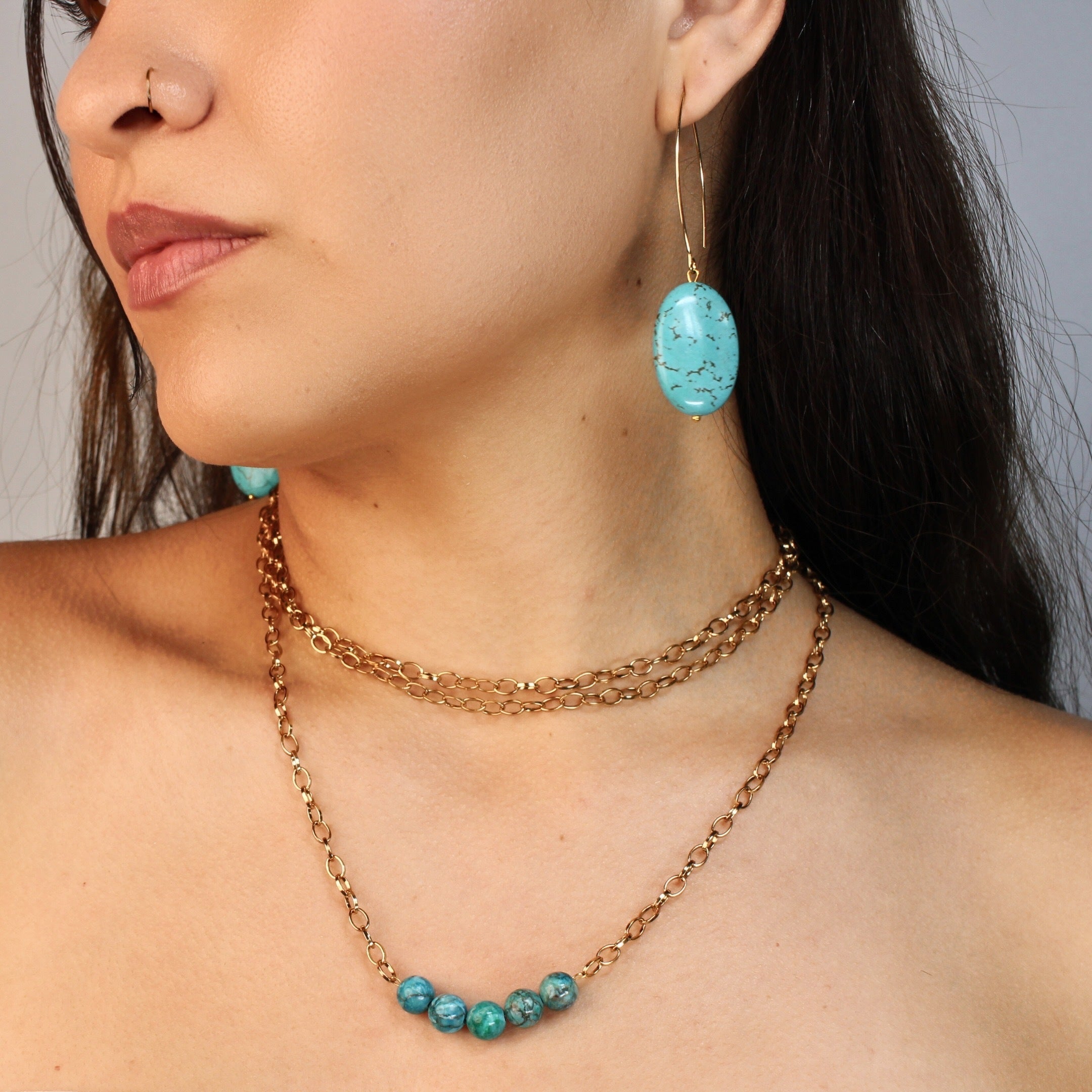 Inspired by natureās palette, this set blends the warmth of jasper with the striking vibrancy of blue crackle howlite. The jasper layering chain brings an organic, neutral texture, while the bold howlite earrings add a radiant pop of color. Together they create a look that feels grounded, effortless, and full of life.