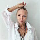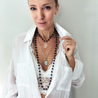 Long Rosary Chain Full Length: 50" **MODELS NECK MEASURES 15" IN CIRCUMFERENCE. PLEASE NOTE THAT NECKLACES MAY LAY DIFFERENTLY BASED ON YOUR MEASUREMENTS**
