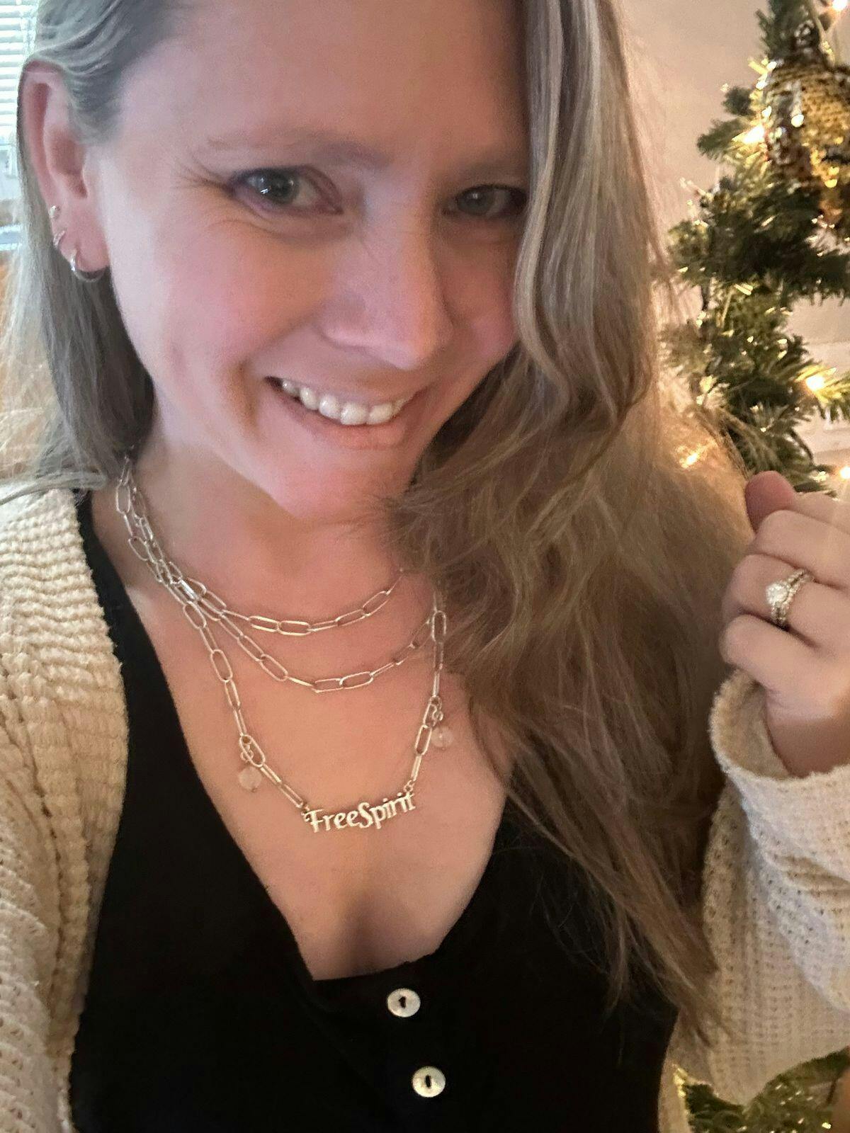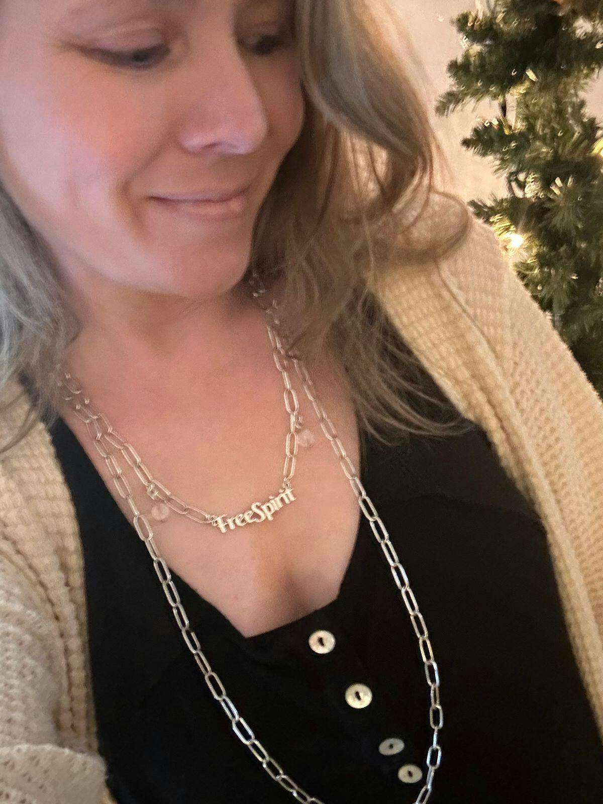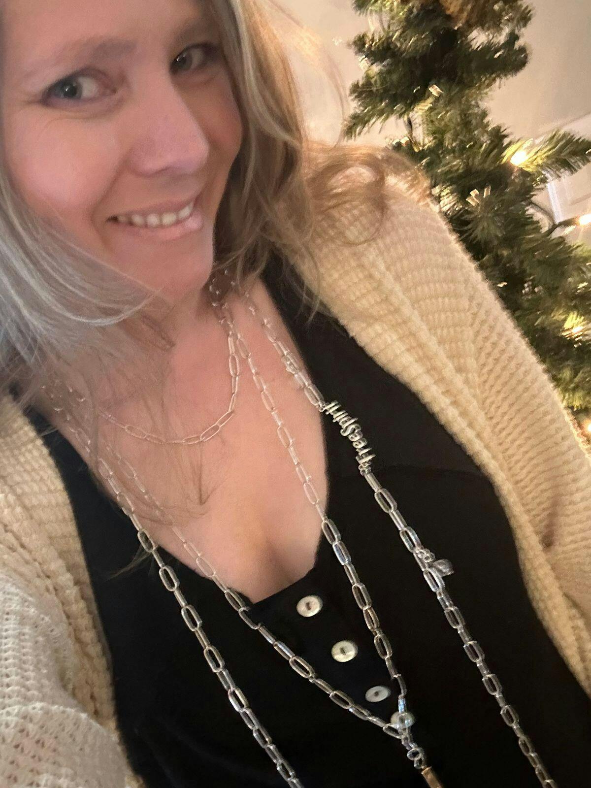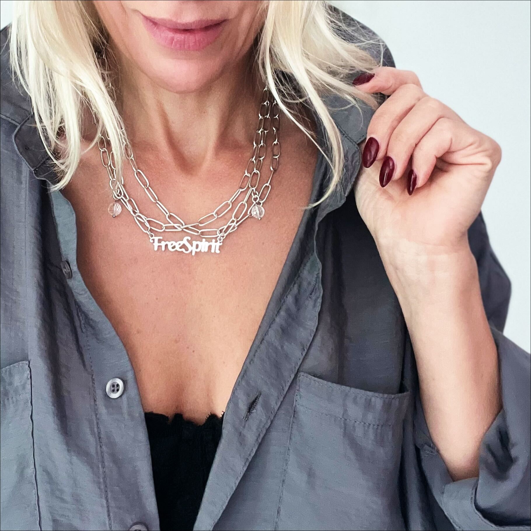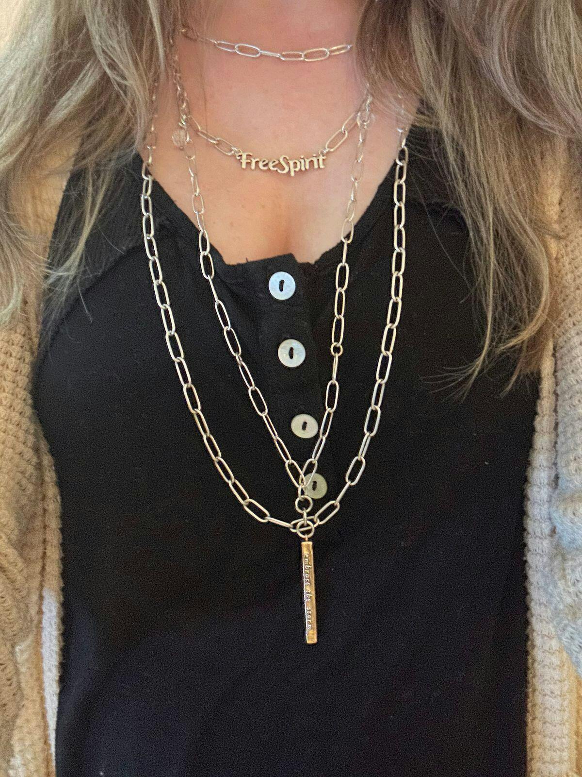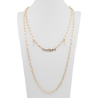 Long Chain Full Length: 50" **MODELS NECK MEASURES 15" IN CIRCUMFERENCE. PLEASE NOTE THAT NECKLACES MAY LAY DIFFERENTLY BASED ON YOUR MEASUREMENTS**