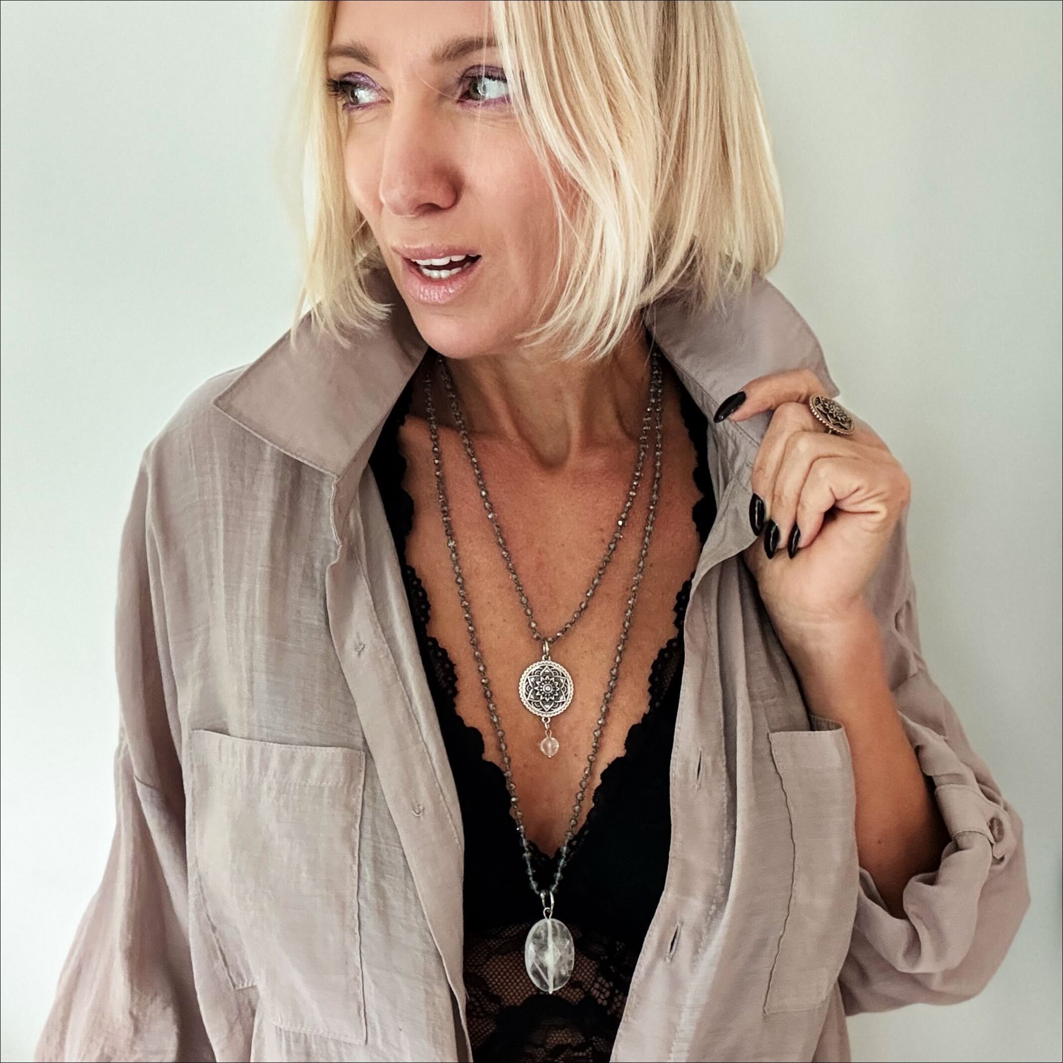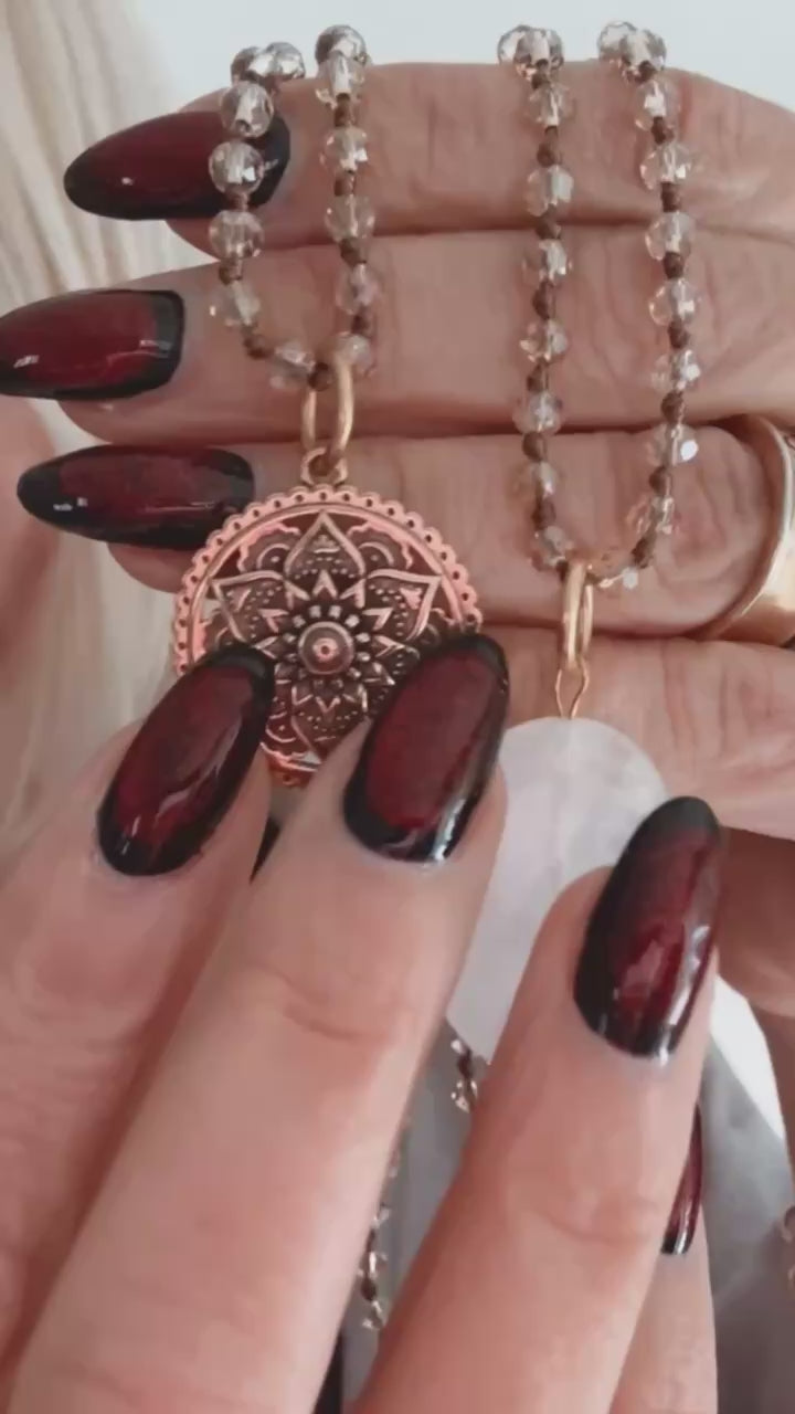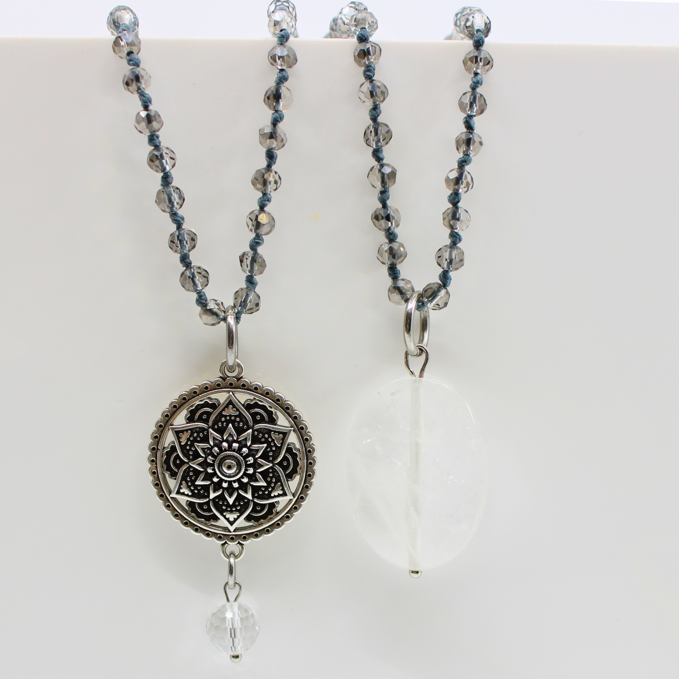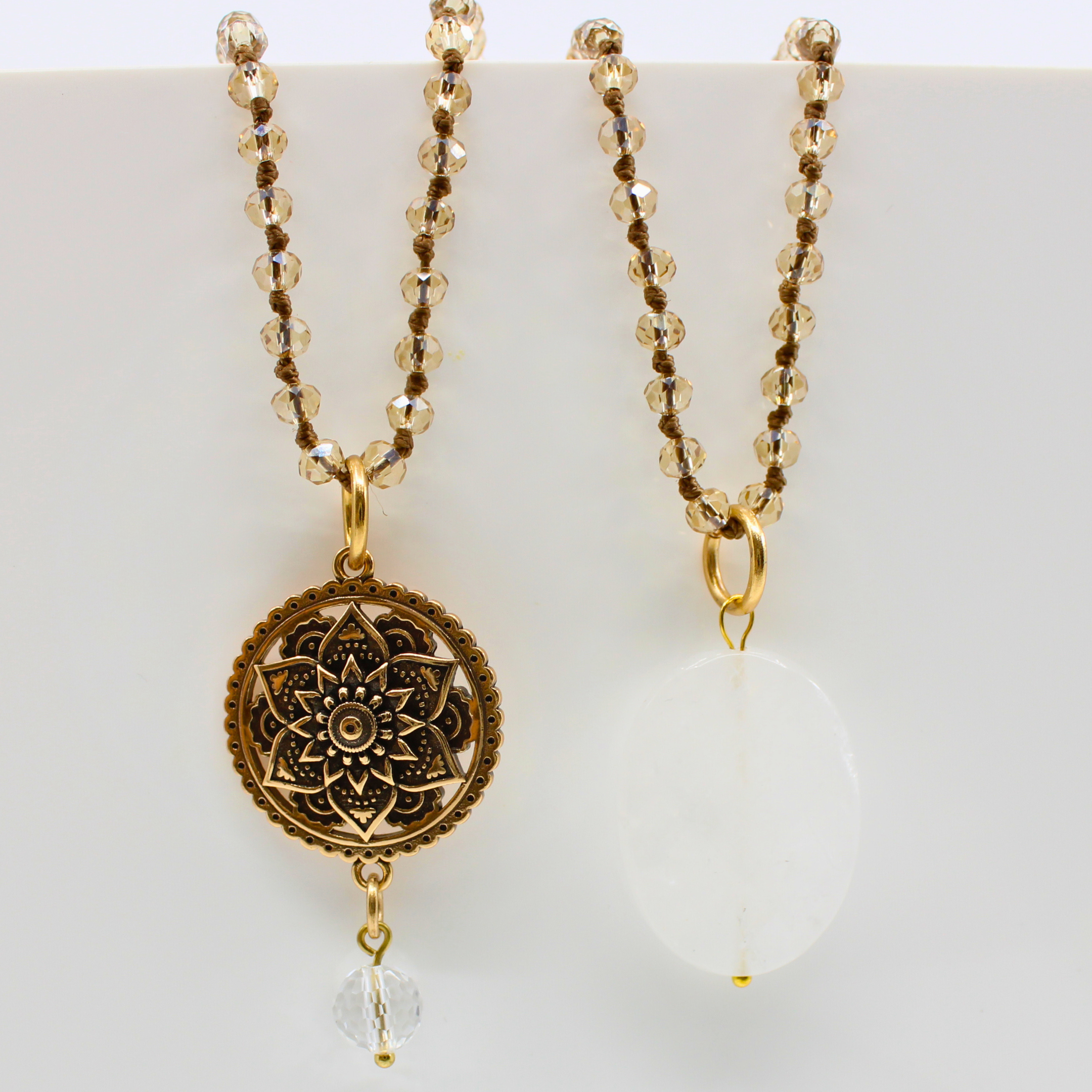 Original crystal bead necklace with 3D mandala pendant; message inscribed on reverse.