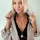 Original Necklace Full Length: 44-50" **MODELS NECK MEASURES 15" IN CIRCUMFERENCE. PLEASE NOTE THAT NECKLACES MAY LAY DIFFERENTLY BASED ON YOUR MEASUREMENTS**