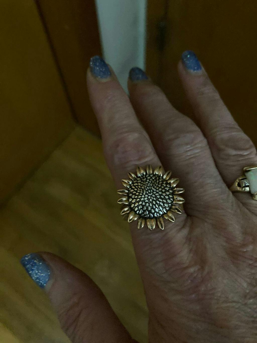 The INSPIRE Ring: a stunning piece that blends earthy, boho charm with a bold, nature-inspired design. Featuring a large sunflower with intricate detailing and a unique vintage gold and silver finish, this ring radiates warmth and positivity.