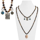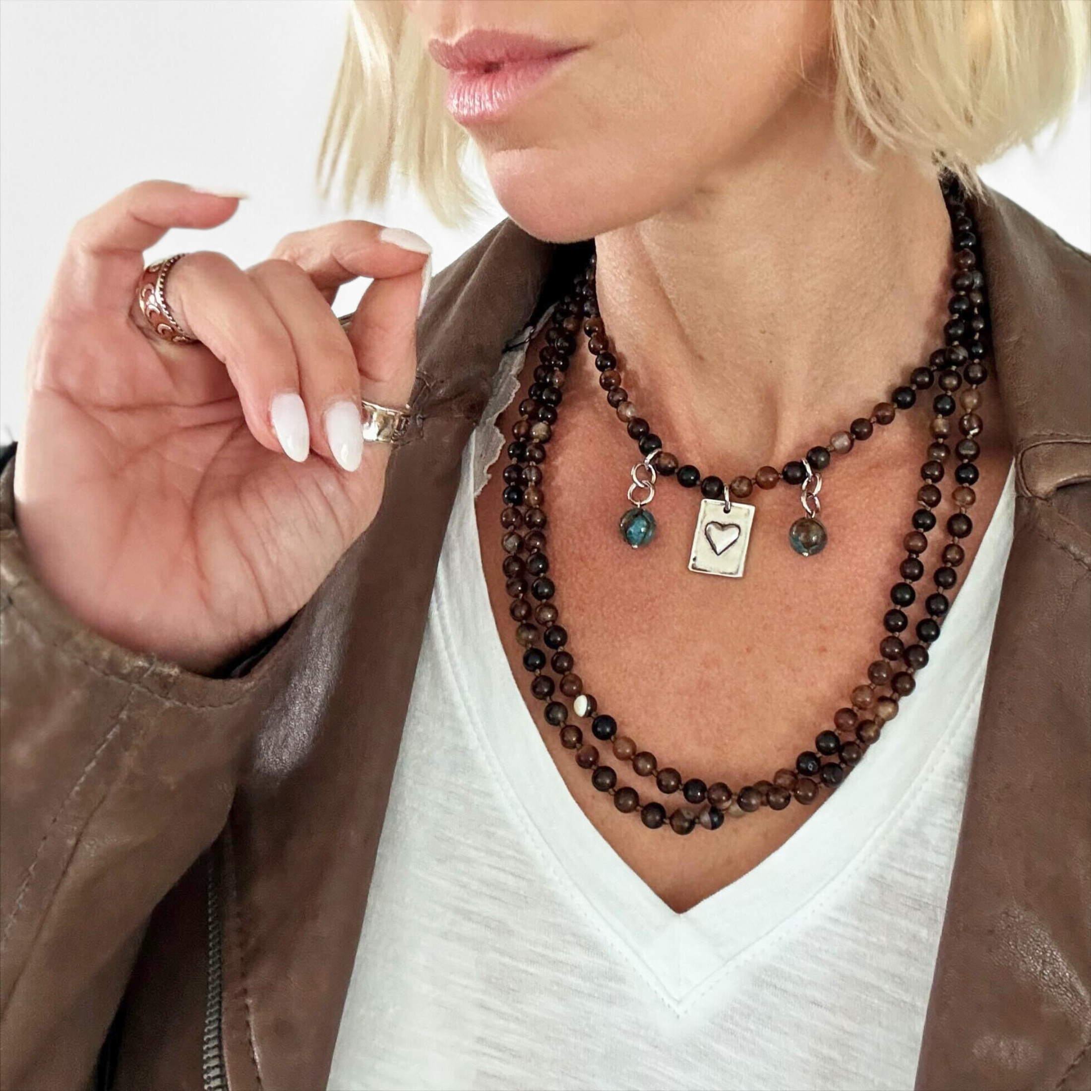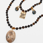 Brown striped agate bead long fusion necklace with magnesite stones, faceted sunstone and square heart-tag pendant; message inscribed on reverse.