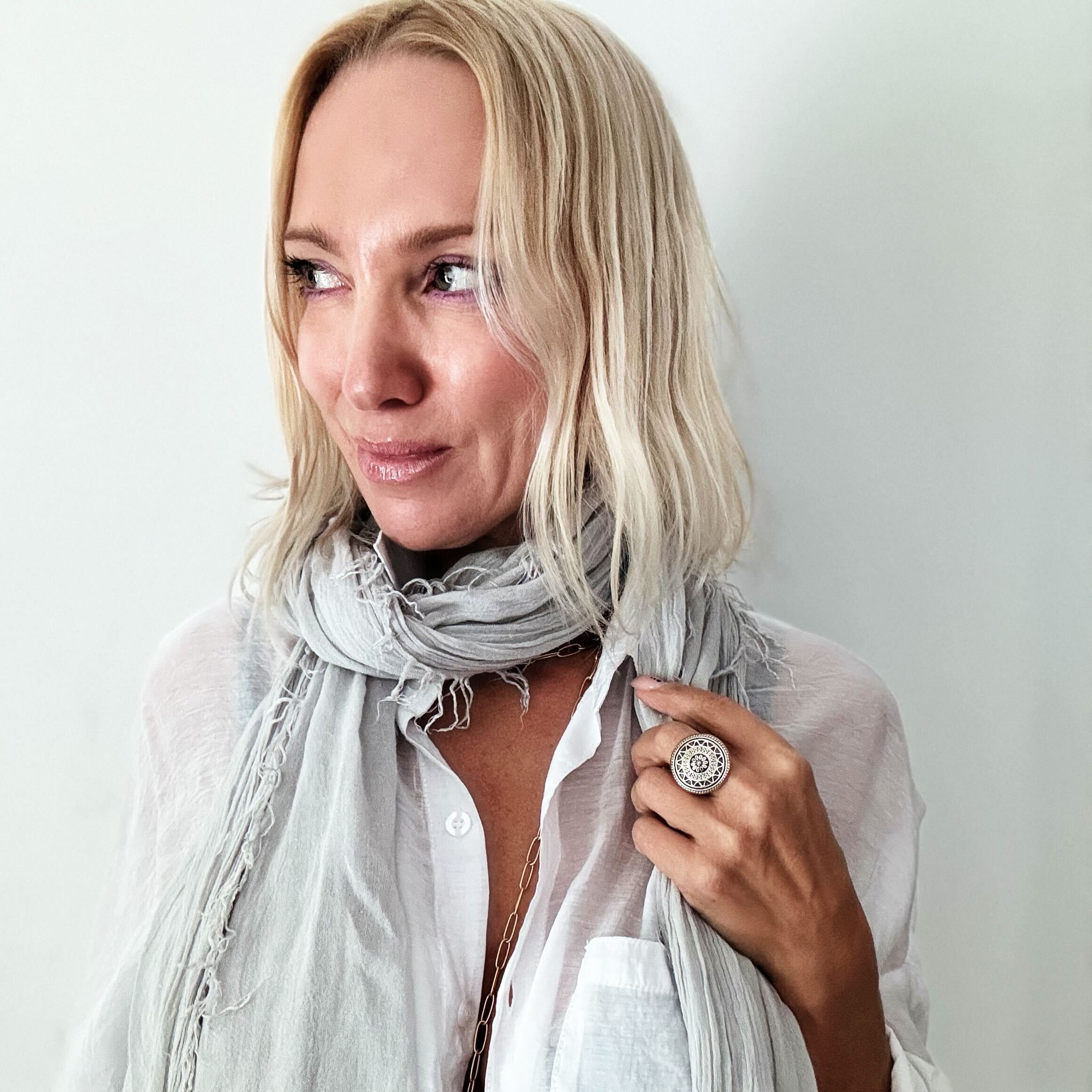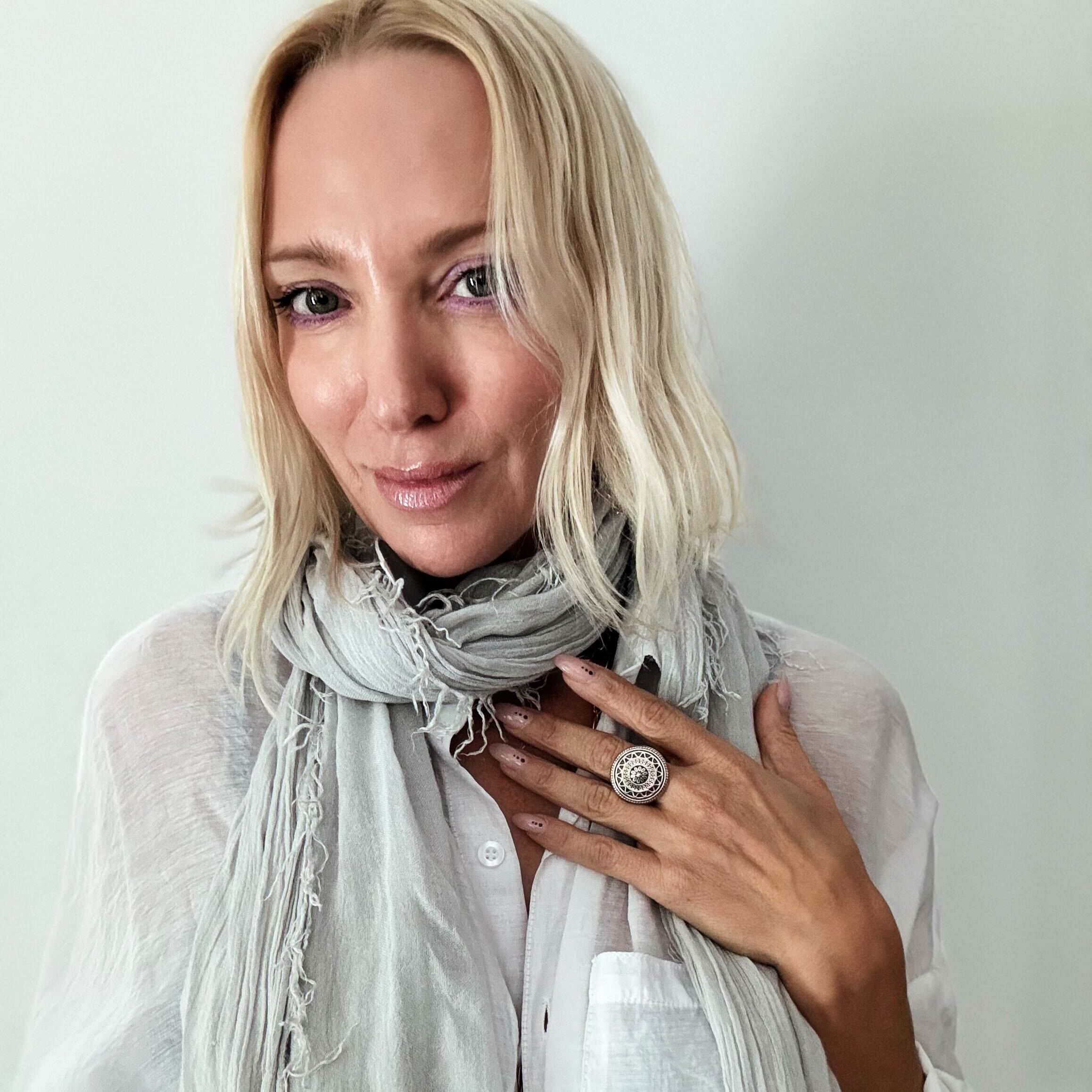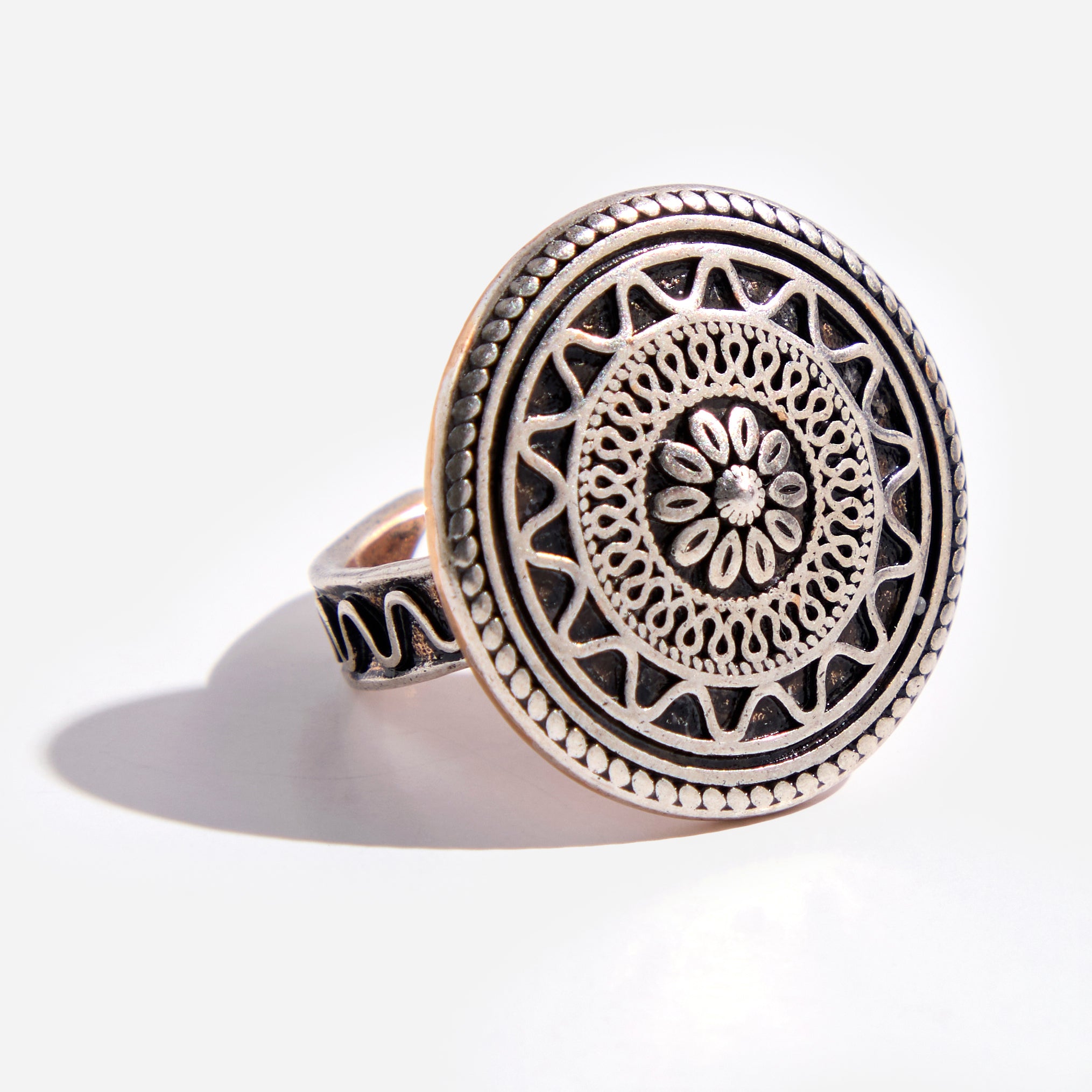 The INSPIRE Ring: This design gives off a serene and balanced energy, with a blend of organic floral and geometric design elements that creates a vibe that is both calming and artistic, perfect for those seeking pieces that resonates with both style and inner peace. The flower at the center symbolizes growth and connection, while the surrounding geodesic details add a structured, yet artistic flair, making it a perfect blend of spiritual and boho-chic styles.