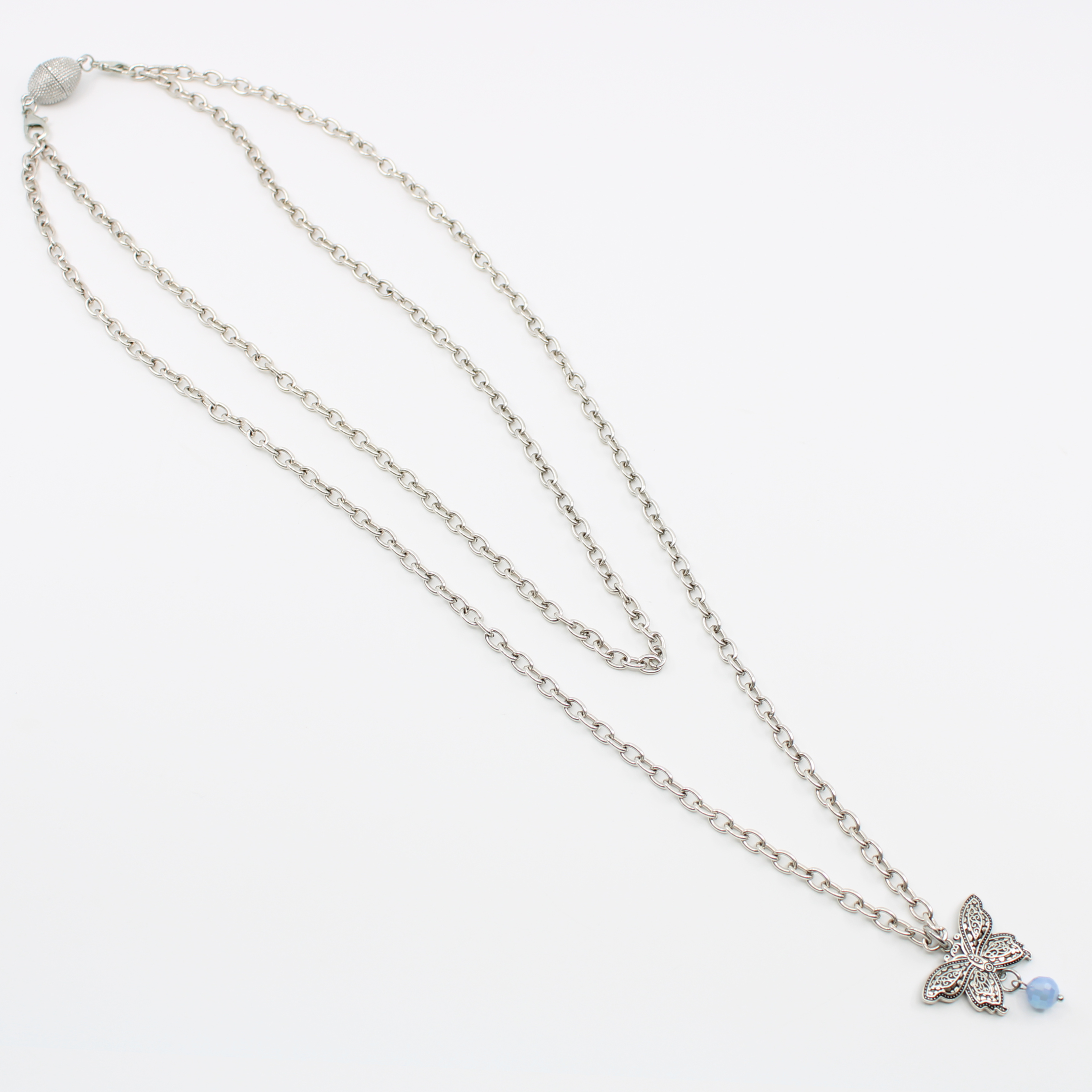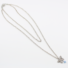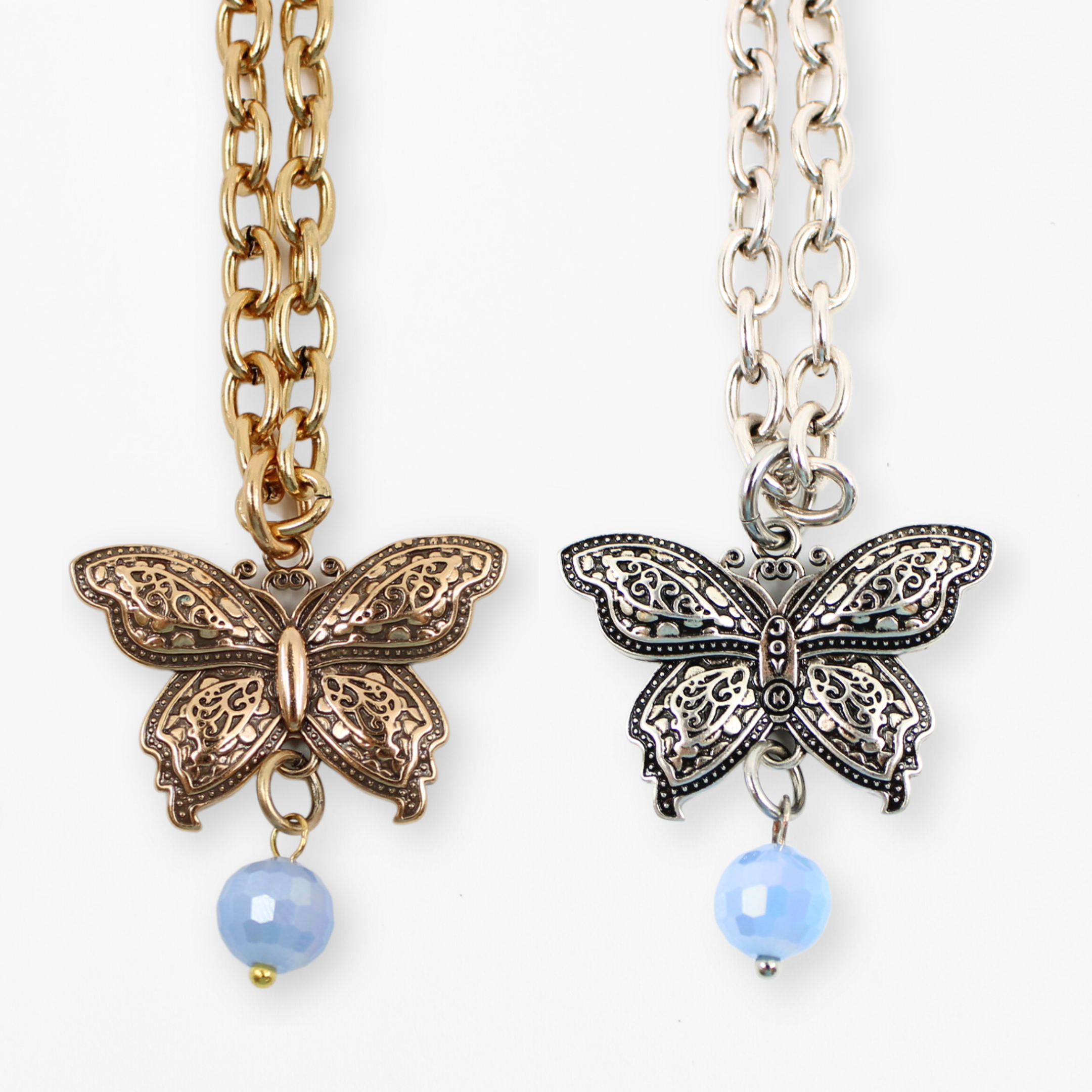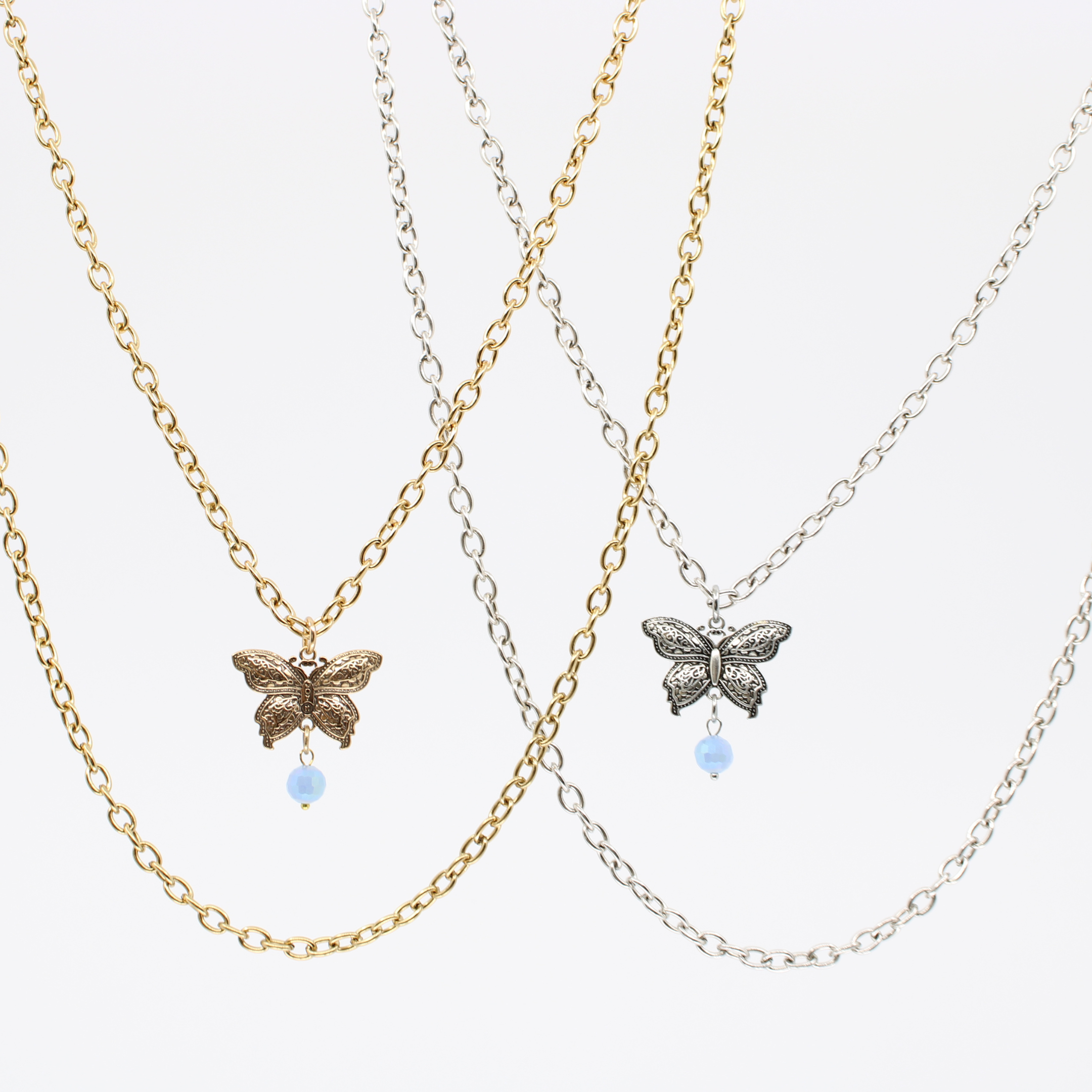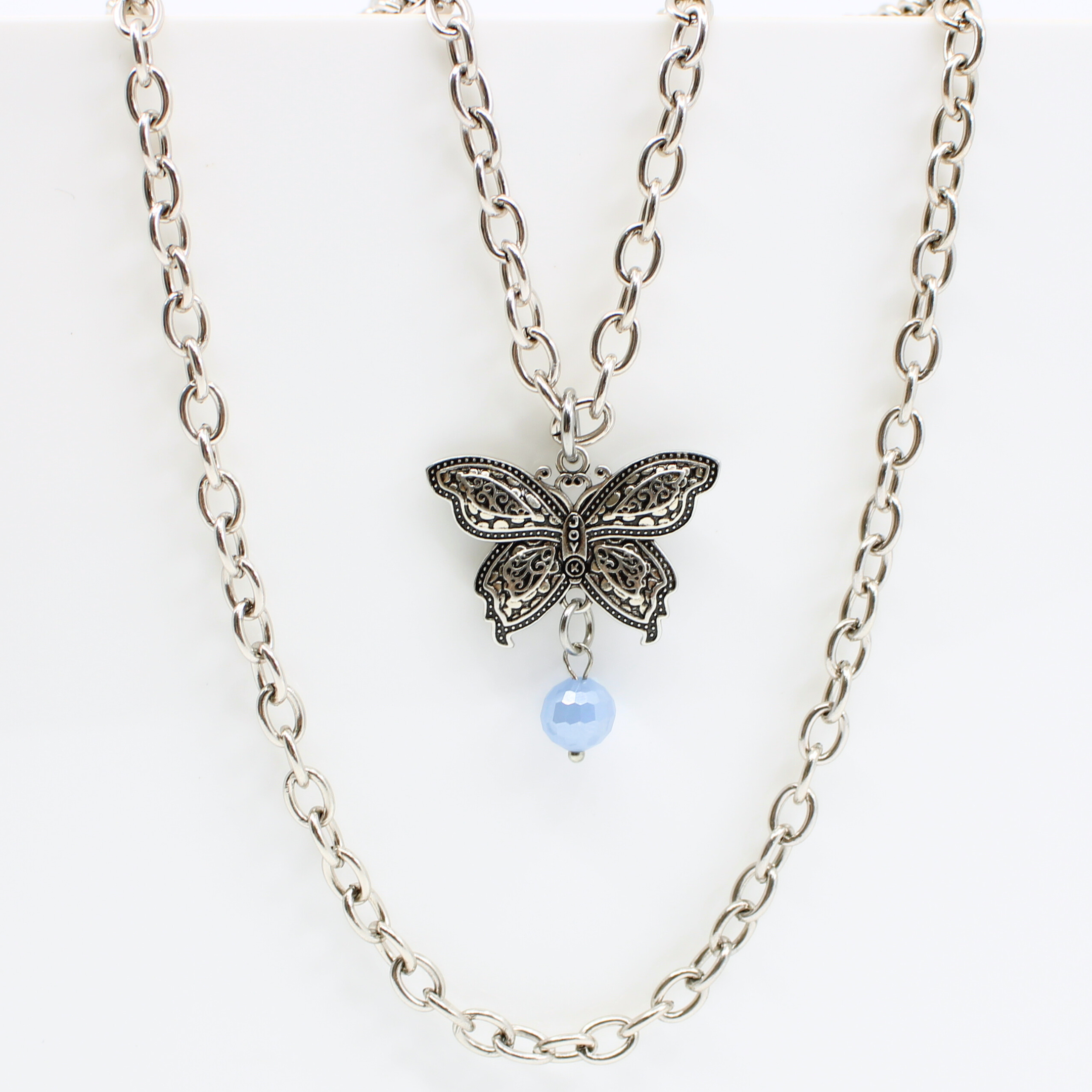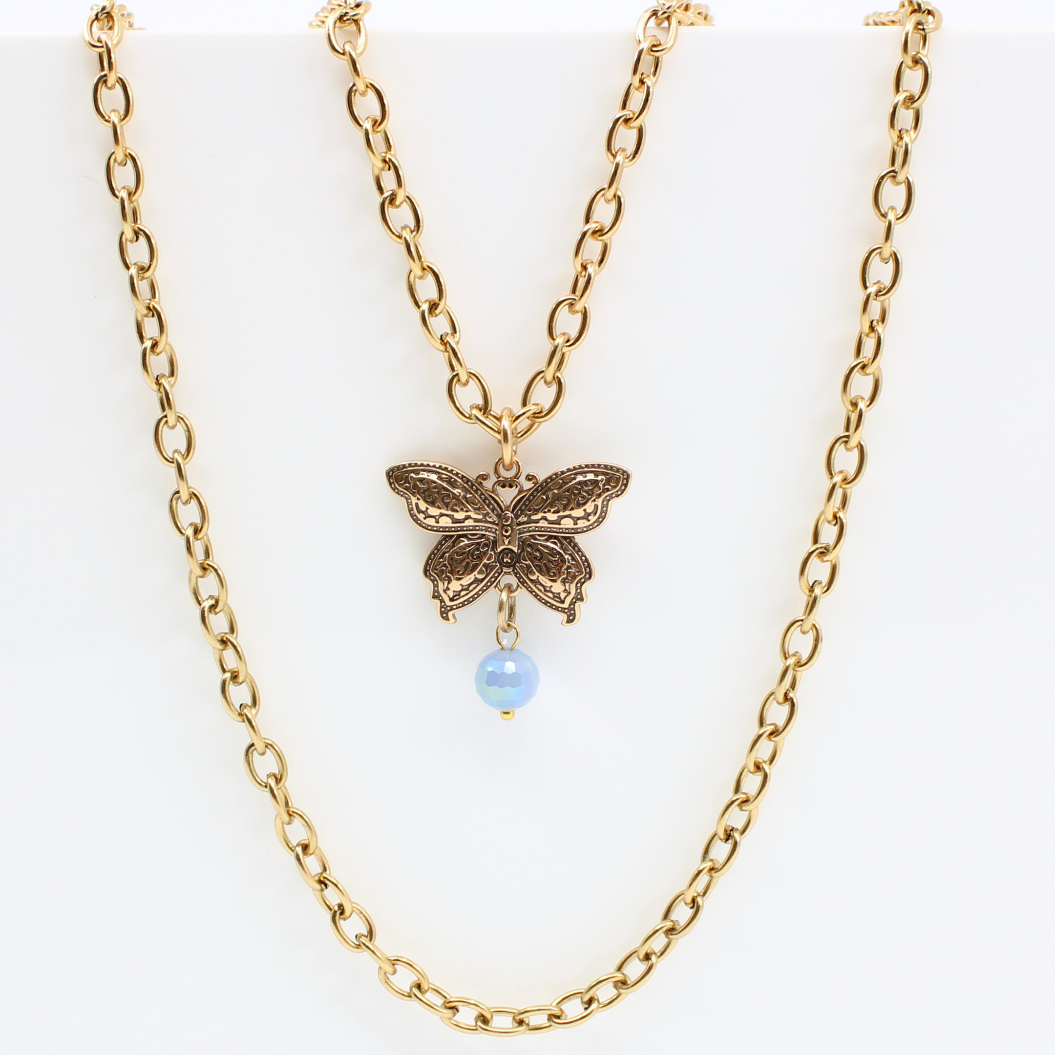 Essential chain necklace with 3D butterfly pendant; message inscribed one side; accented by a faceted periwinkle-blue crystal.