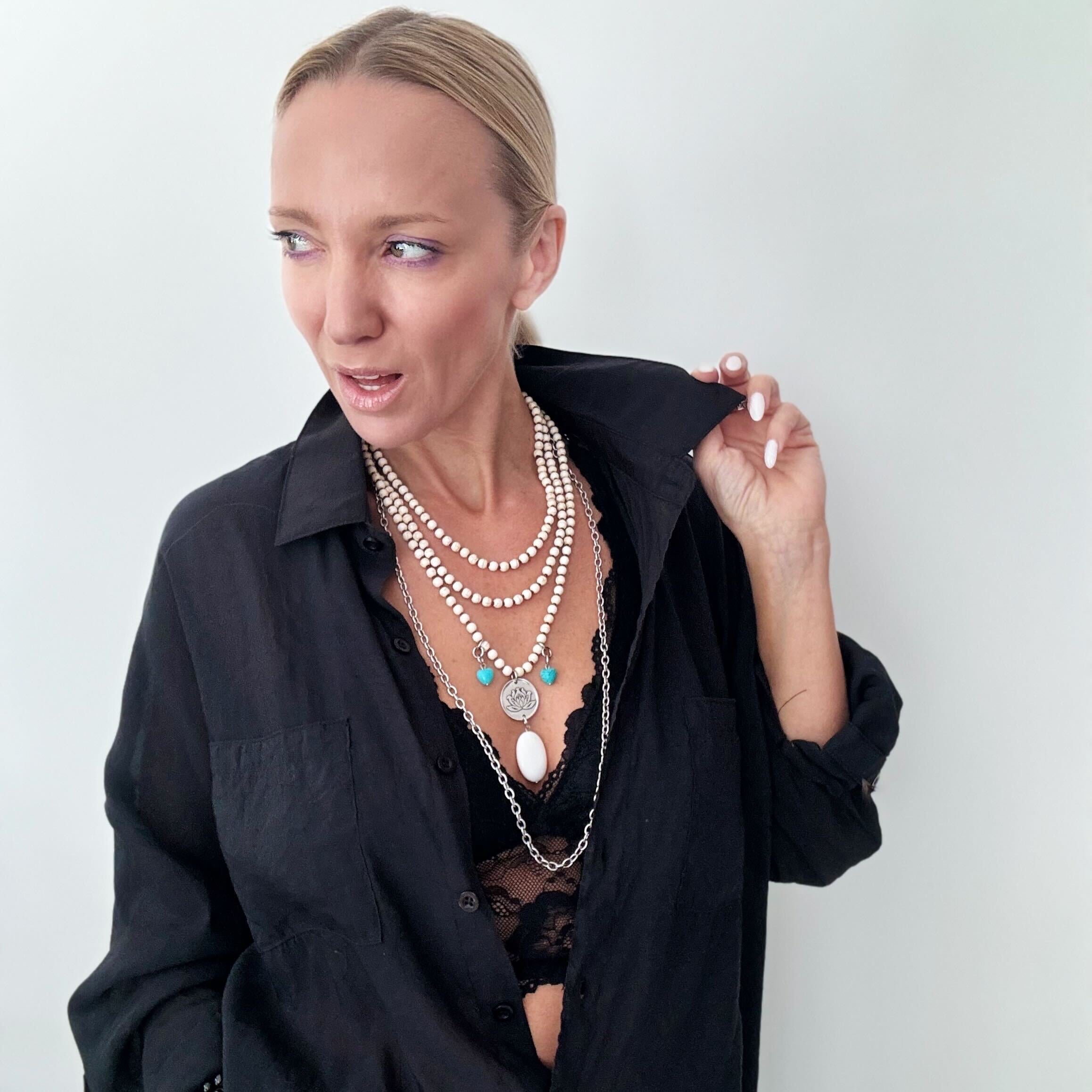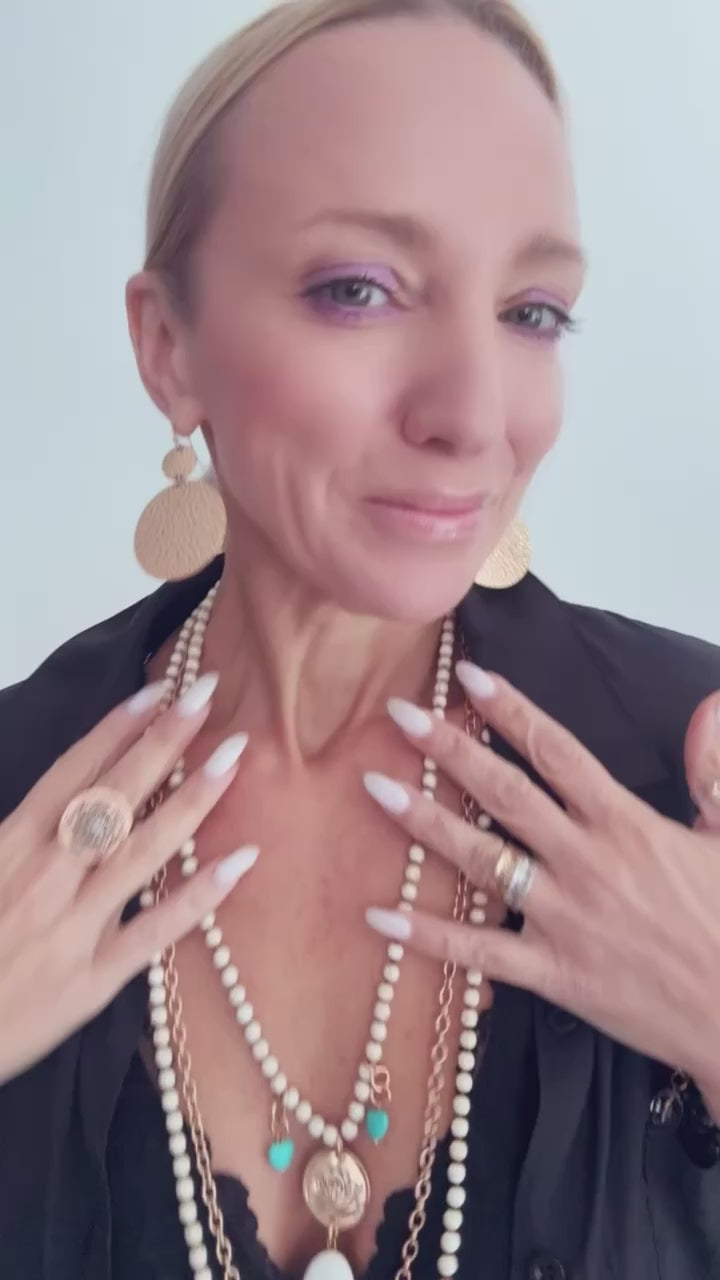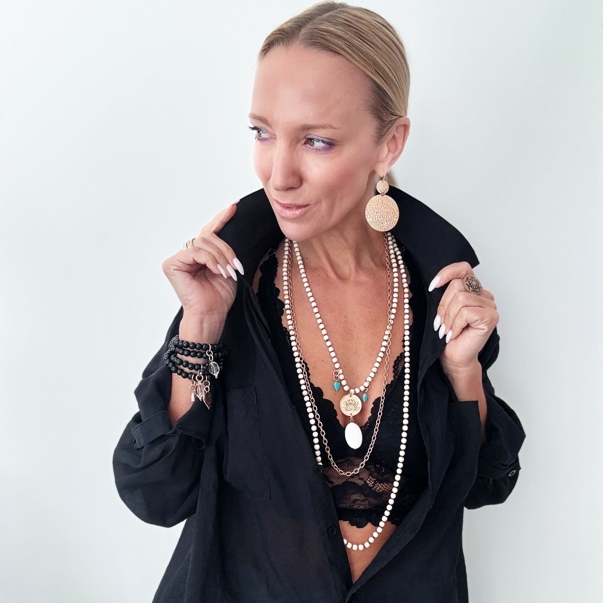 Long Fusion Full Length: 55-62" **MODELS NECK MEASURES 15" IN CIRCUMFERENCE. PLEASE NOTE THAT NECKLACES MAY LAY DIFFERENTLY BASED ON YOUR MEASUREMENTS**