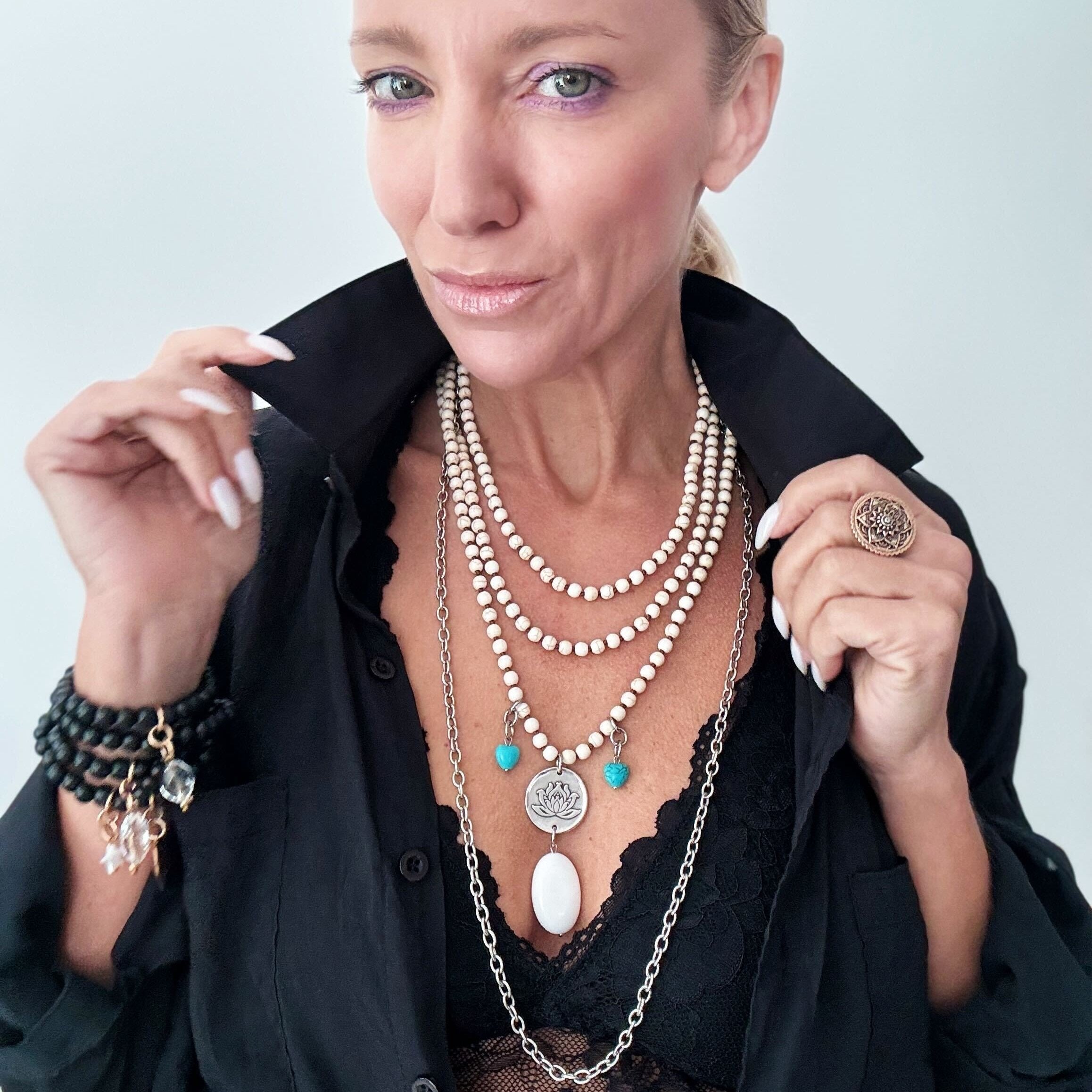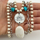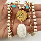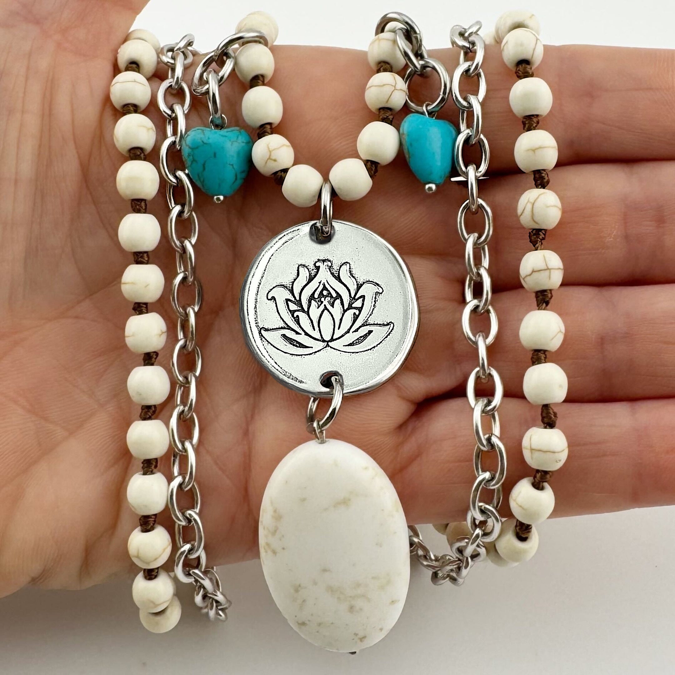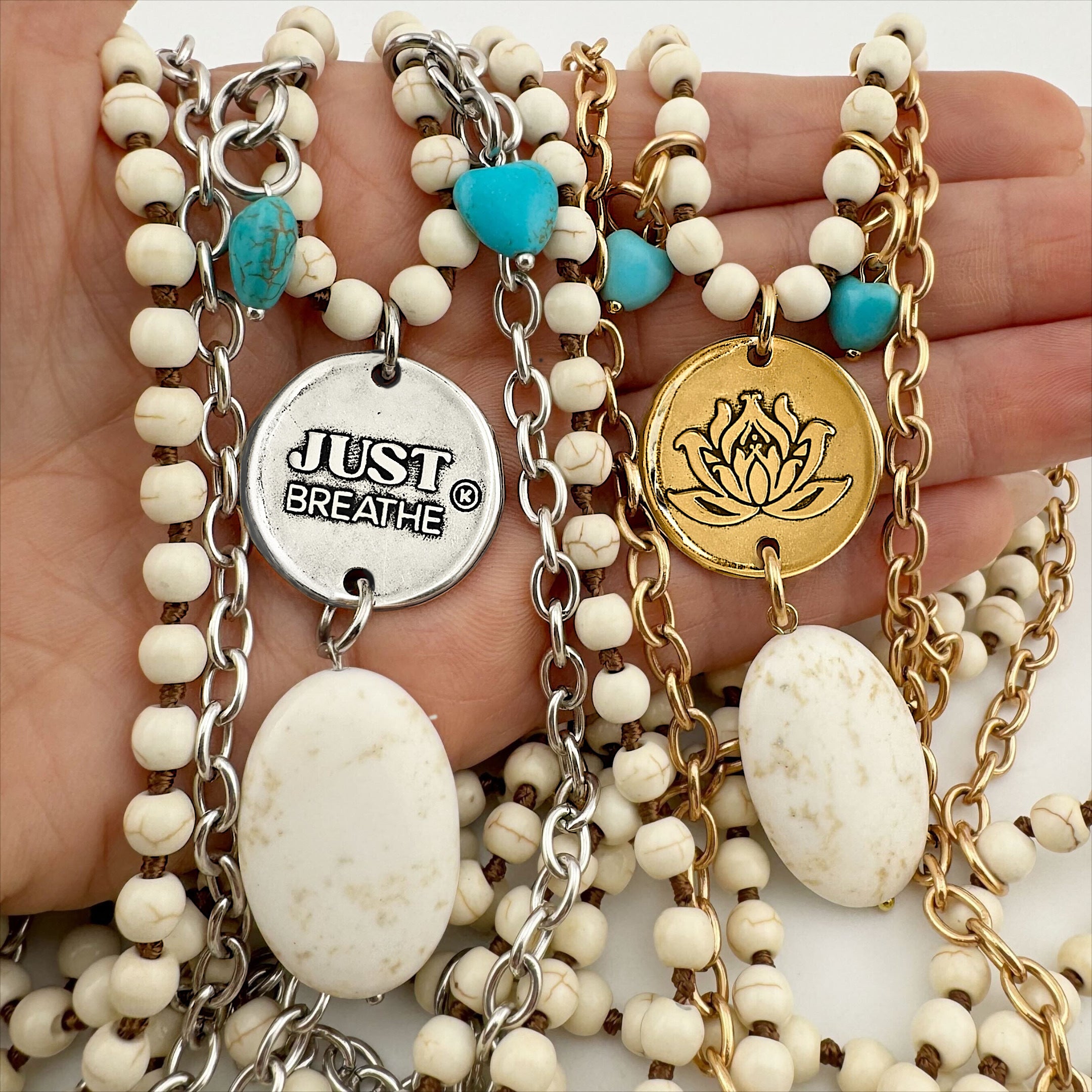 - Accompanied by a 20mm off-white howlite stone and 2 blue howlite heart accents