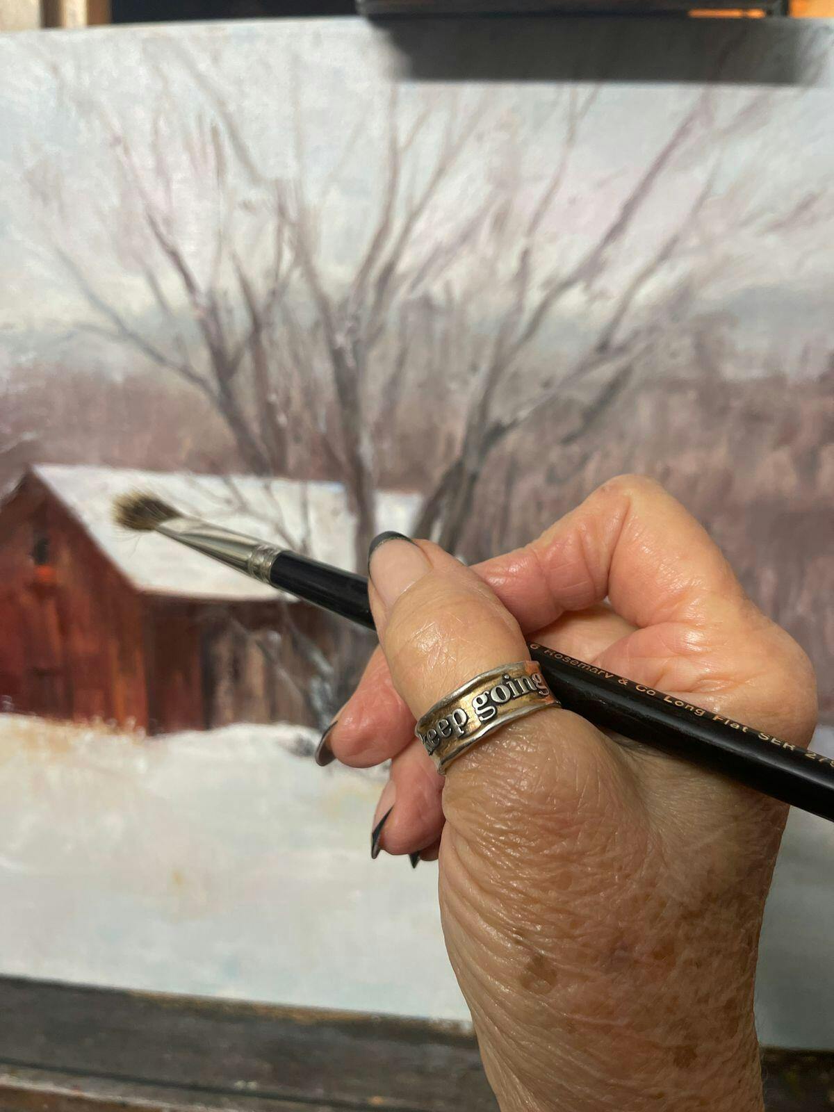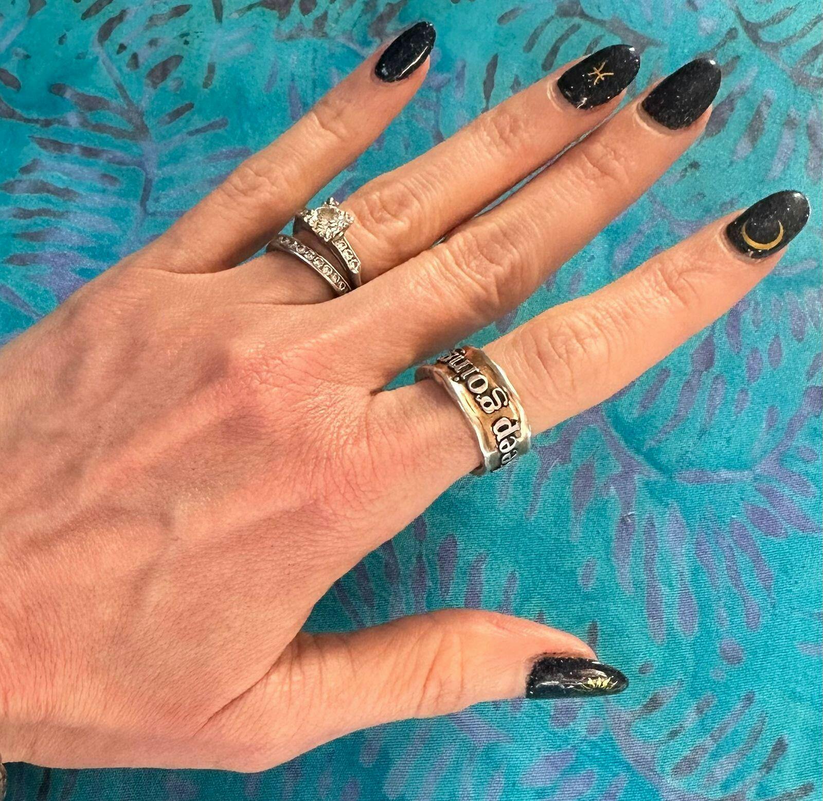 The Remember Ring was created from a prototype designed during the beginning years of Katia Designs. Wearing the ring on her thumb (although you can wear it on any finger you'd prefer) she would catch a glimpse of the message as her hands rested on the steering wheel while she was driving. It was a moment for her to take a breath and remember those simple words she chose for herself.
