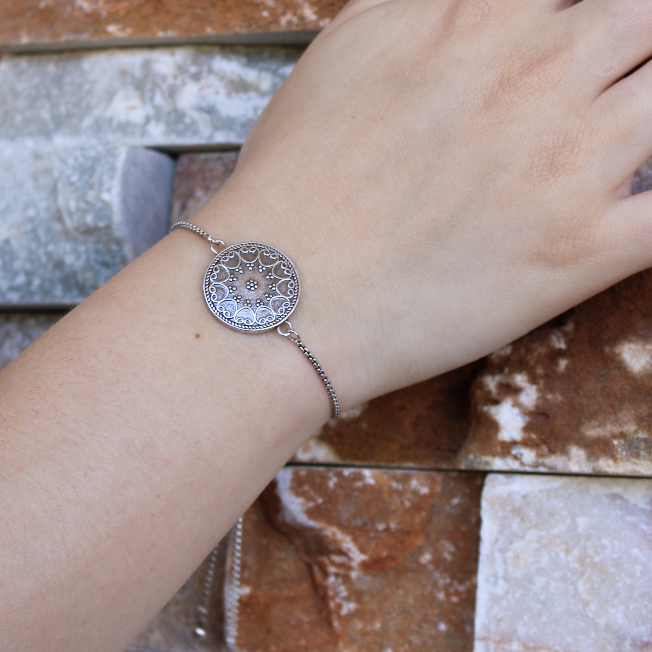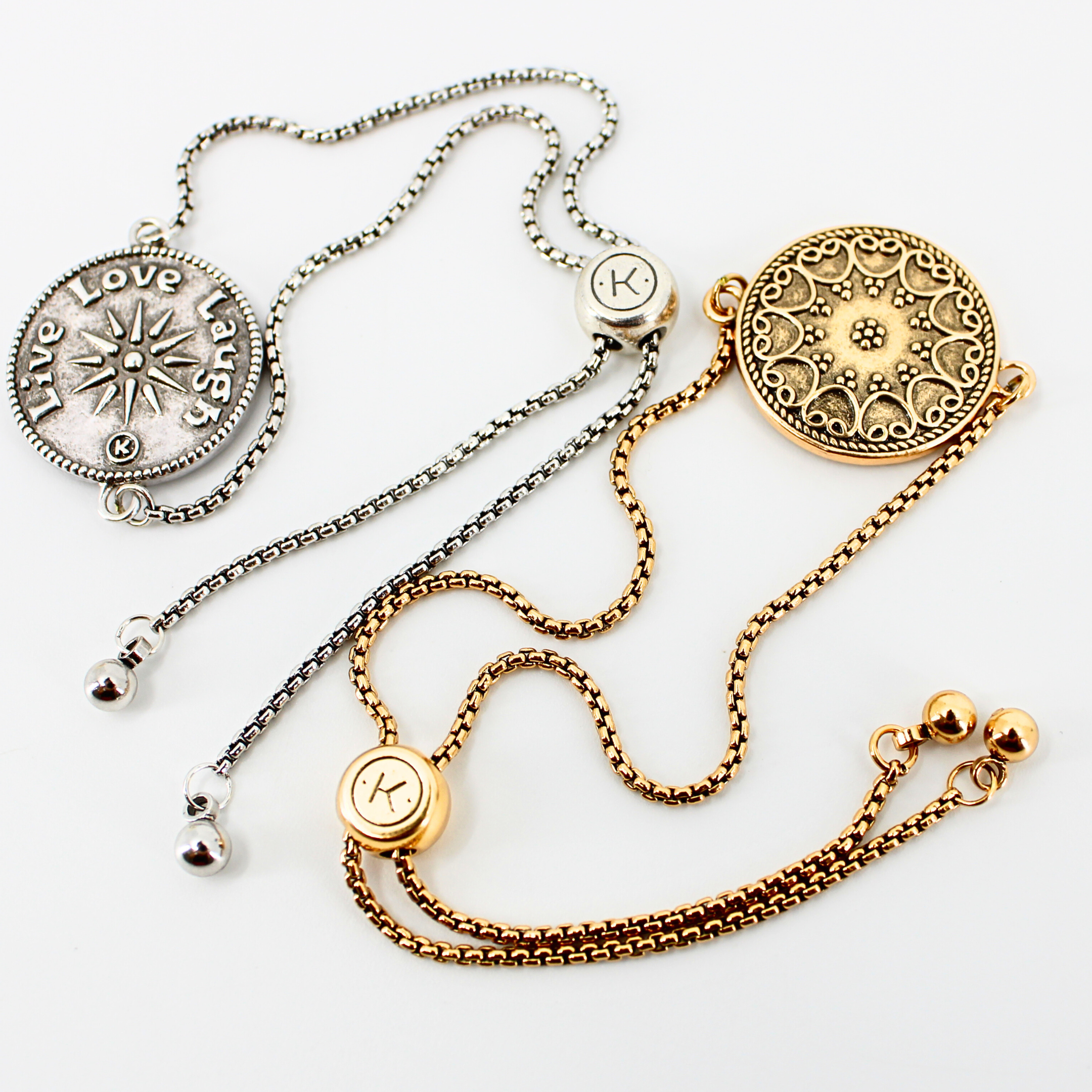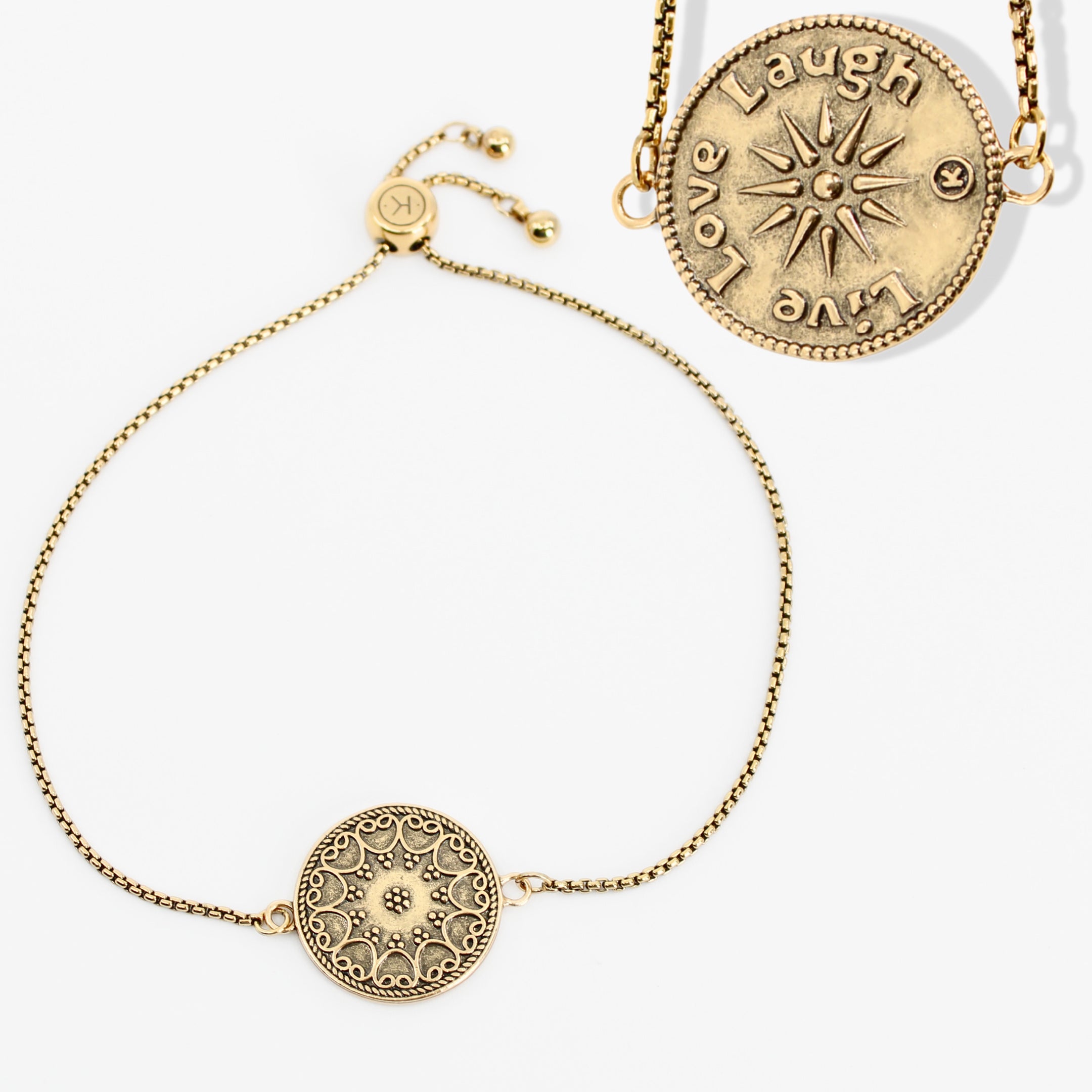 Let joy be your guide. This ornate bracelet features a floral mandala design on the front and the timeless mantra Live. Laugh. Love. inscribed on the reverse. A gentle reminder to lead with your heart and find beauty in the everyday.