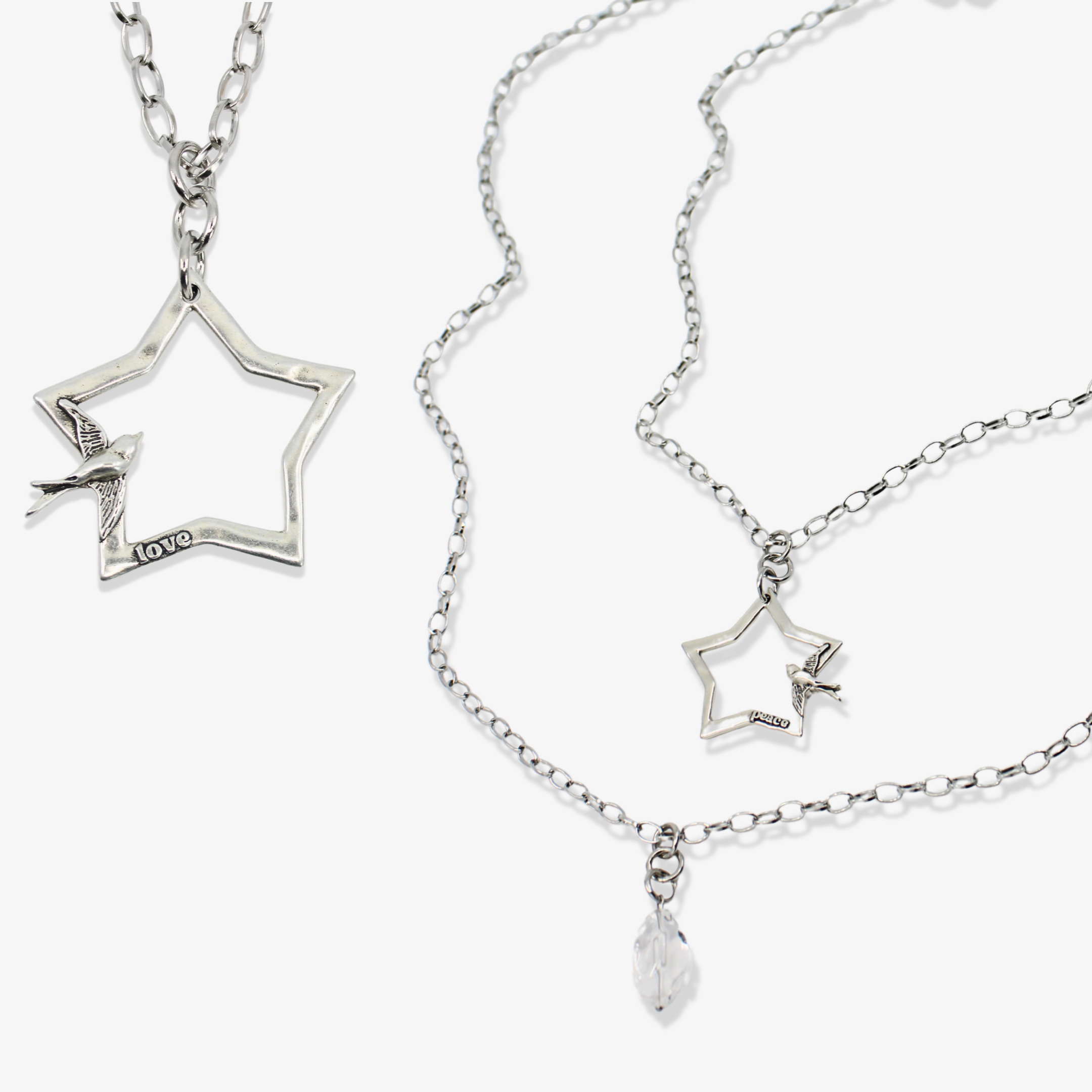 A symbol of serenity and spirit, this 48" stainless steel chain features a double-sided star pendant—engraved with Peace on one side and Love on the other—anchored by a graceful bird at its center. Paired with a crystal quartz drop for clarity and balance.