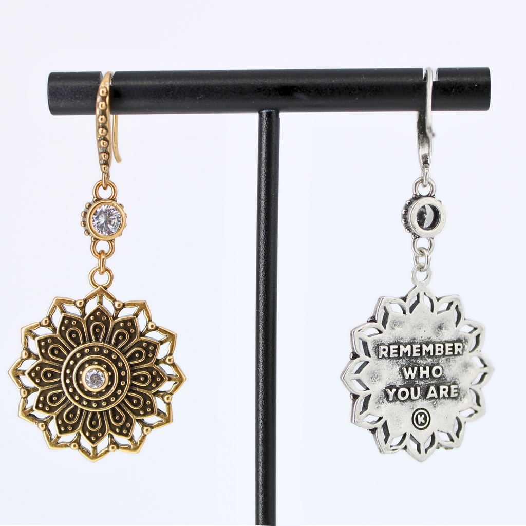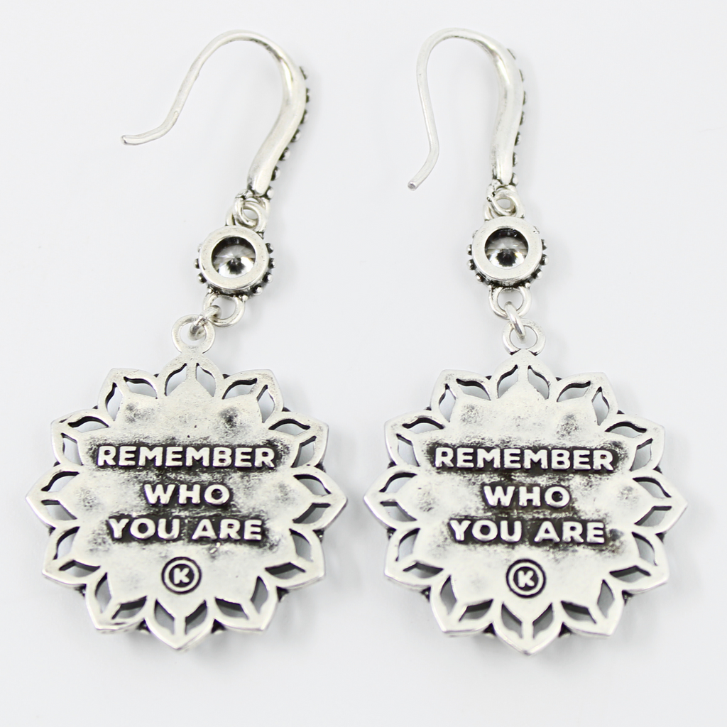 A wearable mantra for your highest self. These statement drop earrings feature a geometric flower mandala pendant inlaid with a shimmering crystal and inscribed with the powerful reminder:Â Remember Who You Are. Finished with a decorative French wire and crystal accent, theyâre designed to catch the lightâand your confidence.
