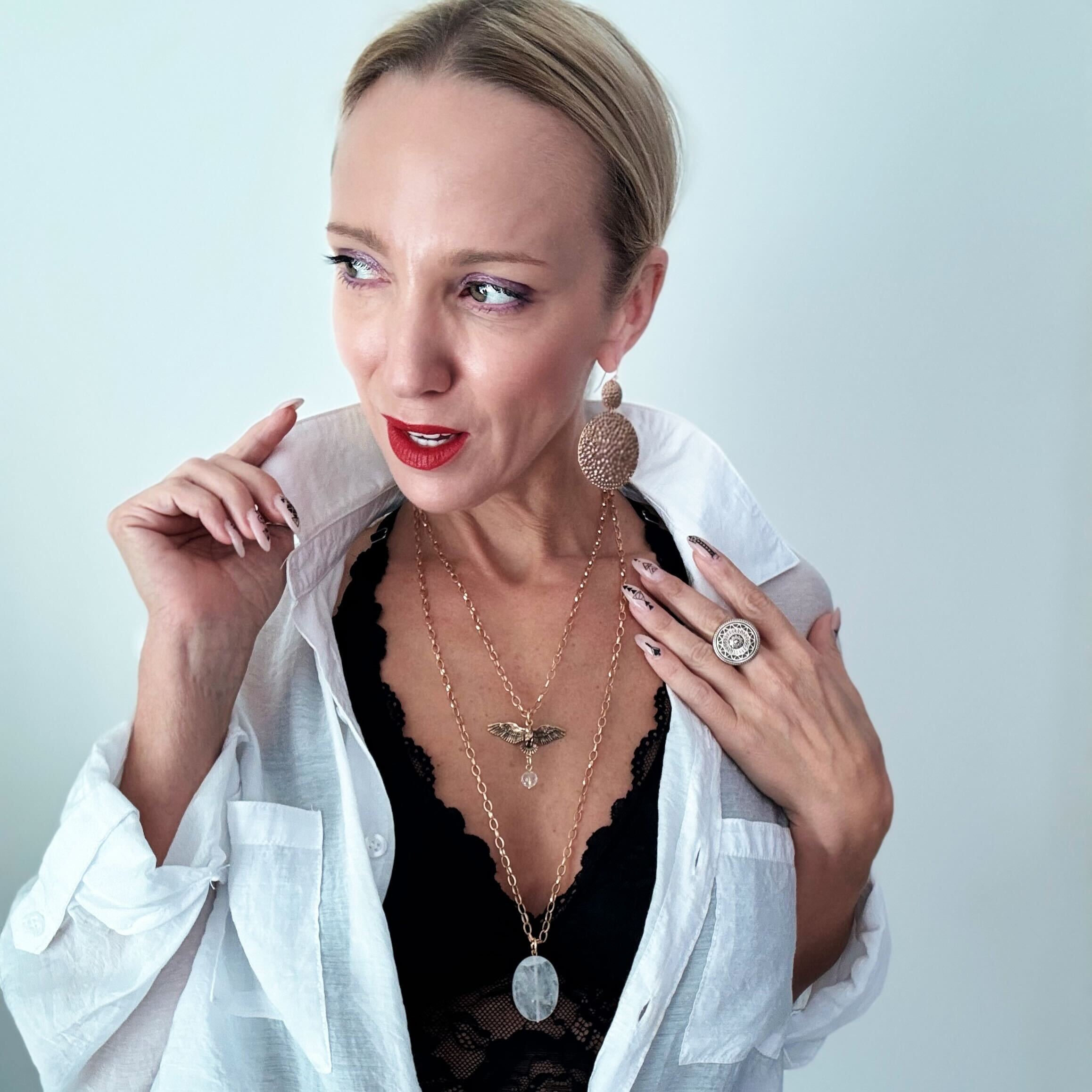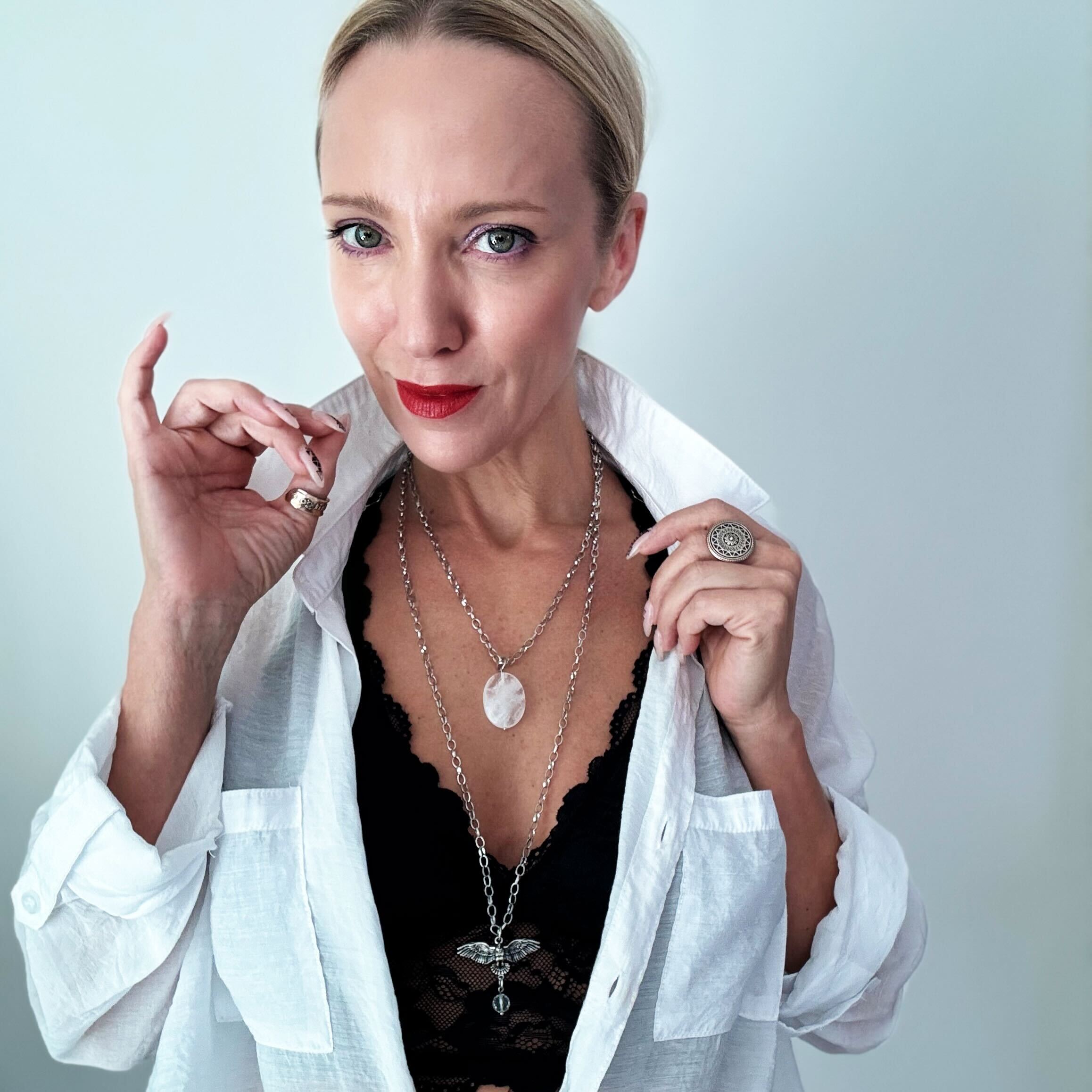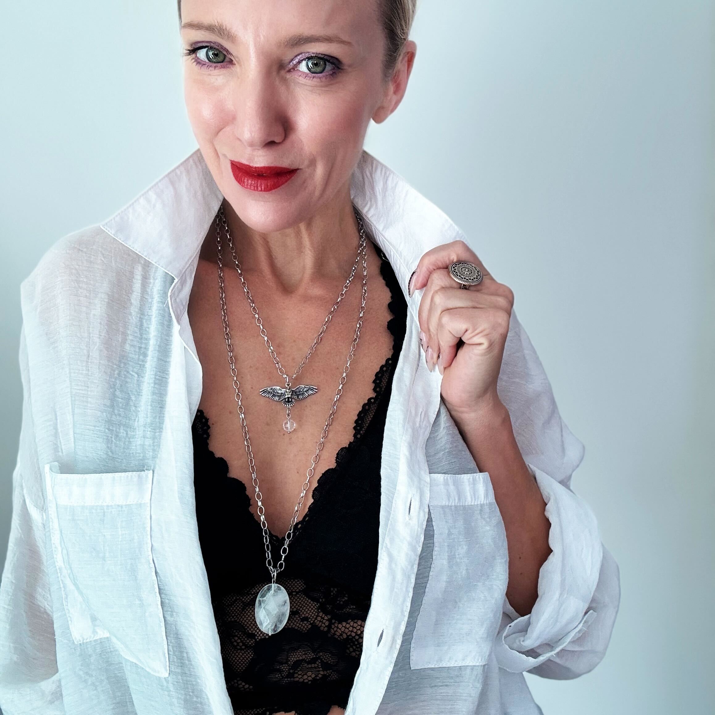 Katia loves to embrace all of the imperfections that occur when working with organic materials. Due to the crystals and crystal beads being an organic material, shape, clarity, and color vary and may have pits, cracks, and other marks that Mother Nature provided to add interest and beauty.