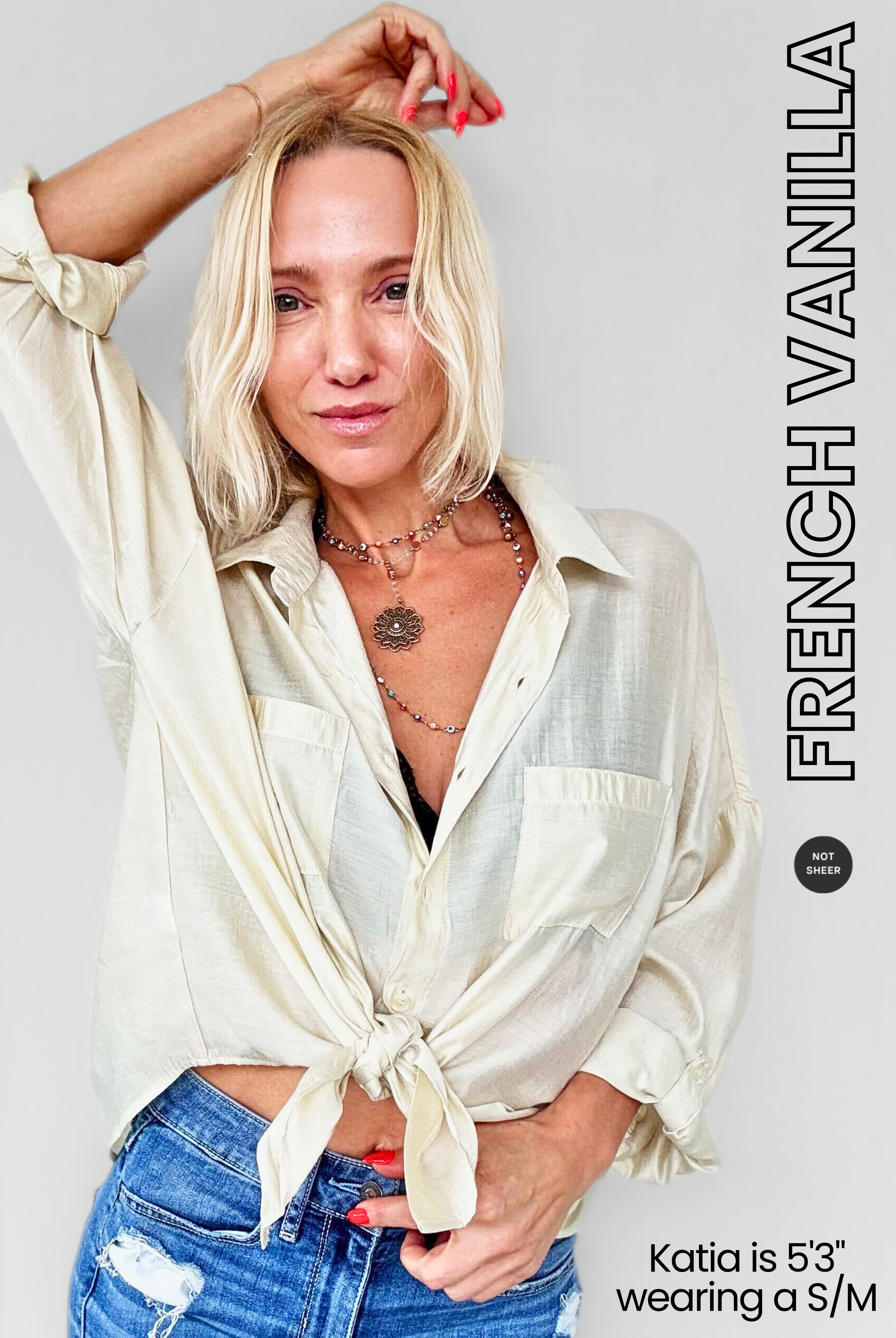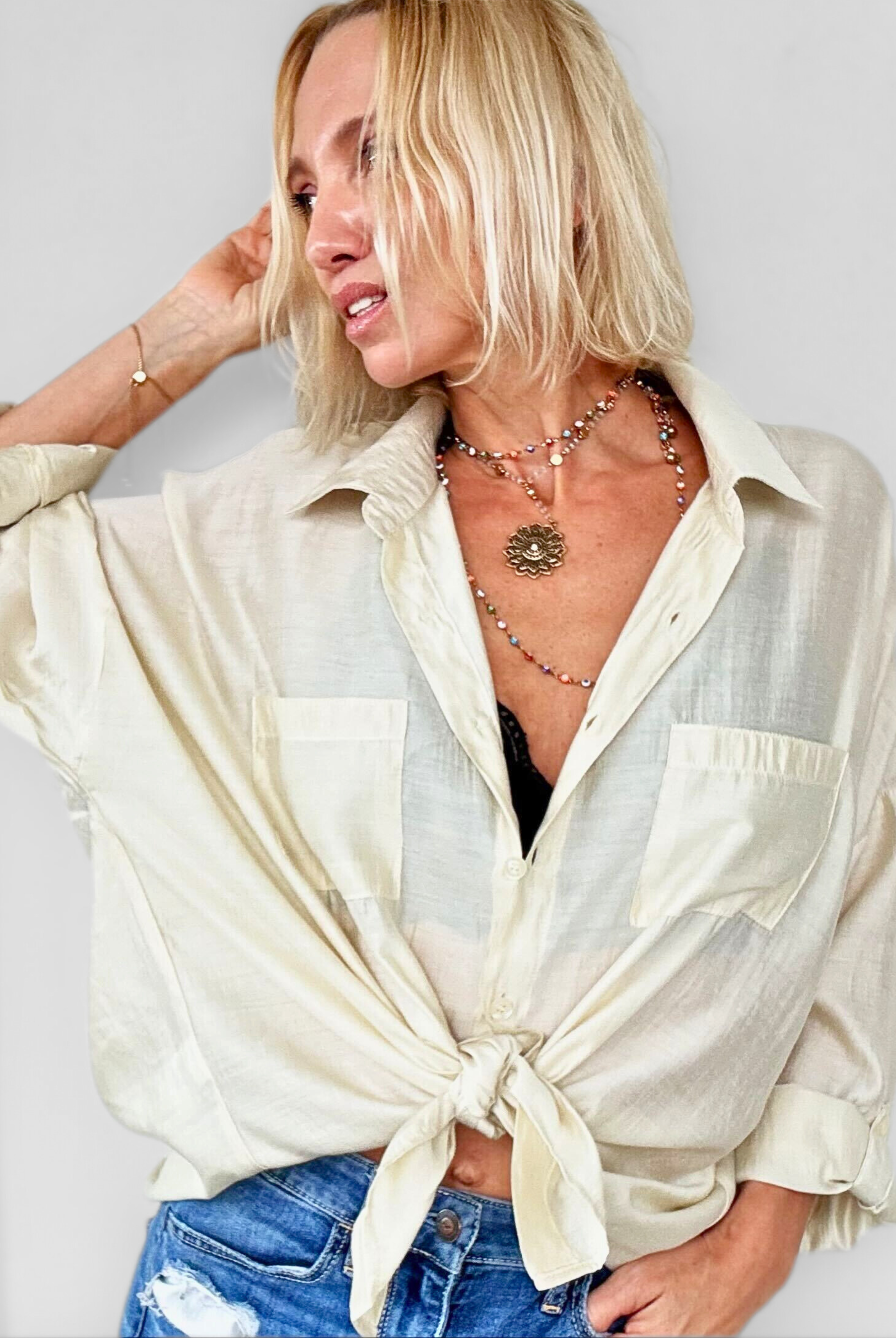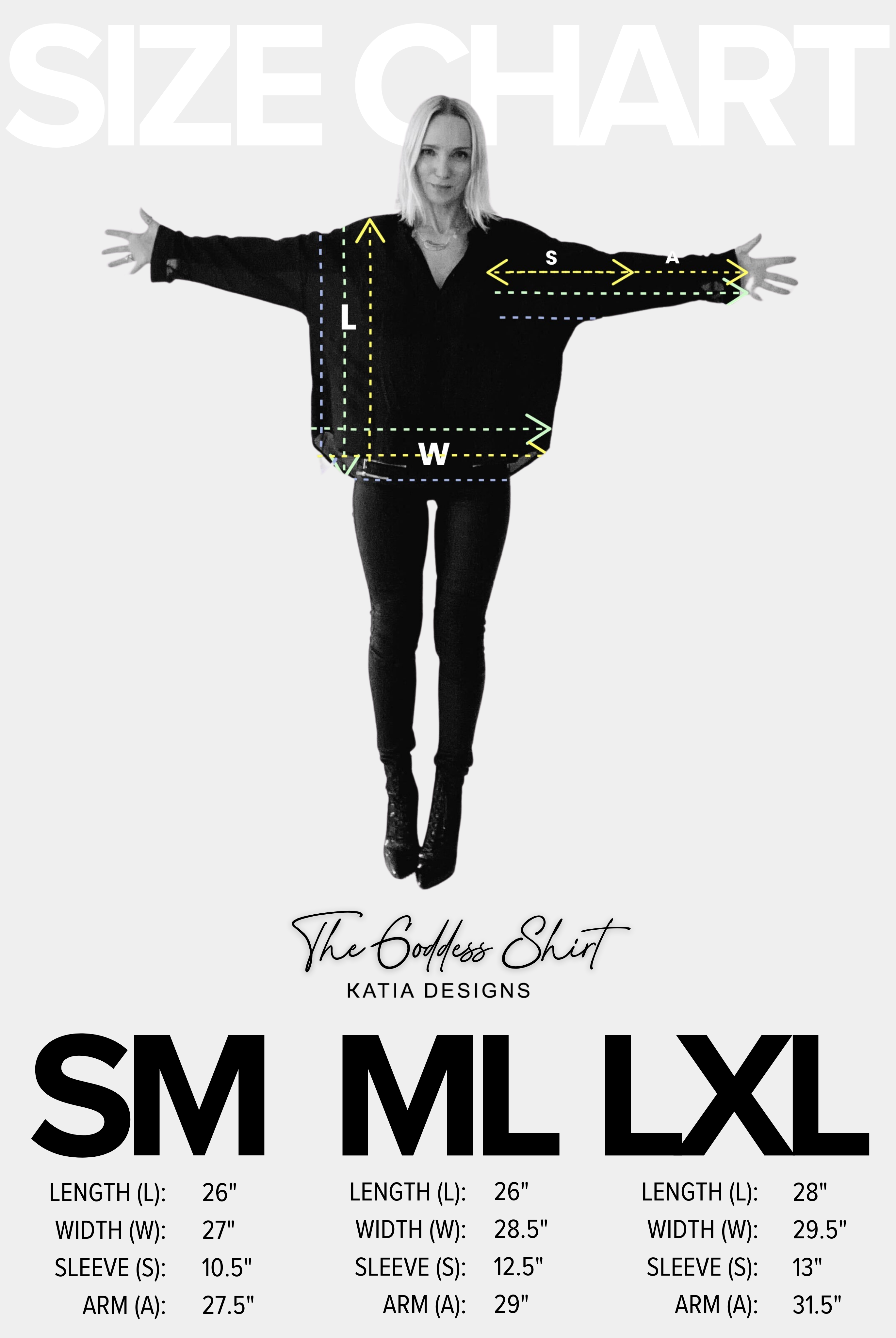 The Goddess Shirt is a classic, oversized button-down shirt made from 100% Viscose (looks like silk, feels like cotton)! With dropped shoulders and a slightly sheer style, this shirt epitomizes the Boho-Chic vibe. Wear it tucked in, untucked, or tied: just like our jewelry -- there are no rules! You do you, goddess!